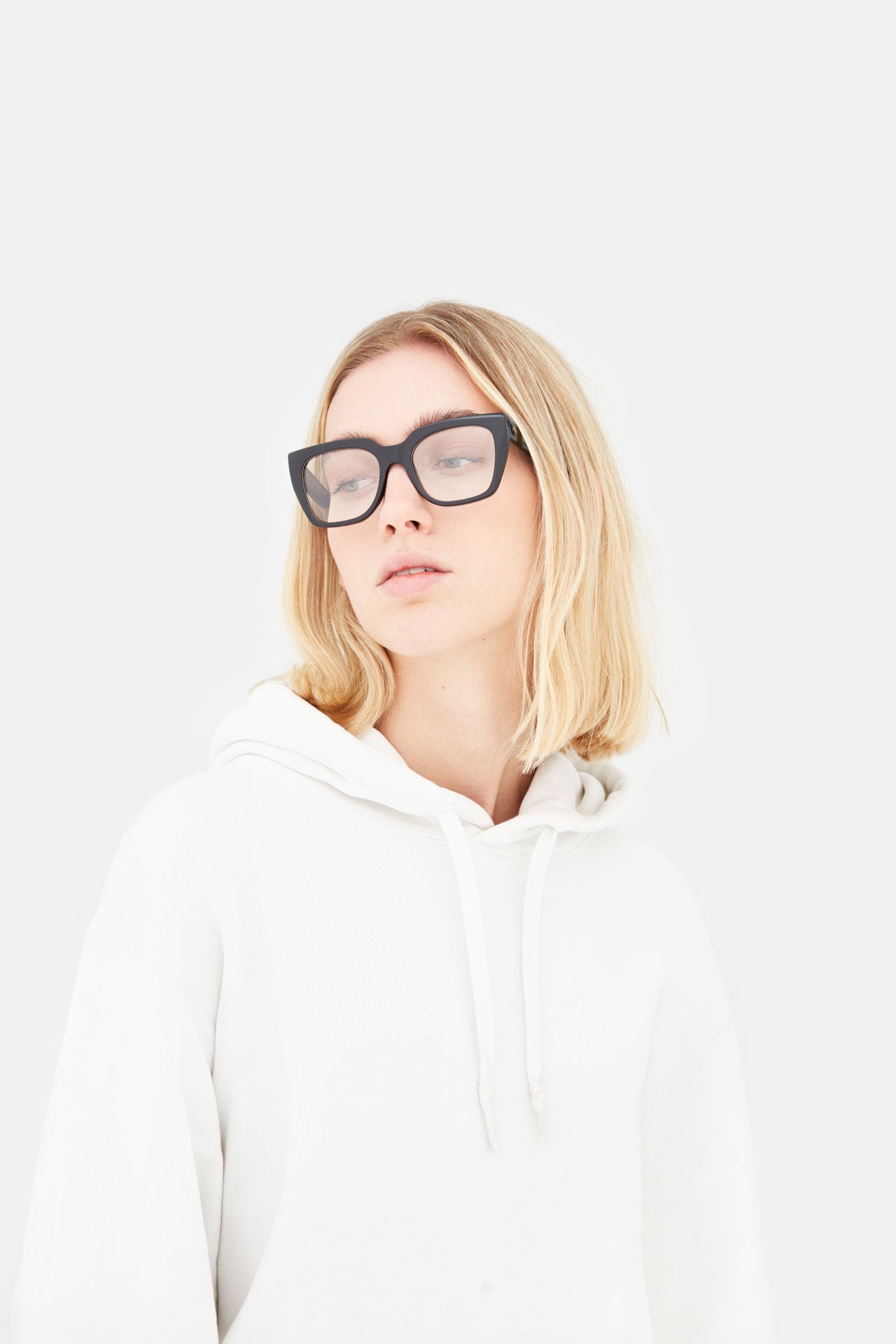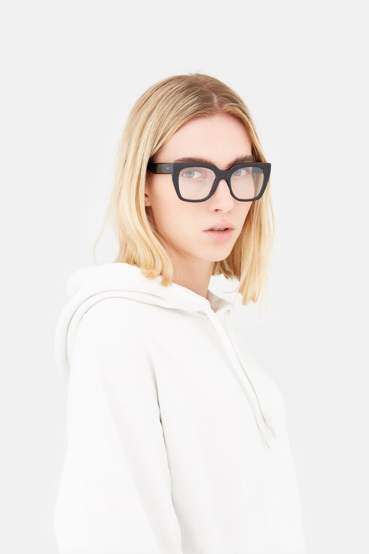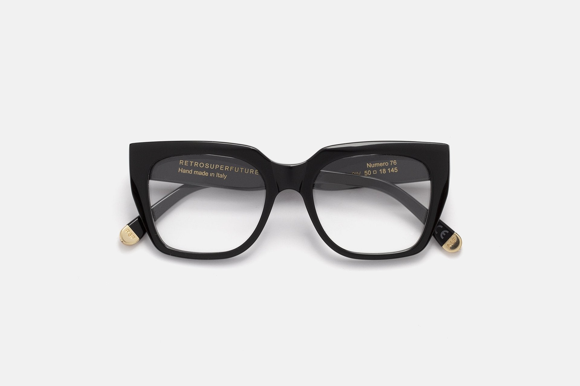 An everyday frame with a bold design, Numero 76 is an oversized silhouette interpreted with a contemporary aesthetic. The design features squared lenses and sleek acetate rims, carving on the frontal frame and around the edges to highlight its curves, decrease weight and ad extra comfort. This version comes in black acetate. Prescription lenses not included. The box contains a hard case and a cleaning cloth.
