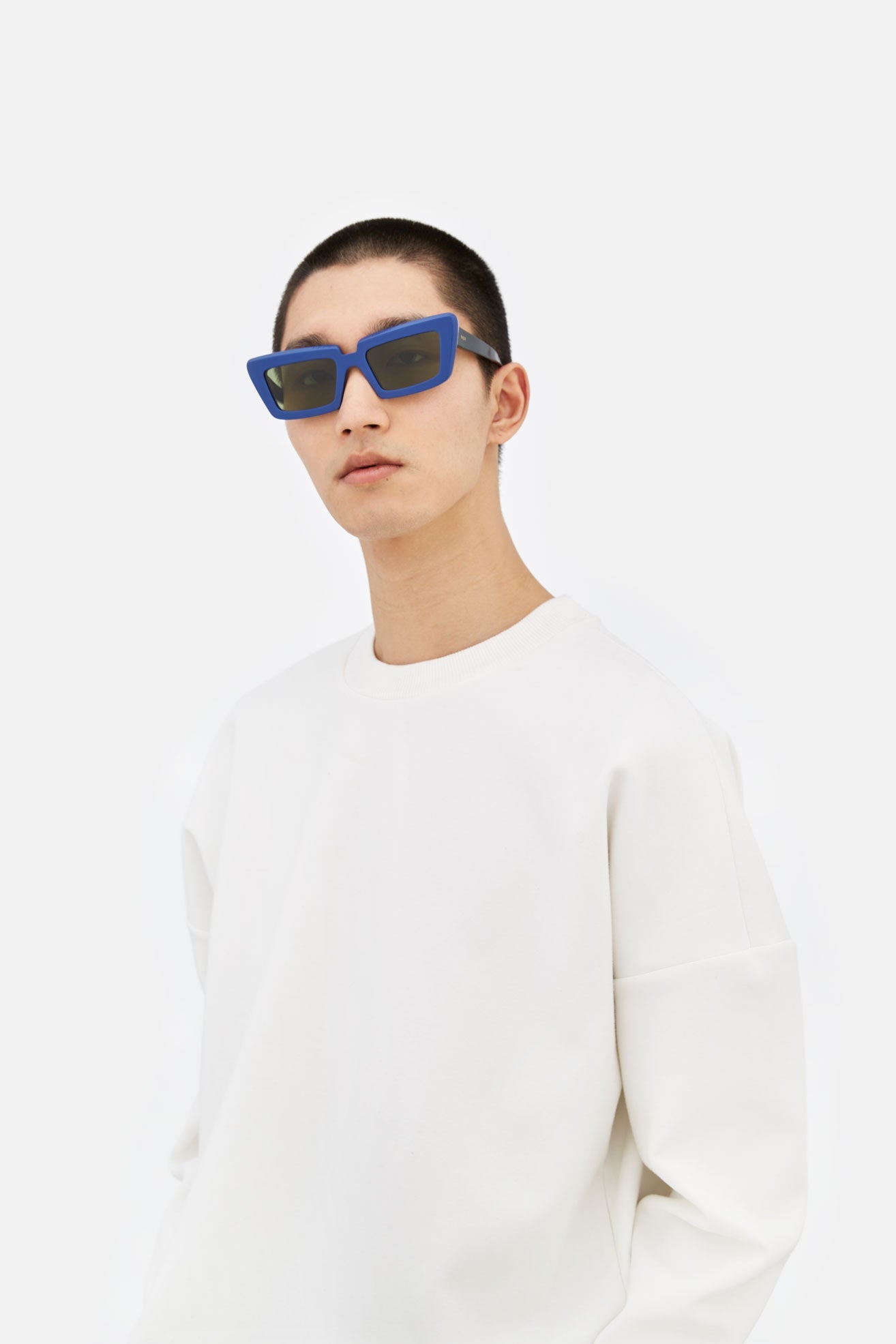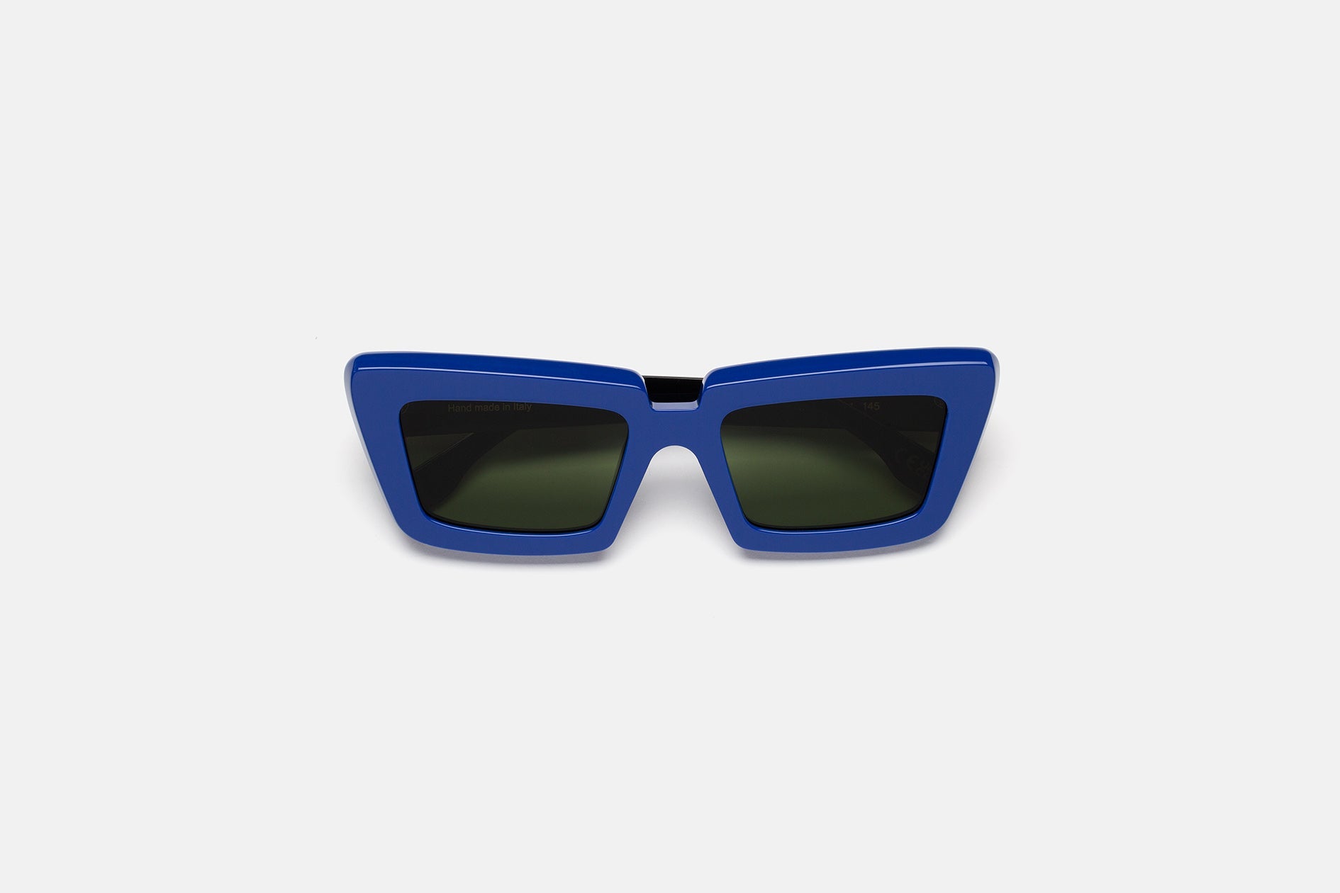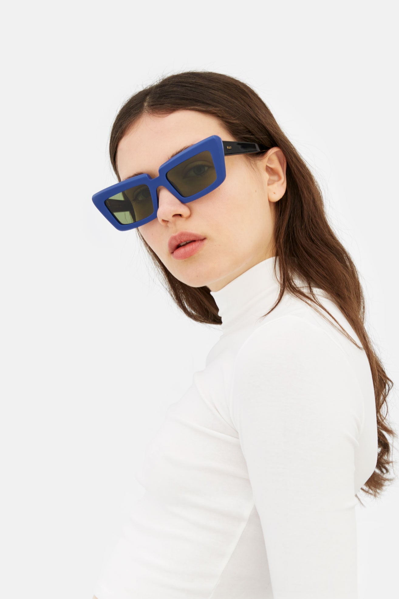 Coccodrillo is a stand-out silhouette conceived as a modern edgy frame. An experimental, innovative piece, Coccodrillo is a deliberately oversized shape featuring thick pointed rims. With precise geometries and slanted edges, this model oozes with character. This unique version of Coccodrillo features an electric blue acetate with green tinted lenses and shiny black temples.