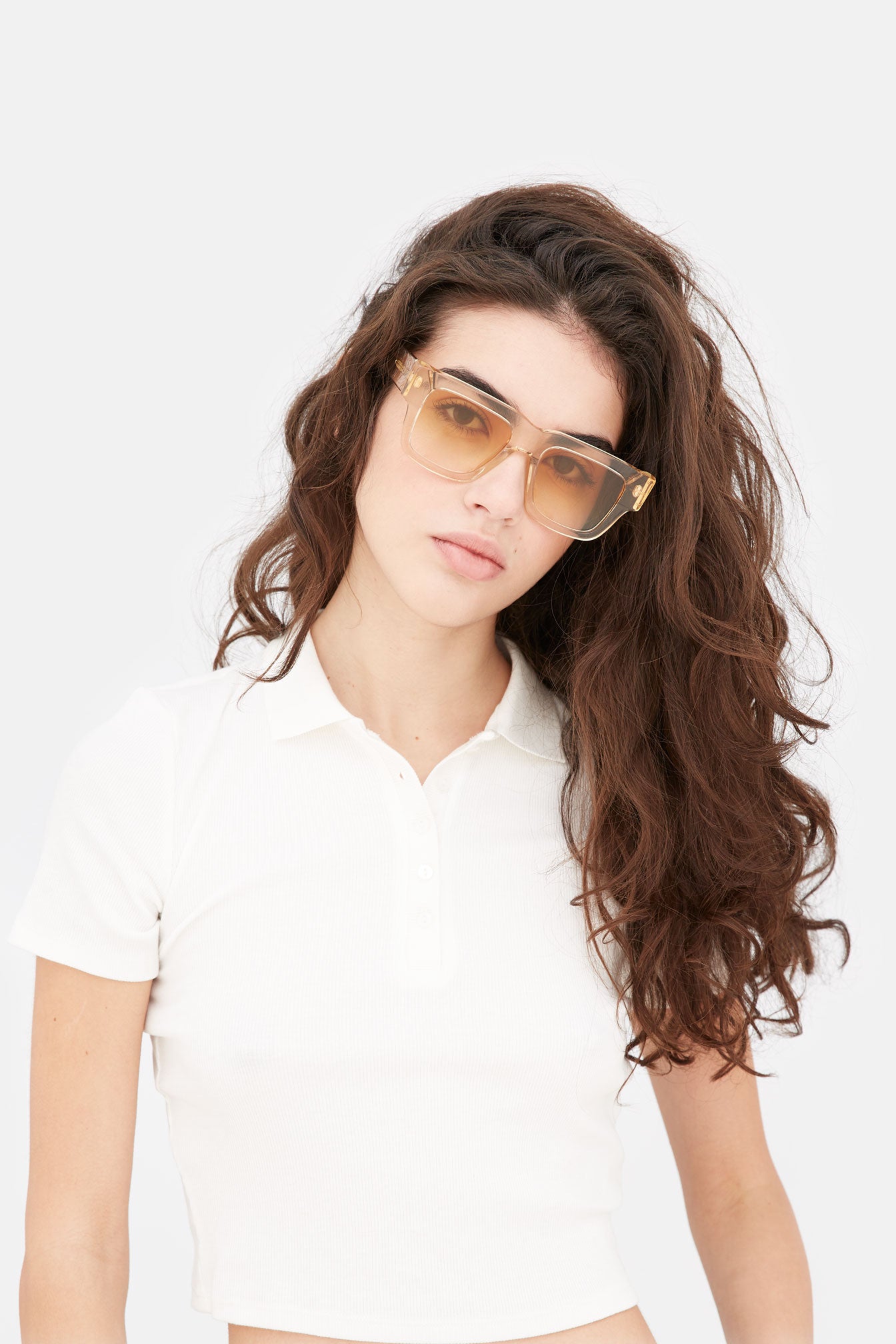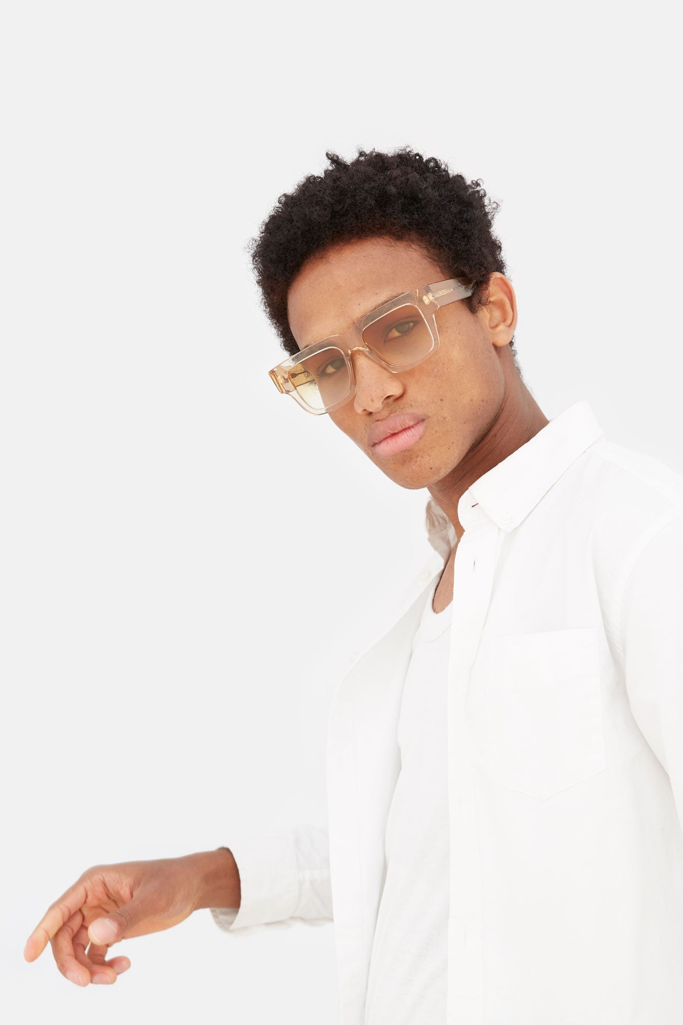 Mega is a statement silhouette conceived as a modern unisex oversized frame. Crafted from high-end Italian acetate for a compact and precise design, the model features tall, thick rims, a sturdy nose-bridge and angular lenses. This version comes in a fine resin crystal acetate and warm yellow faded lenses.