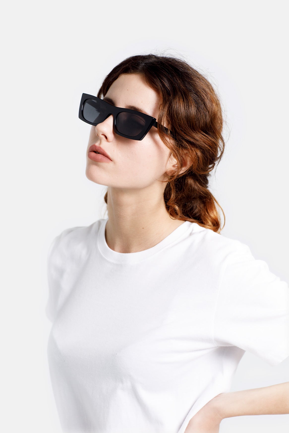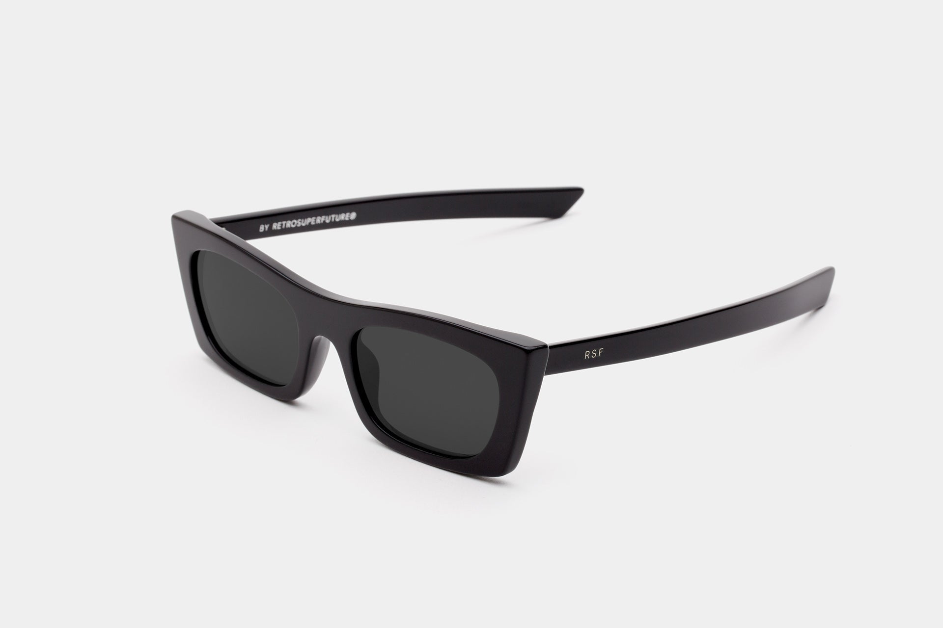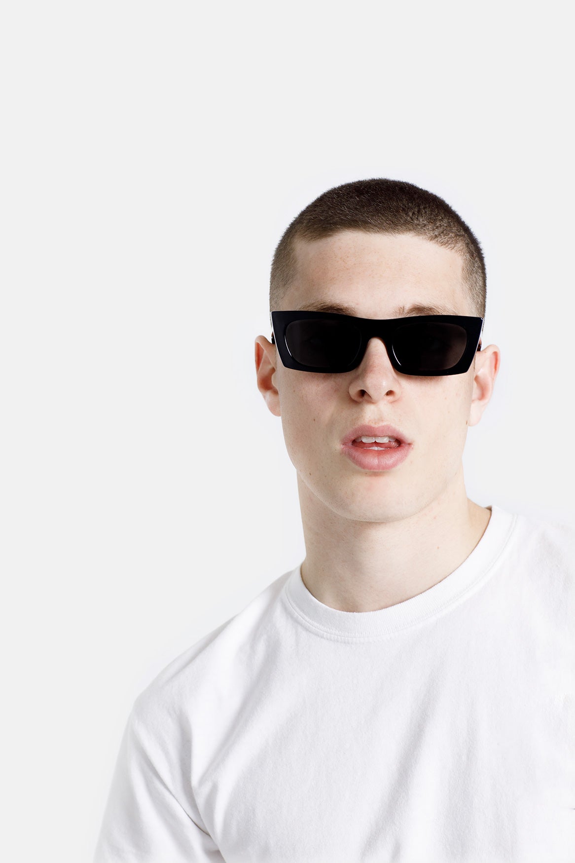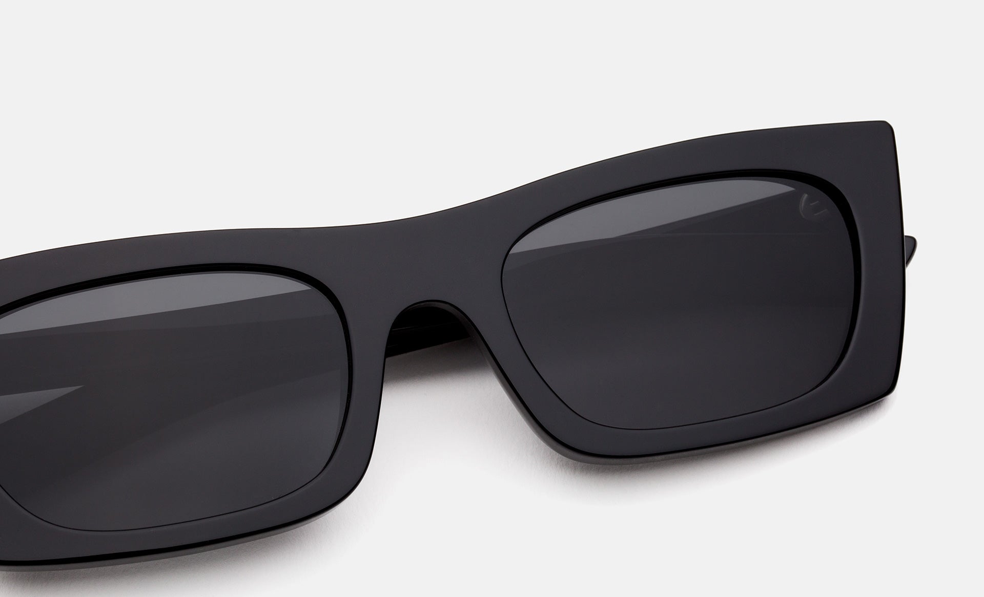 Fred Black is a radical silhouette inspired by 1990s street style aesthetics interpreted with a raw contemporary sensibility. The model is characterized by a sharp angular design that features a low frontal piece, thick arms and a sculptural profile crafted by merging two layers of acetate. This model features an all-black frame paired with sleek black lenses. The box contains a soft case and a cleaning cloth.