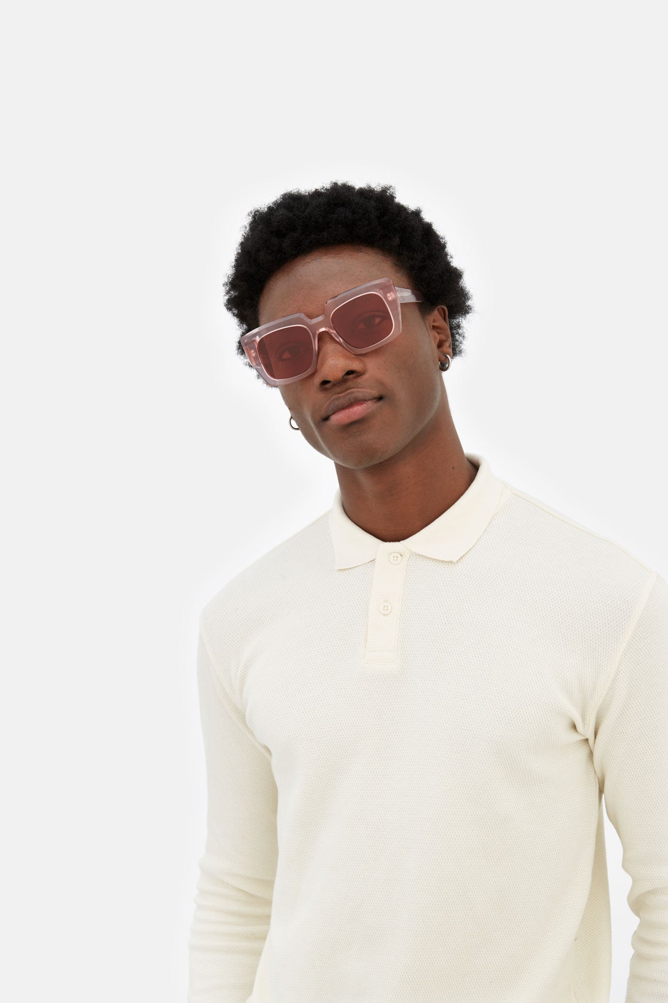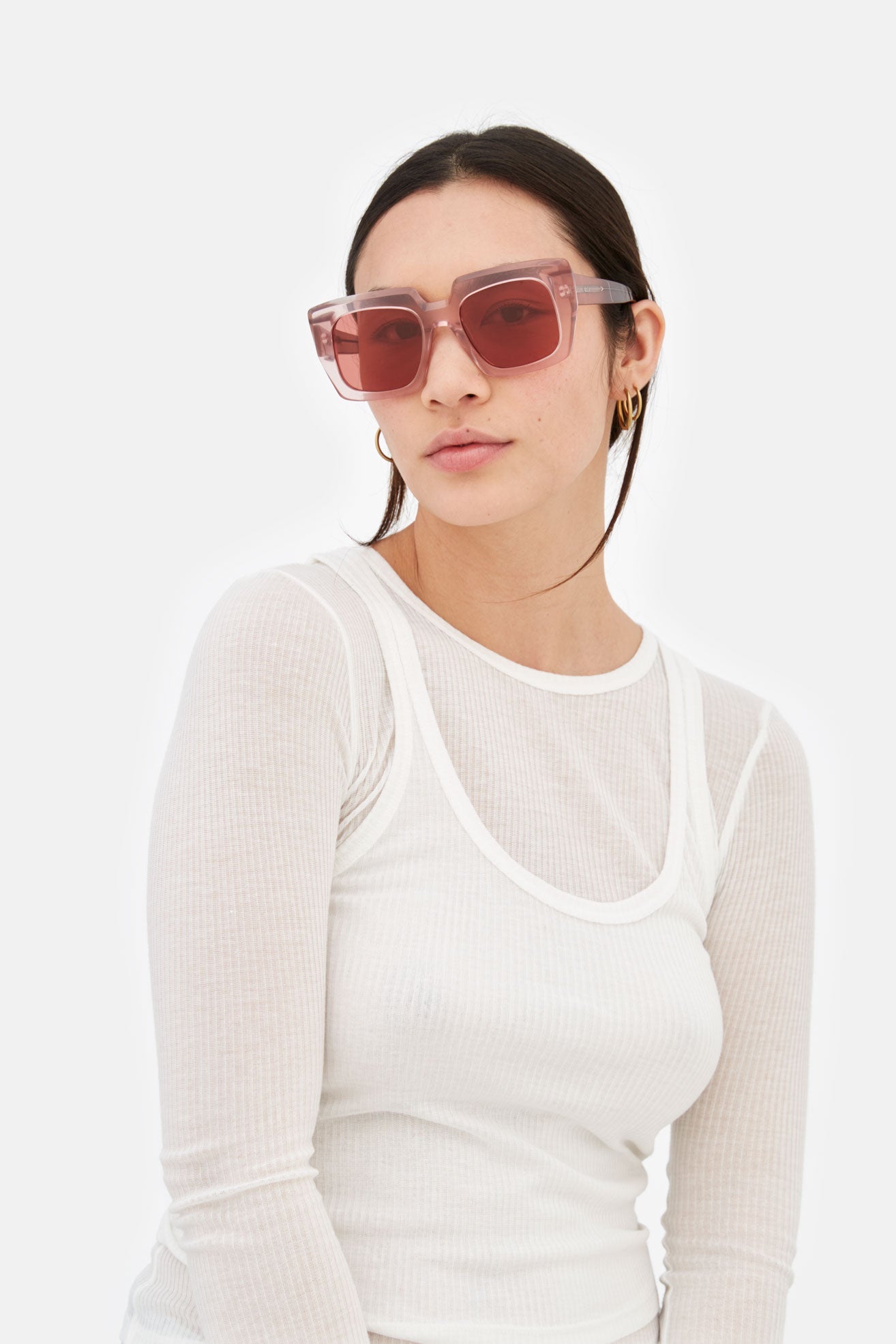 Piscina is a statement piece of eyewear characterized by its unique geometric design, stand-out oversized lenses and thick sculpted rims. The model is inspired by over-the-top late 70s aesthetics, reinterpreted for a more cutting-edge contemporary sensibility. A unisex design, Piscina features thick rims on the upper line, chiselled to form a slanted, elegant profile. Bold temples and a thick nose-bridge complete this model that is brimming with character. This version features a pale pink matte acetate with Bordeaux lenses.
