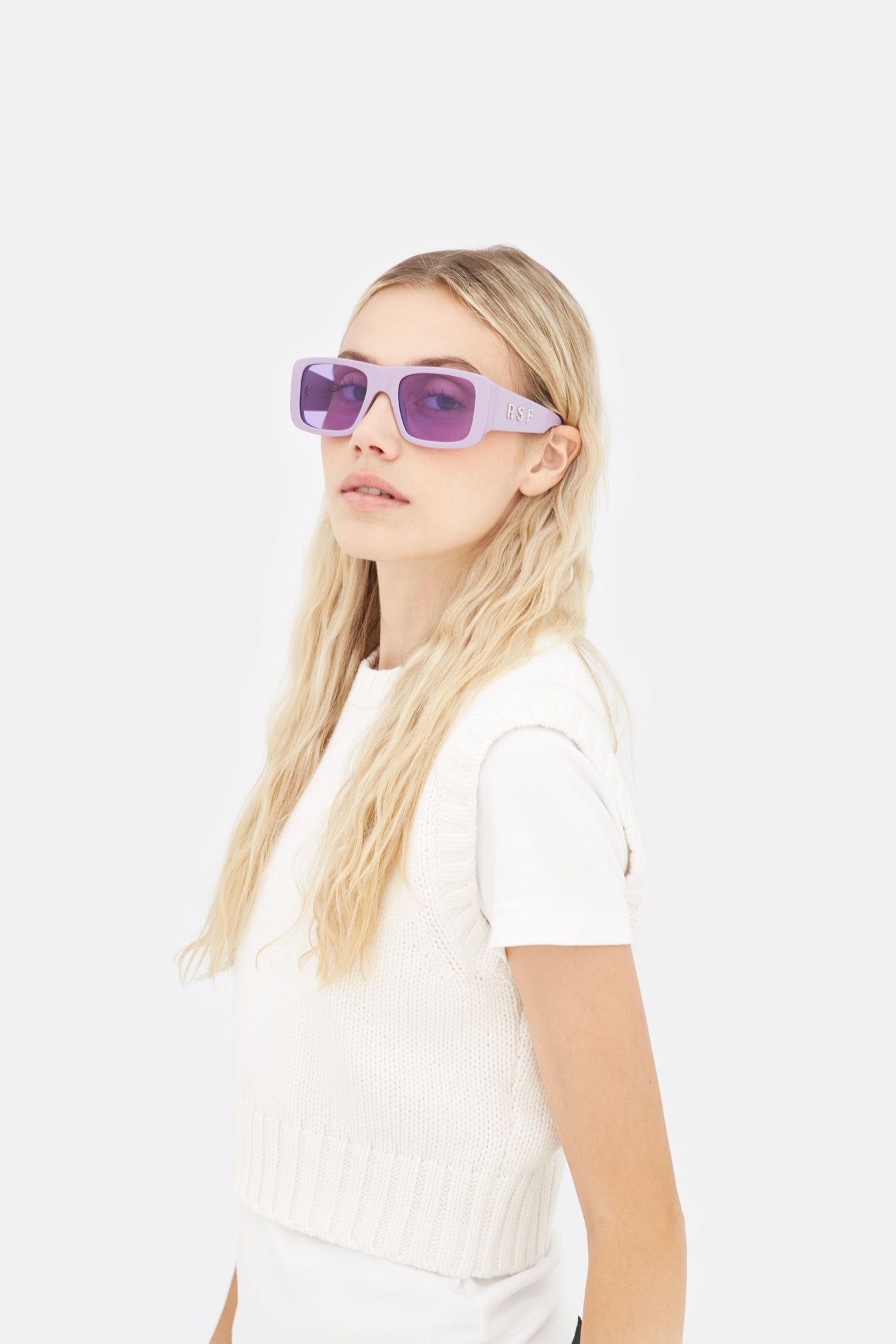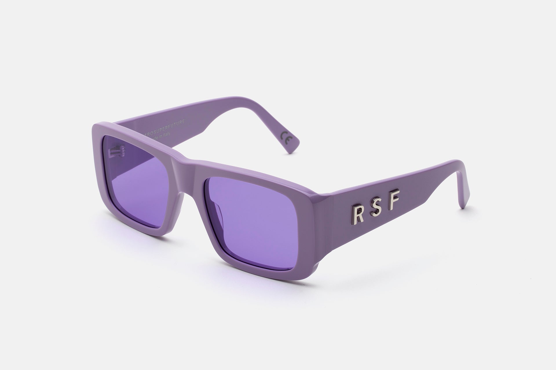 A key RSF statement piece, Onorato is a model inspired by 1970s references, from Aristotle Onassis to Miles Davis. A bold acetate frame with a sturdy, oversized design, Onorato features a straight upper line and a bold nose-bridge. Thick acetate rims curve around the temples match its distinctive wide temple tips. Oversized and with a street edge, this version comes with a lilac acetate and matching purple tinted lenses.