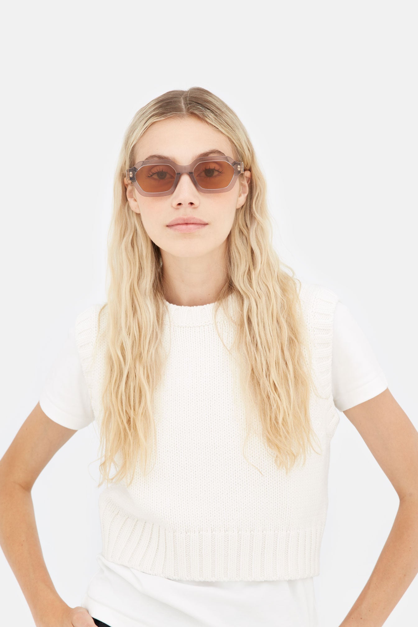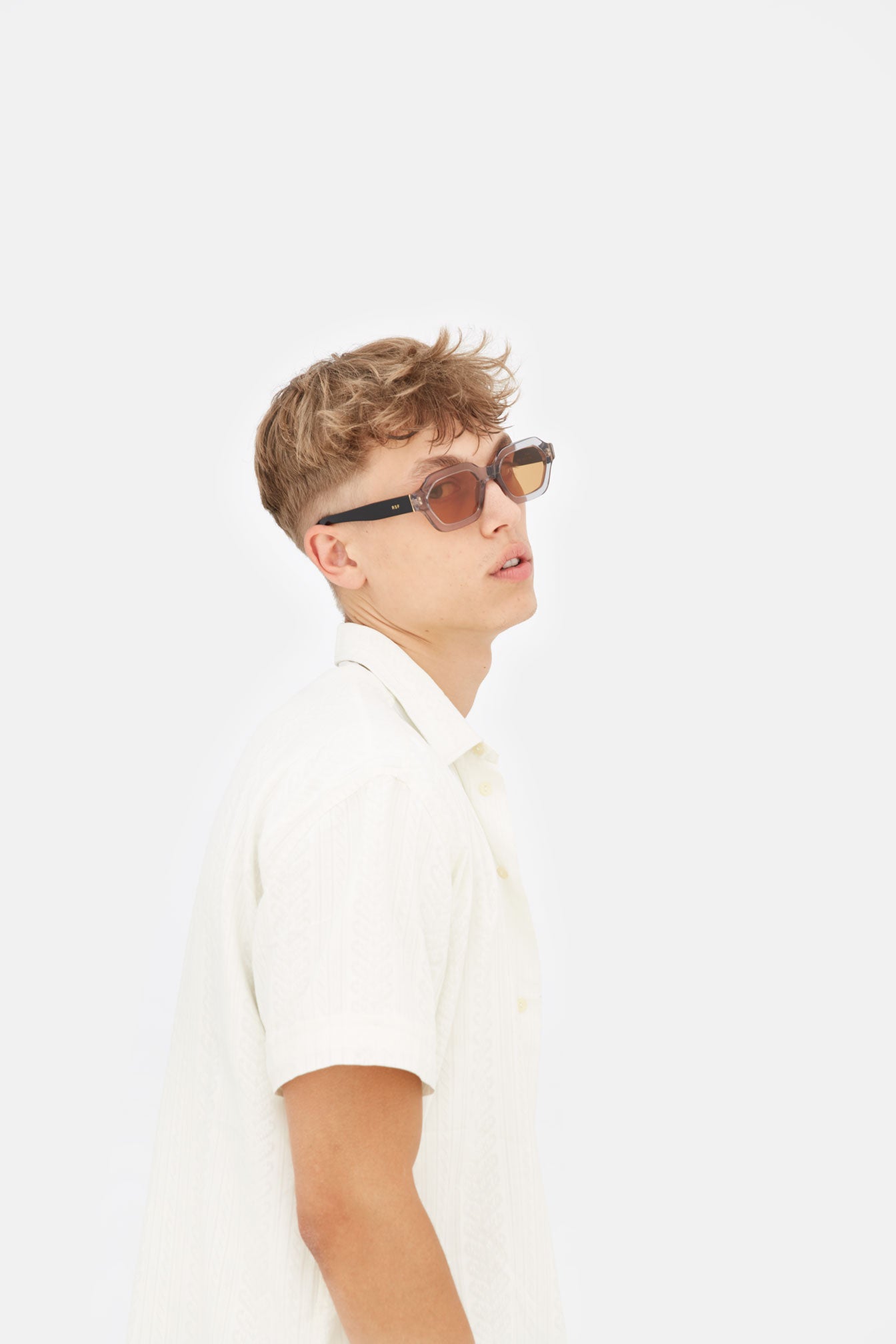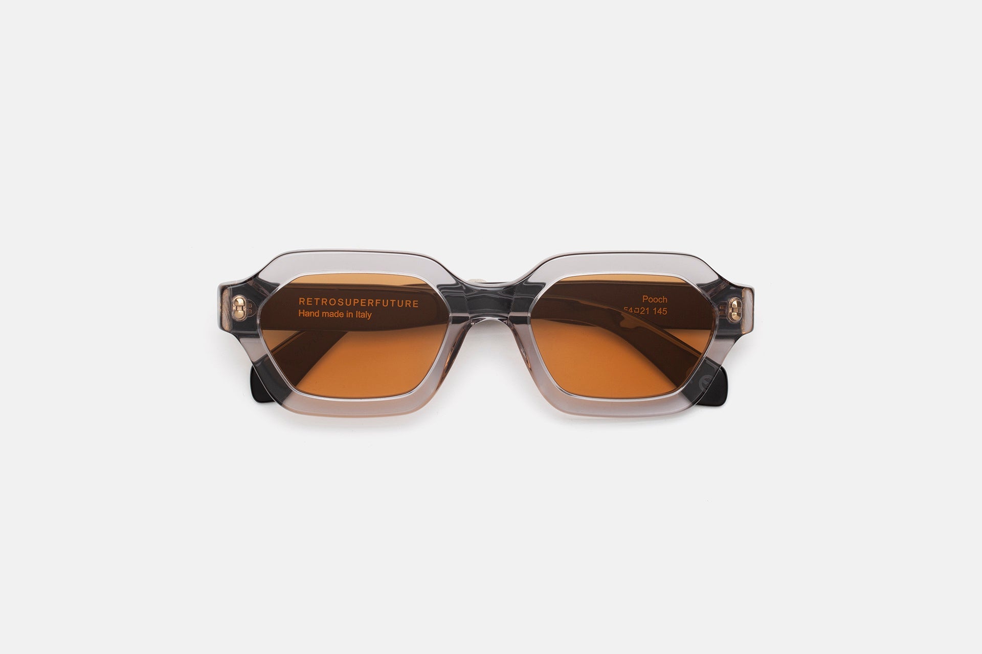 A pair of sunglasses with a story to tell: Pooch is inspired by the coolest kid on the bloc, the one always breaking norms and experimenting with style. A standout model, Pooch is an iconic silhouette with a unique hexagonal shape and wide lenses encased within its thick acetate construction. A silhouette with a distinctive street edge, it features a low nose-bridge and angular temple tips. This model comes in warm translucent acetate for the frontal frame with black temples and brown tinted lenses.