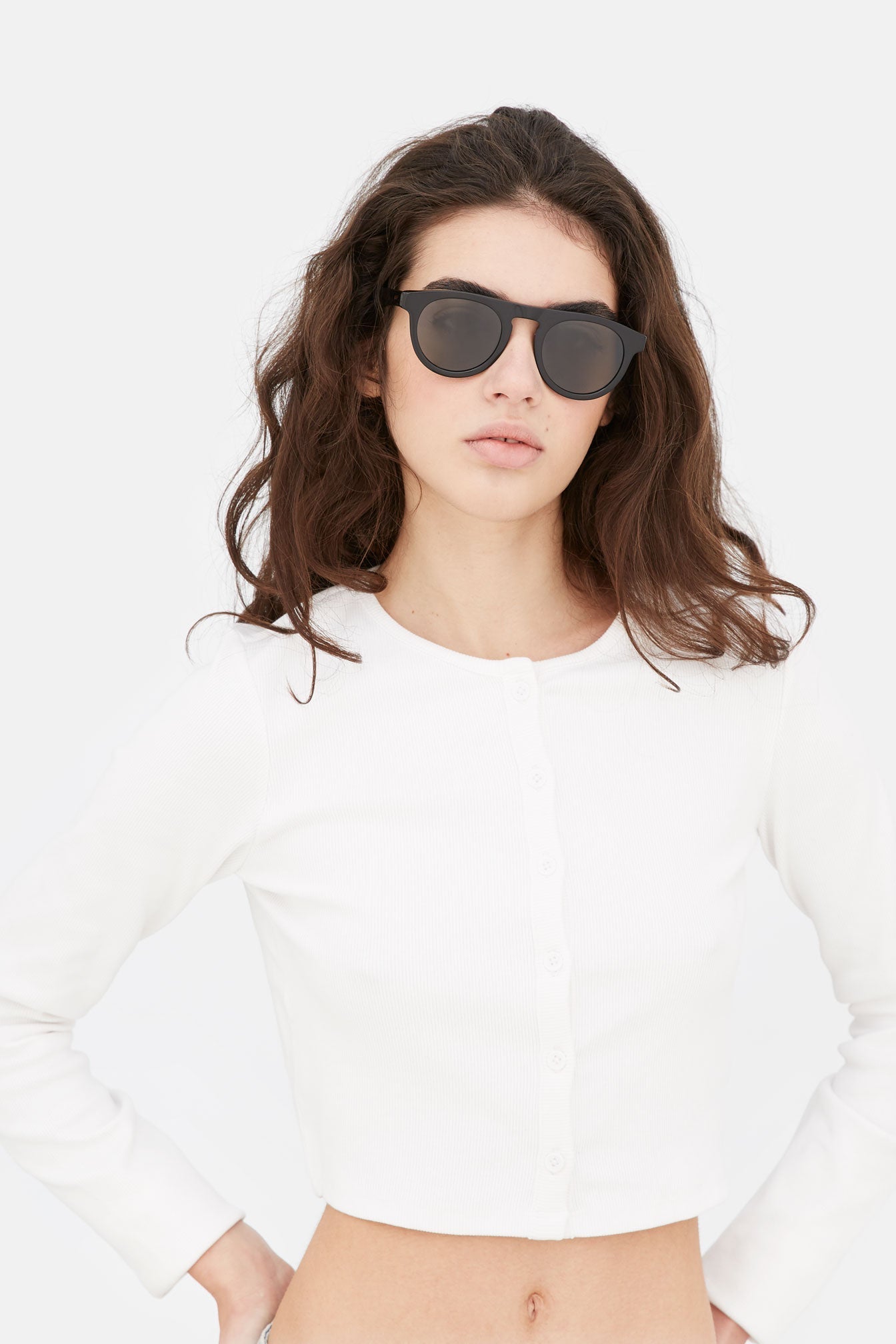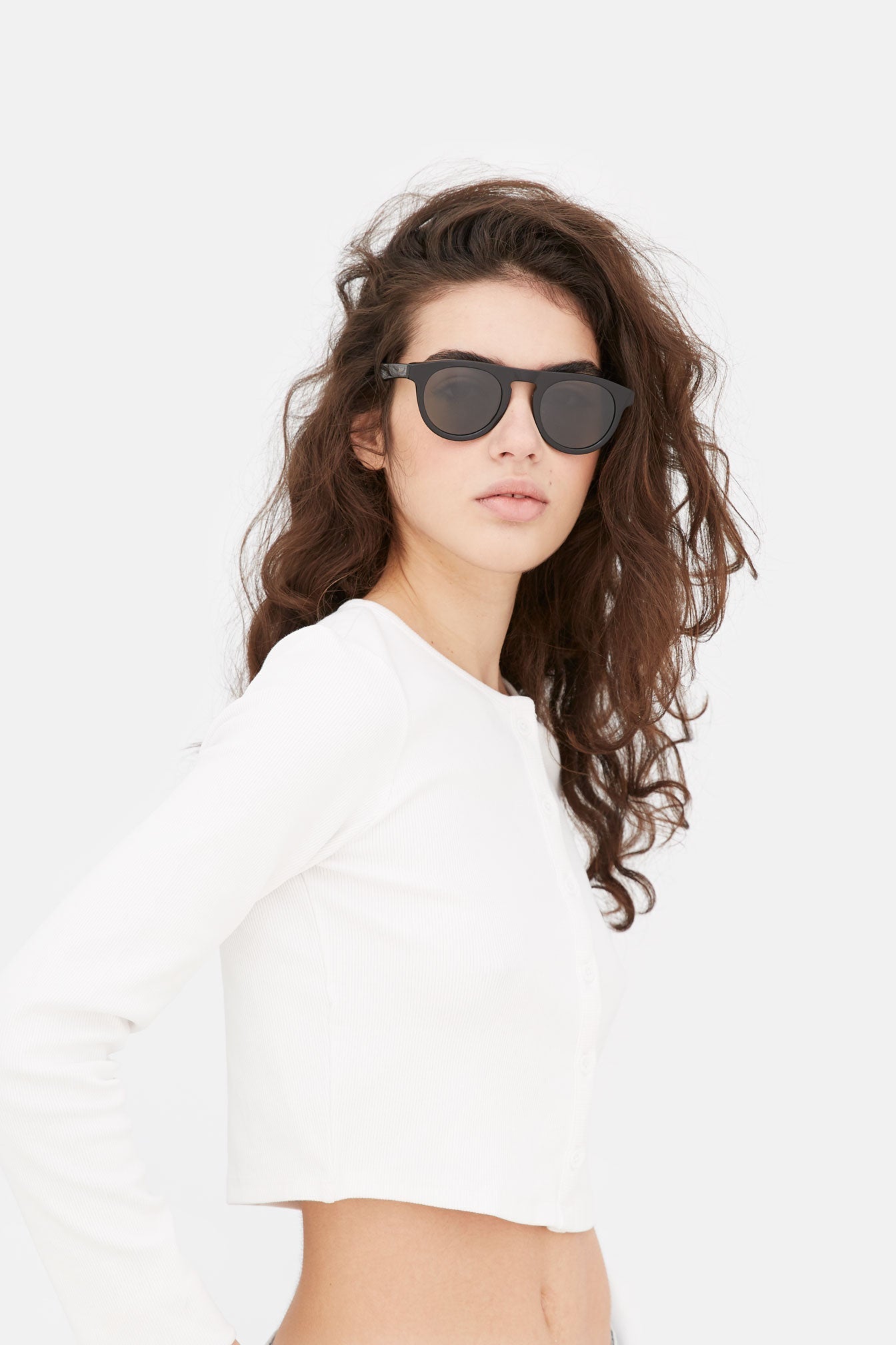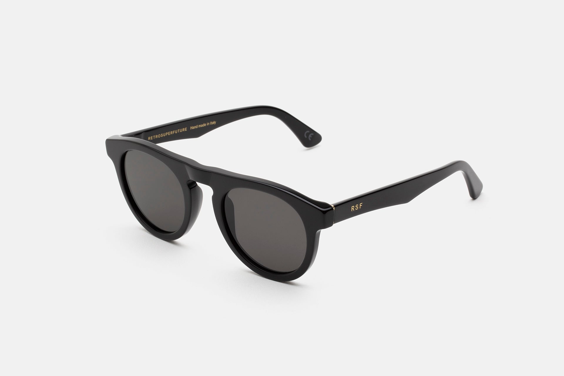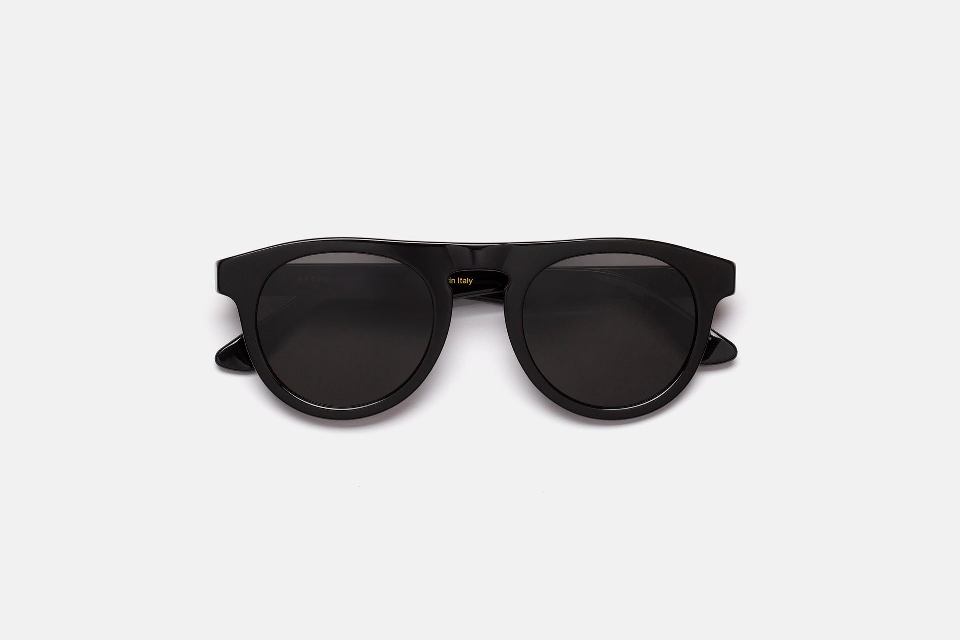 Racer is a timeless sportswear-inspired silhouette, with a streamlined upper line and contrasting curved, dynamic lens shapes. The lenses are Barberini tempered glass for a precise, technical feel and function. This version comes with black acetate and matching lenses.