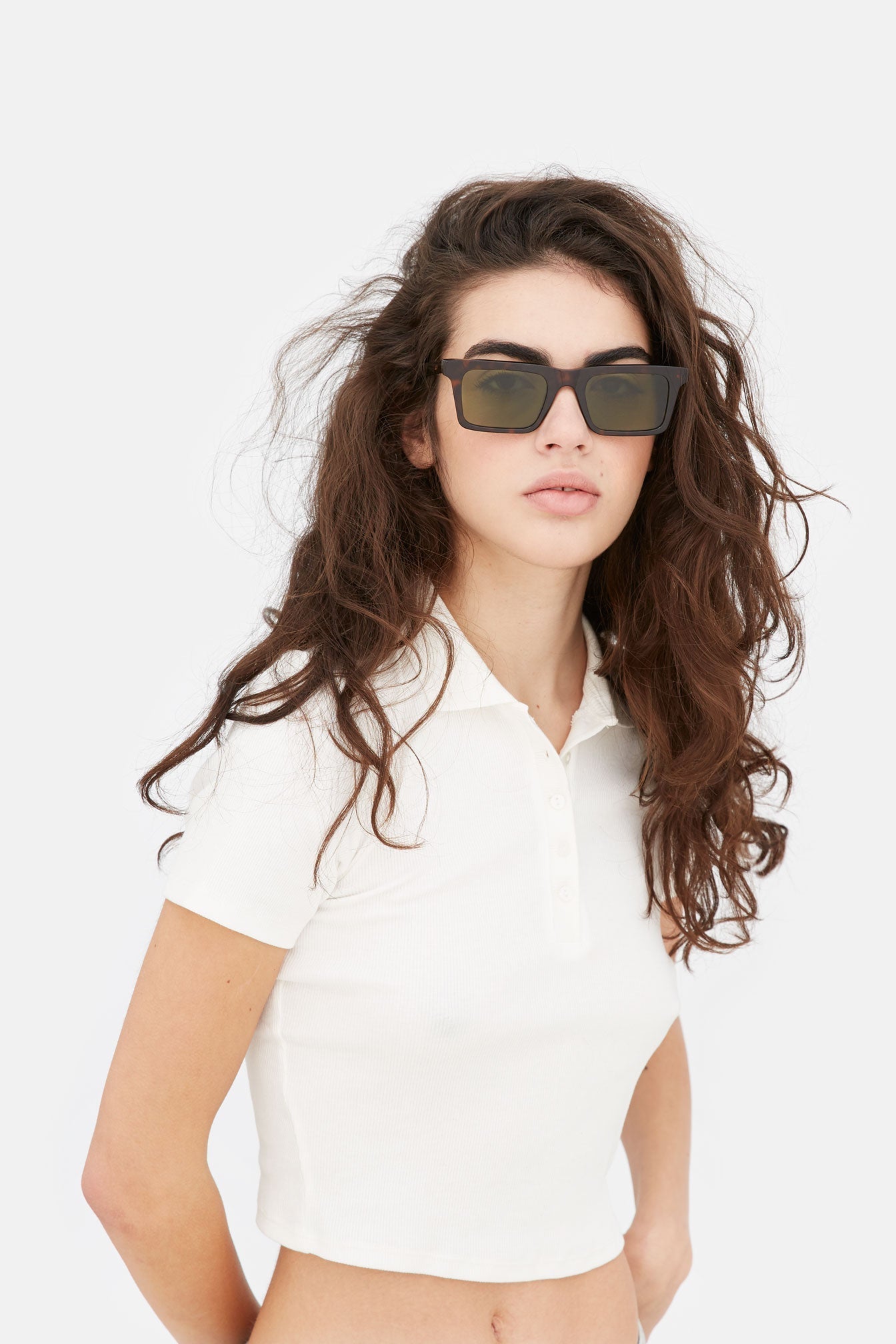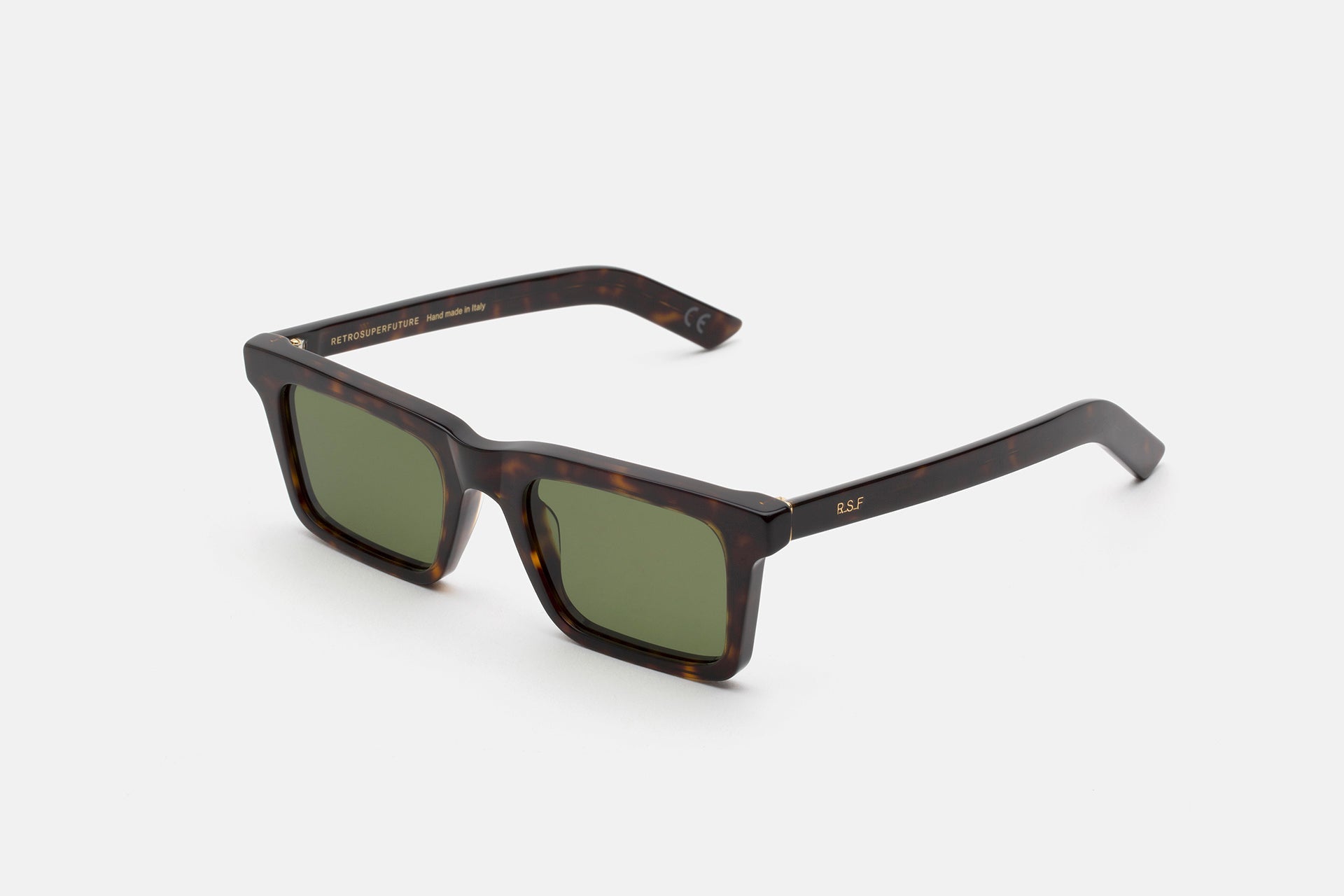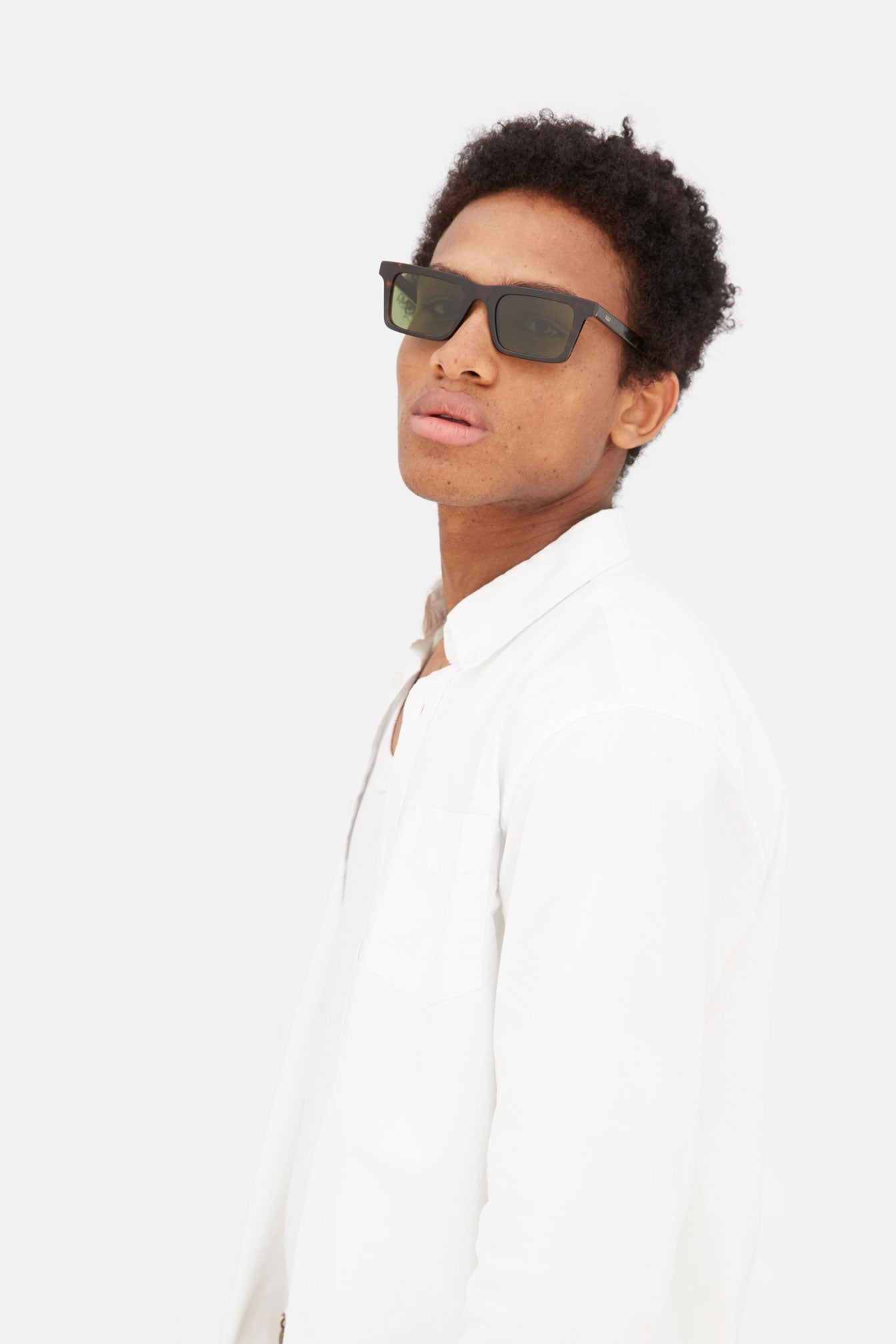1968 is a fresh silhouette with a strict angular profile and wide lenses. Echoing vintage shapes, the model features sharp modern details, such as pointed temple tips and a thick nose-bridge. This is a minimalist, everyday frame with a universal fit that comes in a dark Havana acetate and bottle green lenses.