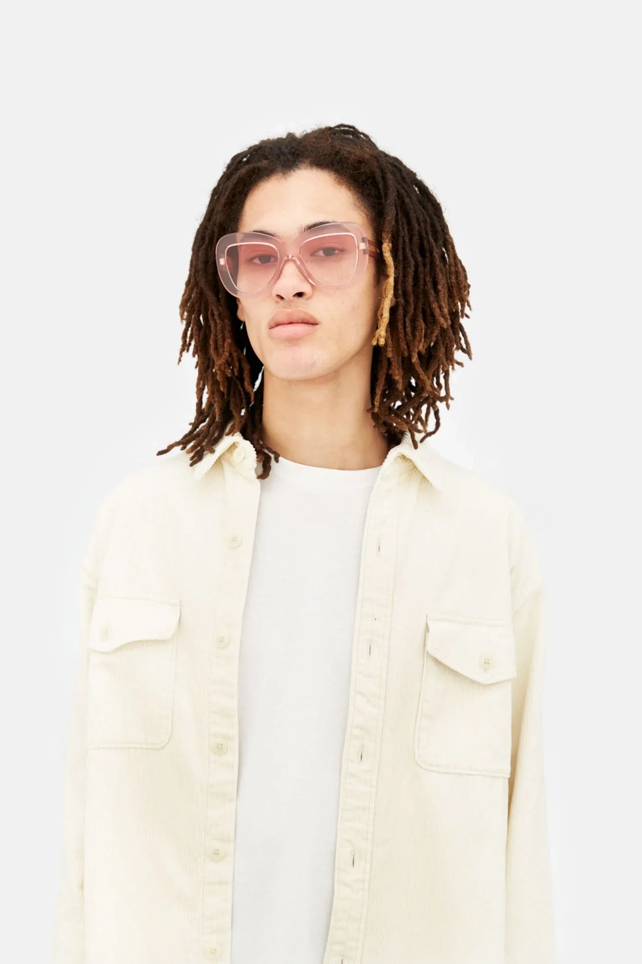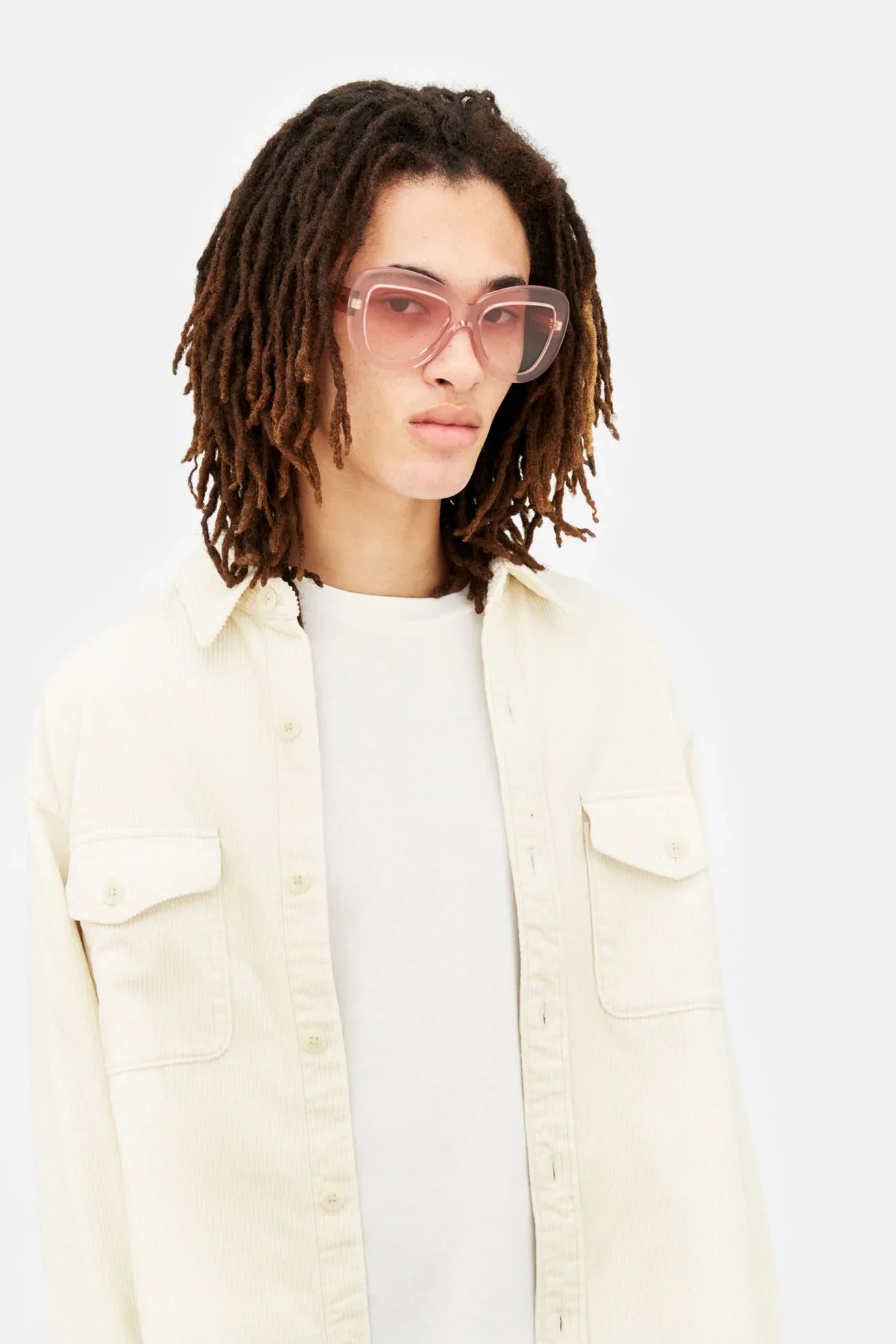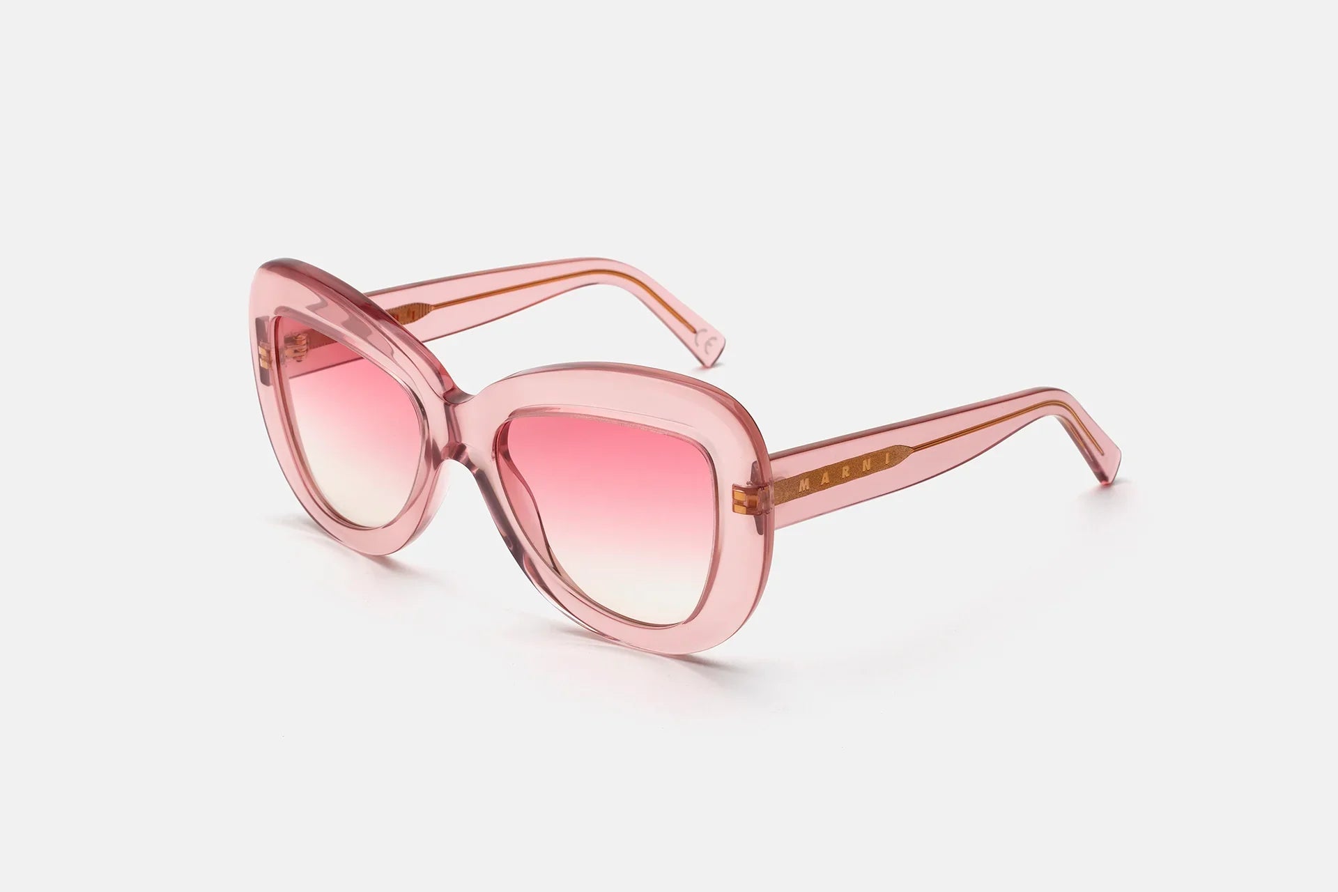 Designed exclusively for Marni, Elephant Island is an all-acetate interpretation of classic aviator silhouettes. The model features thick rims carefully curved on the sides and a sturdy lowered nose-bridge. A metal core with engraved Marni logo is encased on the temples. This version comes in a tinted crystal pink acetate with matching fading pink lenses.