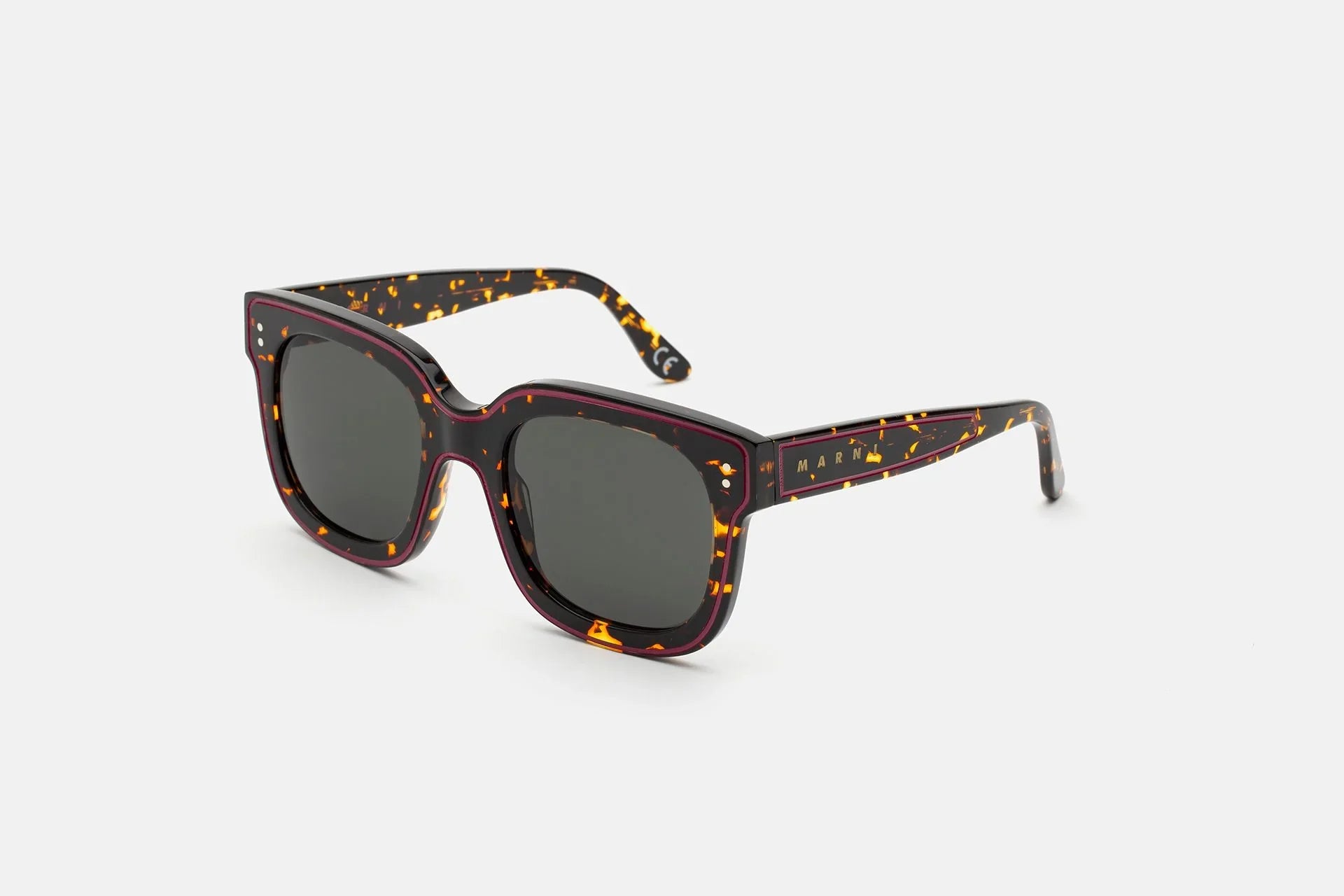 Designed exclusively for Marni, Li River is an iconic oversized silhouette crafted from quality Italian acetate. The shape is characterised by bold squared lenses with geometric temple tips. The front features an engraved line marking the shape’s thick rims. This version features a spotted Havana acetate with red detailing and black lenses.
