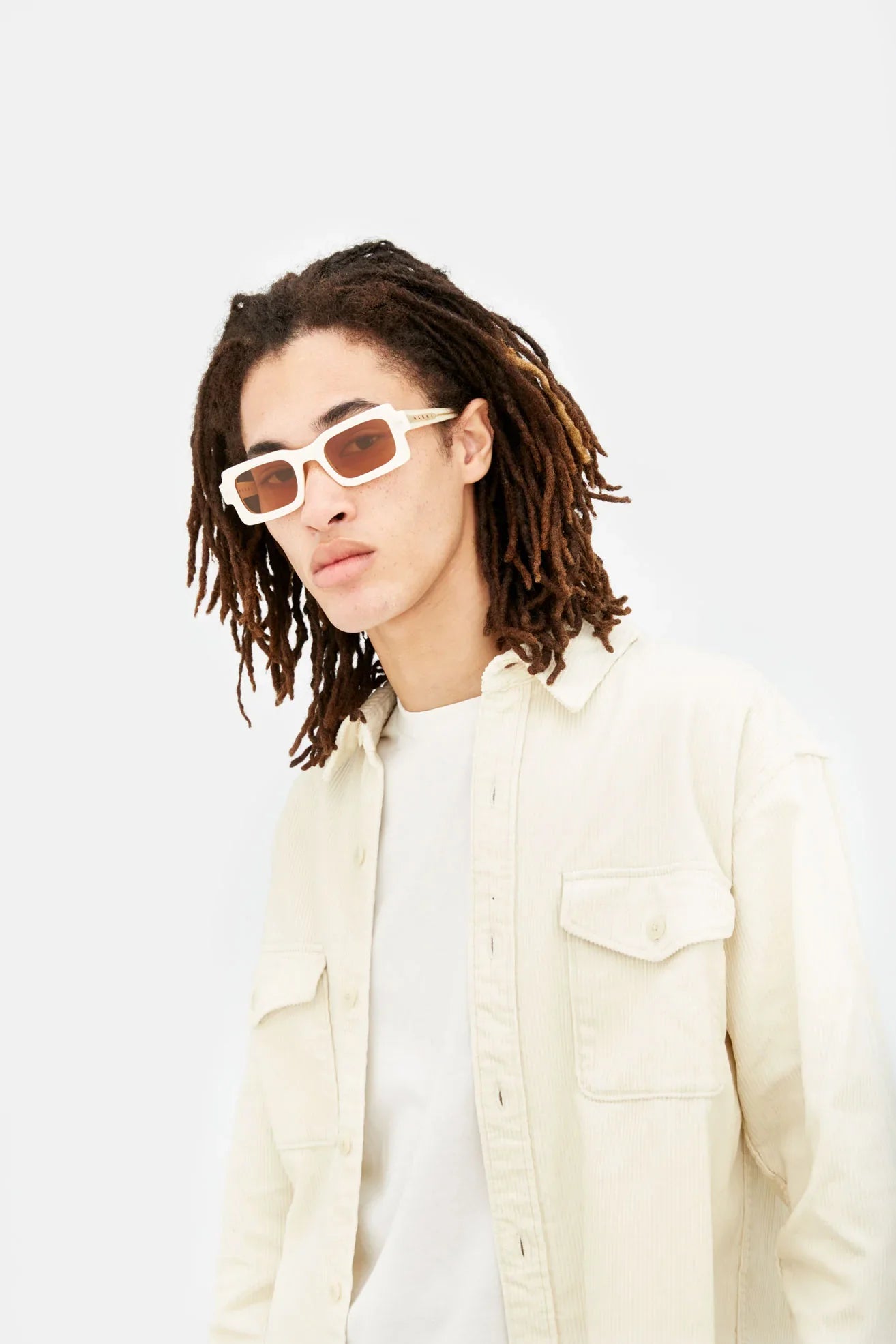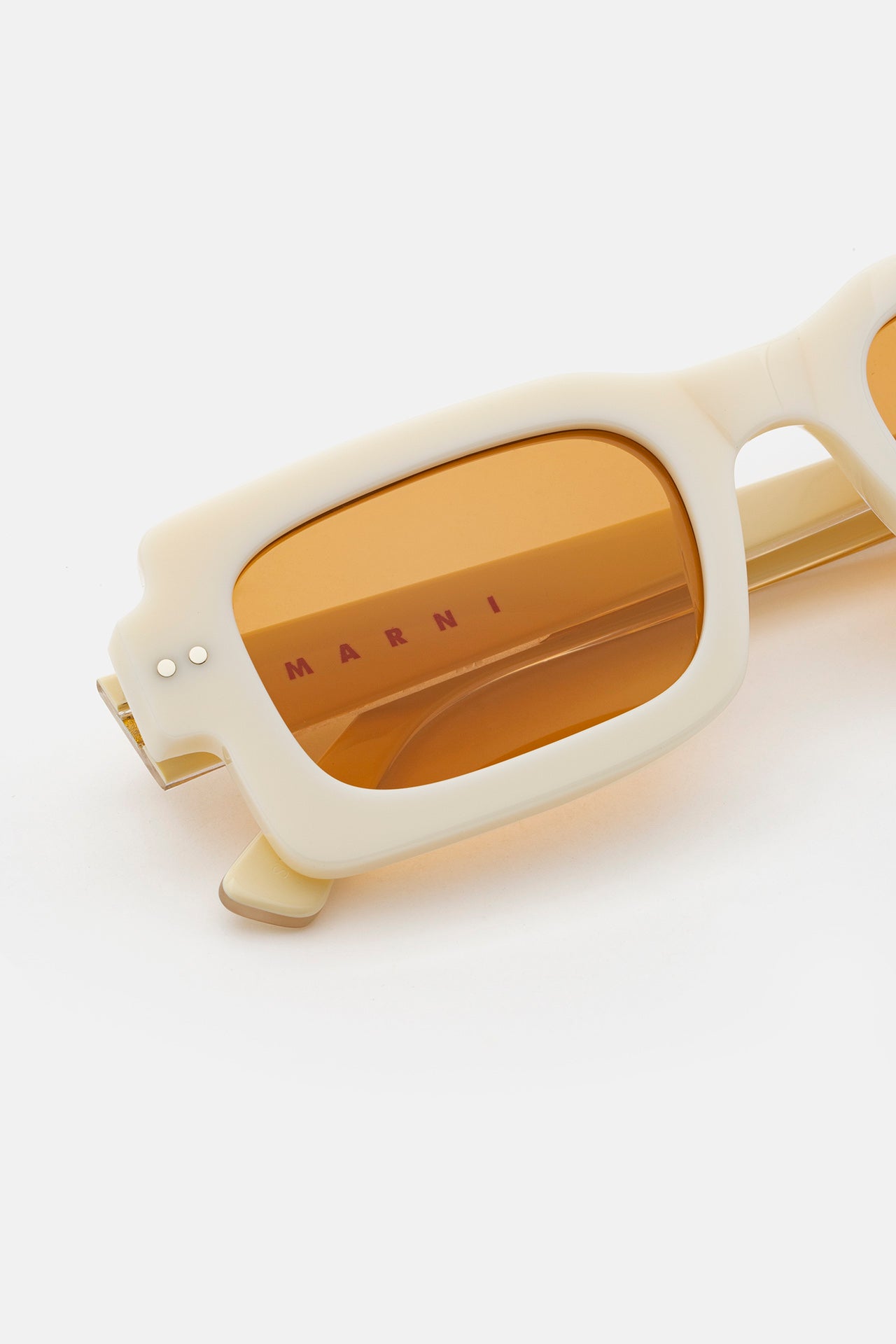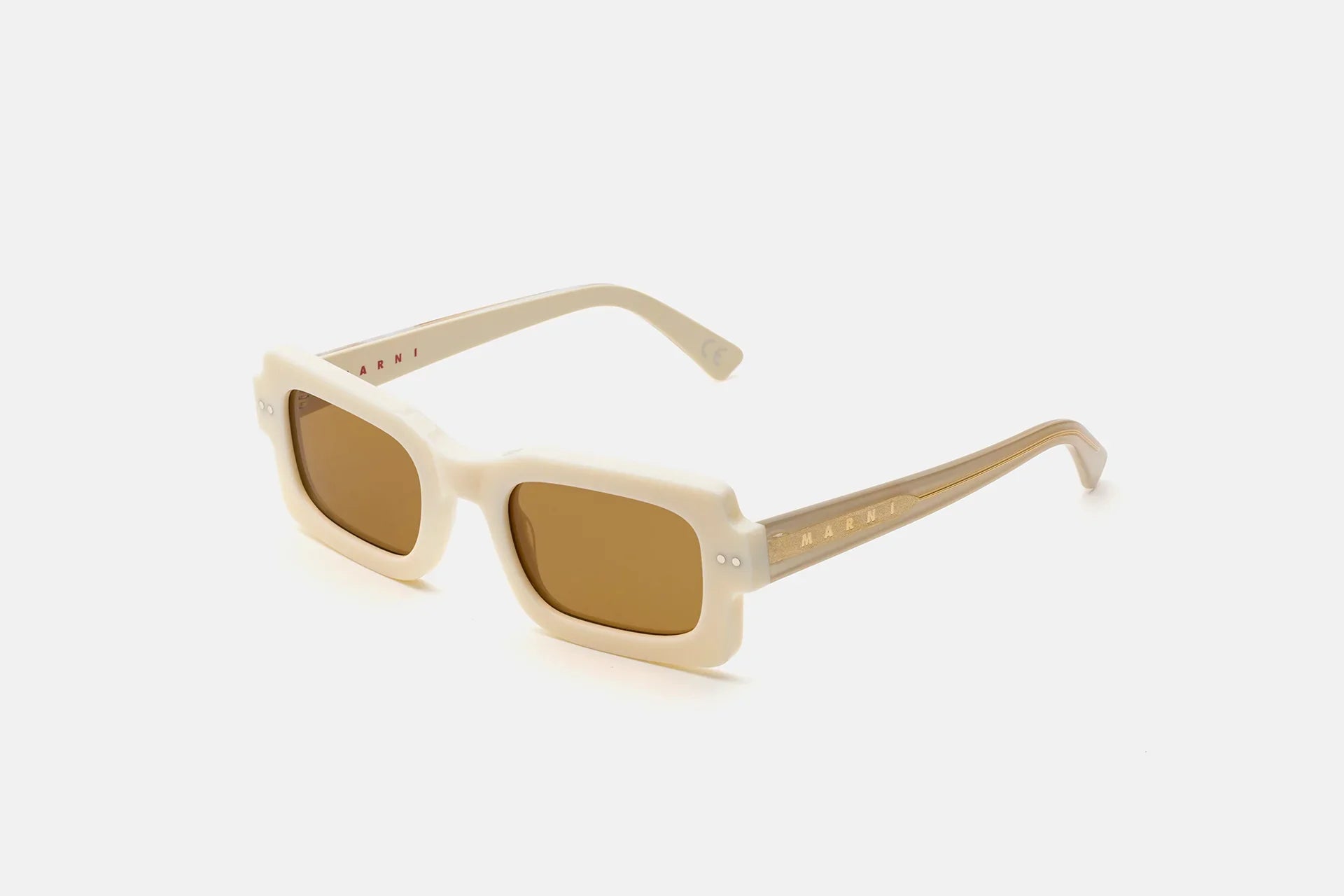 Designed exclusively for Marni, Lake Vostok is a bold geometric silhouette characterised by a low horizontal profile with a sturdy nose-bridge. The model features chunky acetate rims with squared temple tips and sleek temples revealing an engraved metal core. This version comes with a solid white acetate and brown tinted lenses.