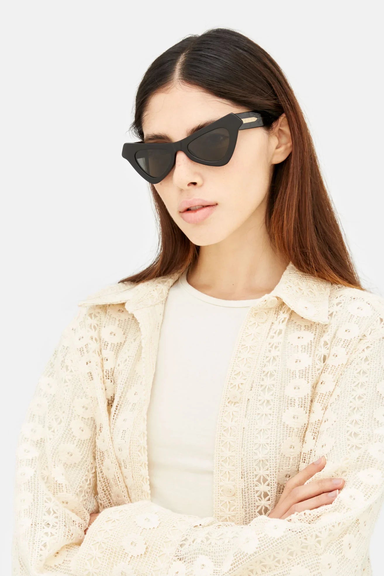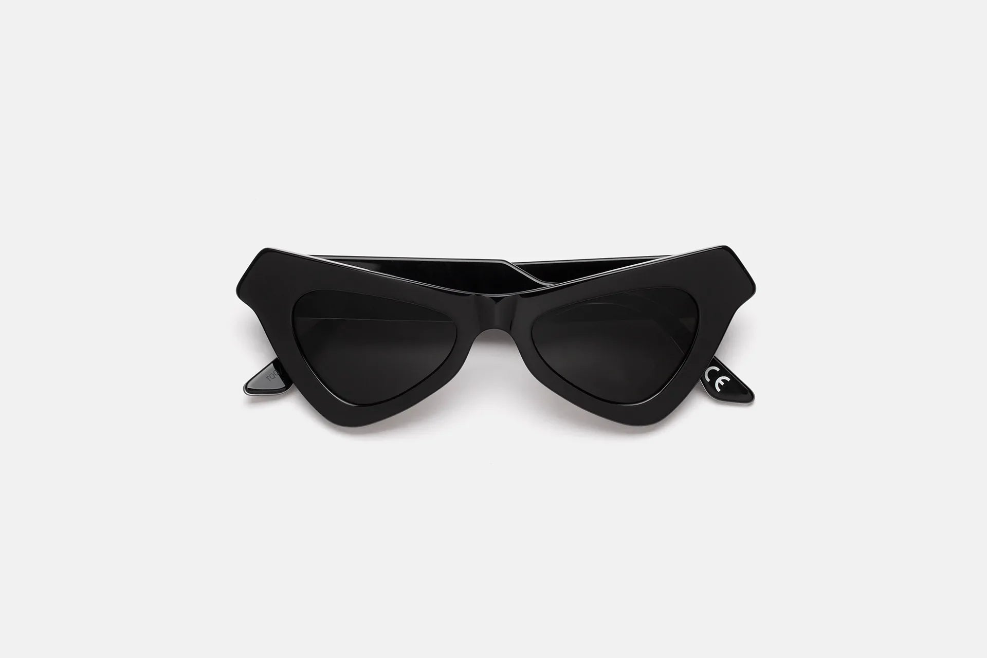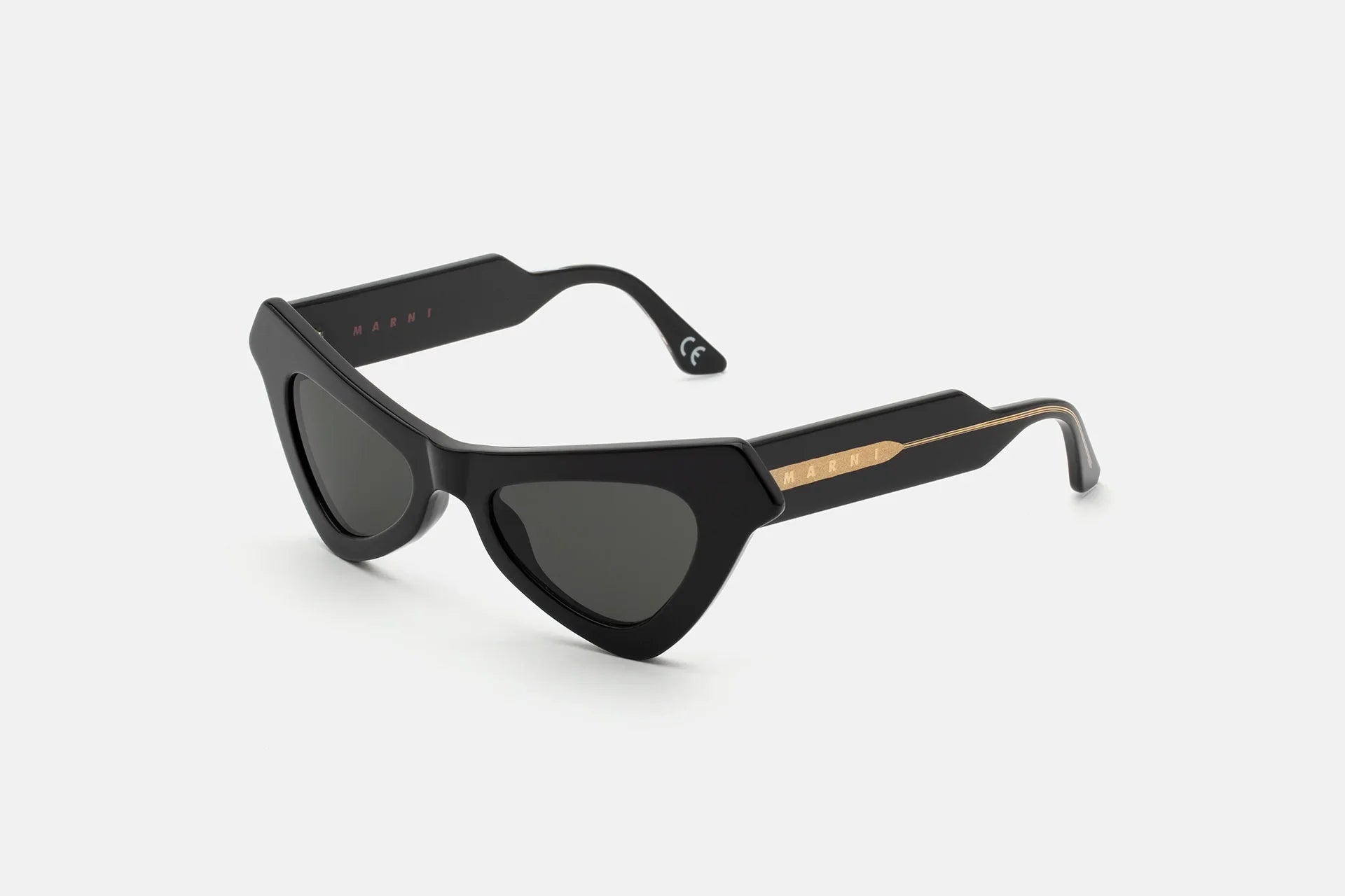Designed exclusively for Marni, Fairy Pools is an iconic shape created as a bold geometric interpretation of classic cat-eye frames. The model’s recognisable silhouette features sharp, pointed rims encasing triangular lenses. A sturdy nose-bridge and thick temples complete the unique geometry of the piece. This version comes in black acetate with black lenses.