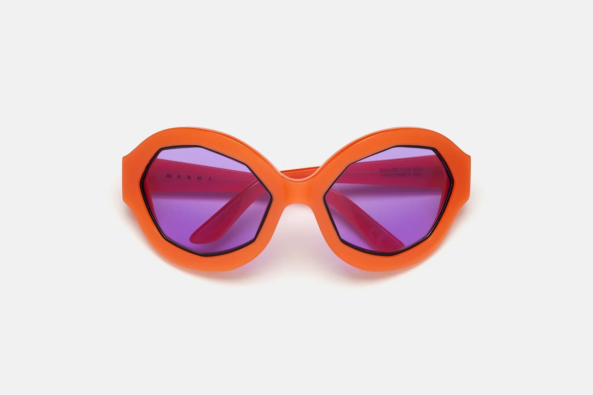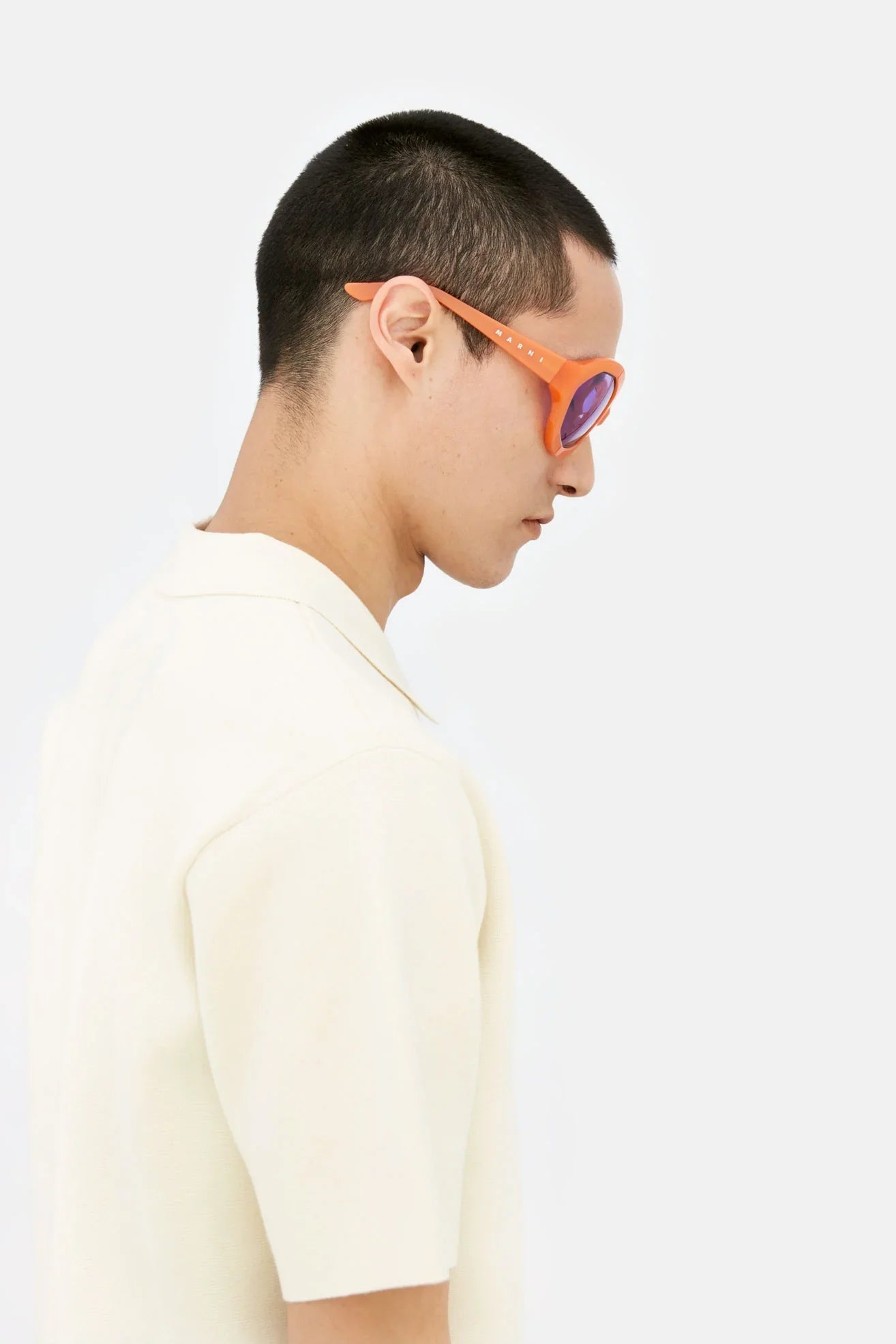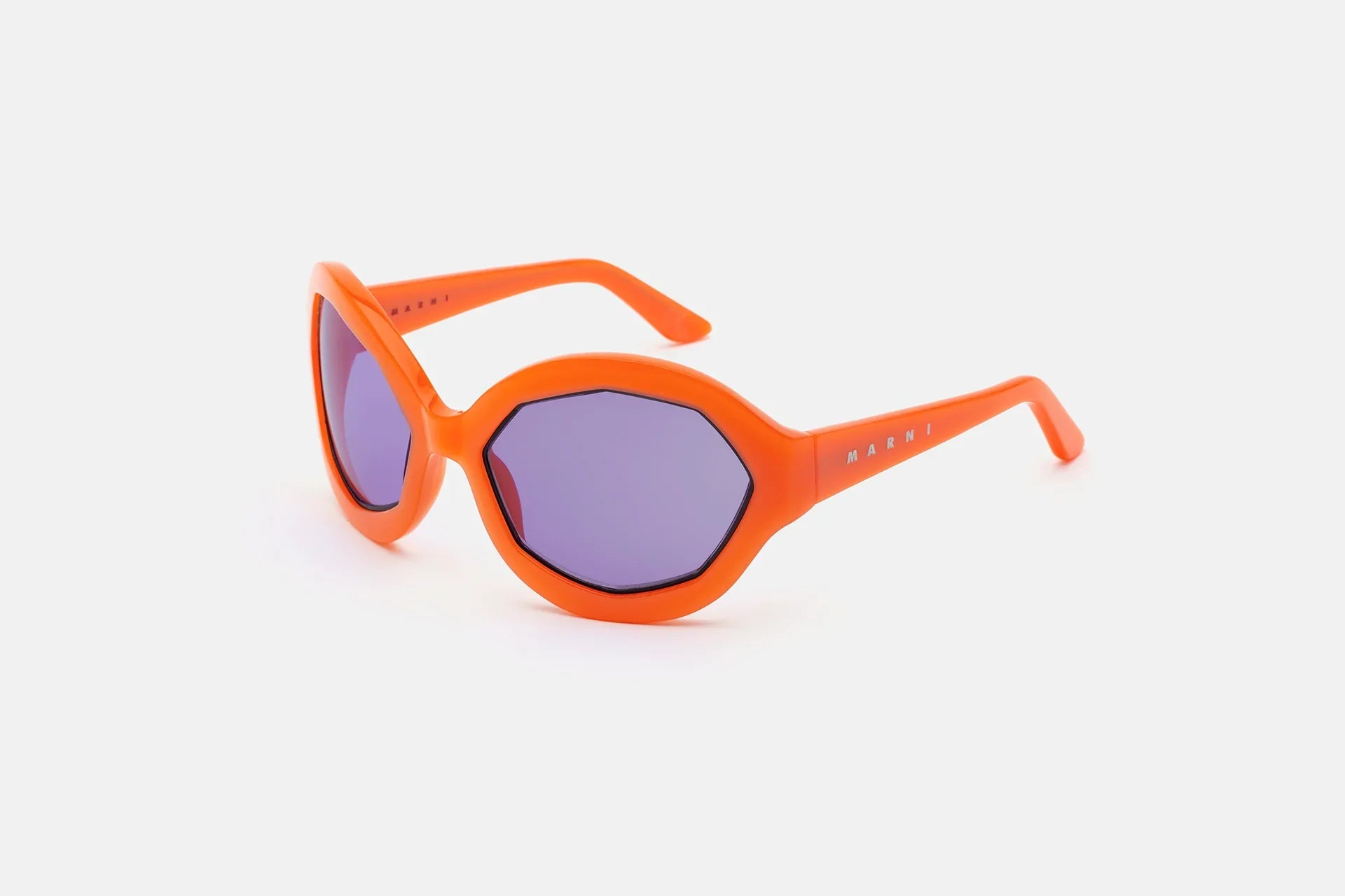 An exclusive silhouette designed for Marni, Cumulus Cloud captures the quirky essence of the cult Italian brand. Inspired by pop culture, with its bold colors, streamlined shapes and shiny plastic materials, Cumulus Cloud is the ultimate oversized silhouette. It features a rounded design with broad lenses encased within octagonal rings and set within a wrap-around acetate structure. This version comes in a bright orange acetate with black detailing and purple tinted lenses.