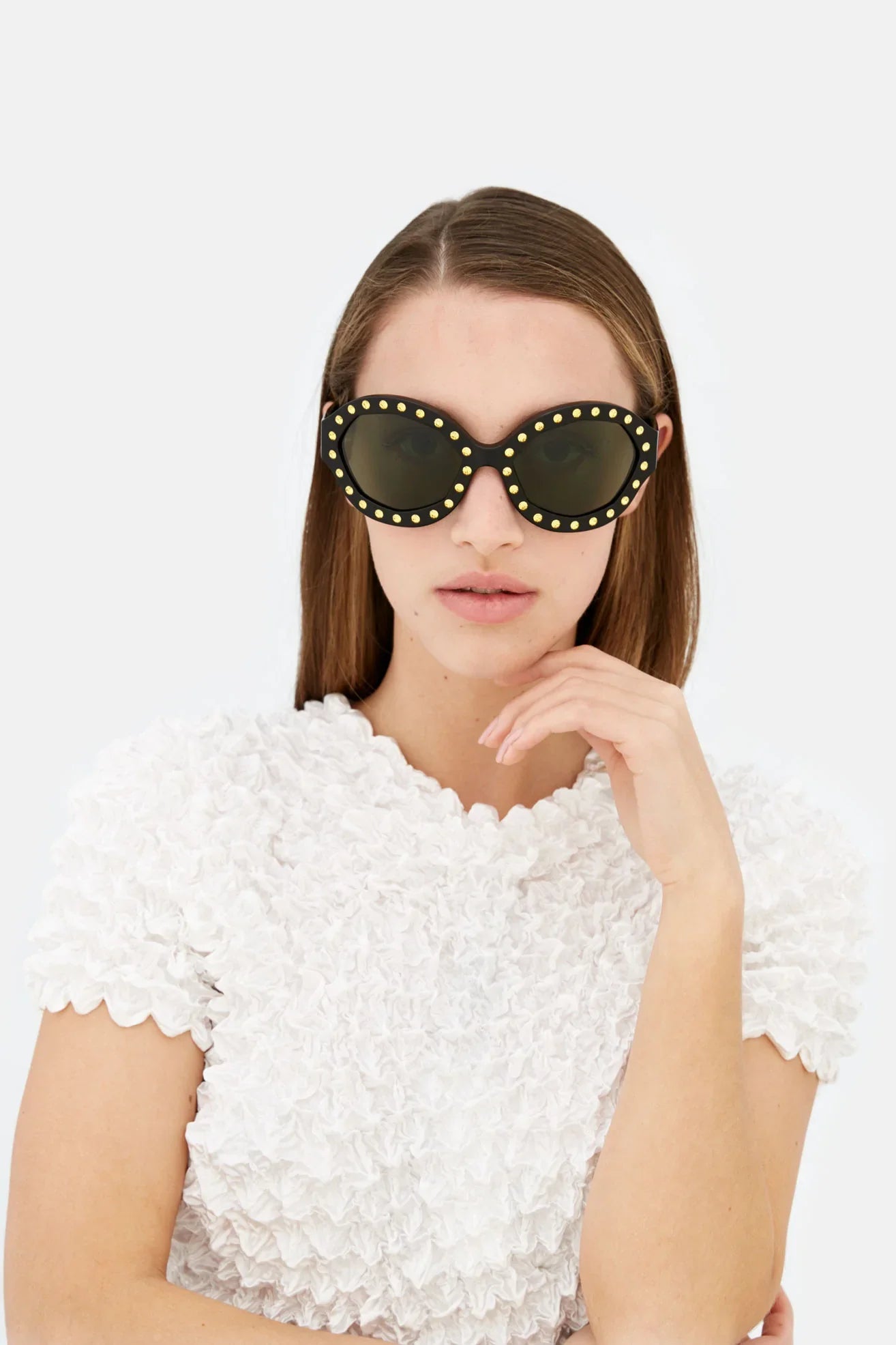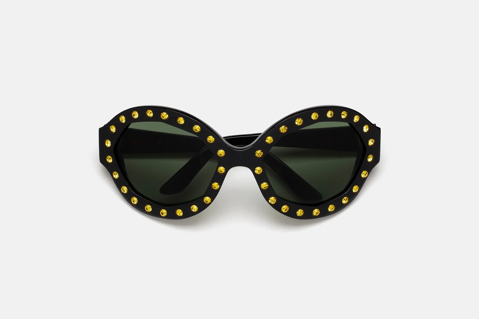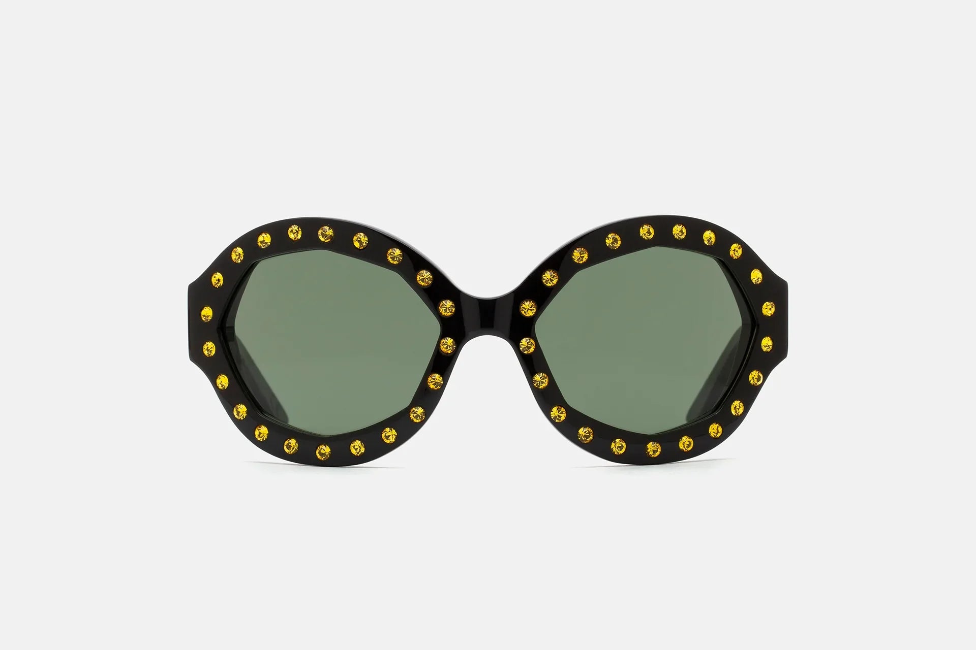 Naica Mine is a high-end silhouette designed for those looking for glamour in everyday life. Naica Mine is a luxurious, yet wearable piece that reinterprets the classic diva aesthetics with a more contemporary, urban edge. An oversized acetate piece, Naica Mine features a wrap-around design with a curved front and lenses encased within geometric octagonal rings. The key feature of the model are the precious stones that have been applied by hand on the outer rims, further highlighting its unique shape. This version comes in black with gold detailing.