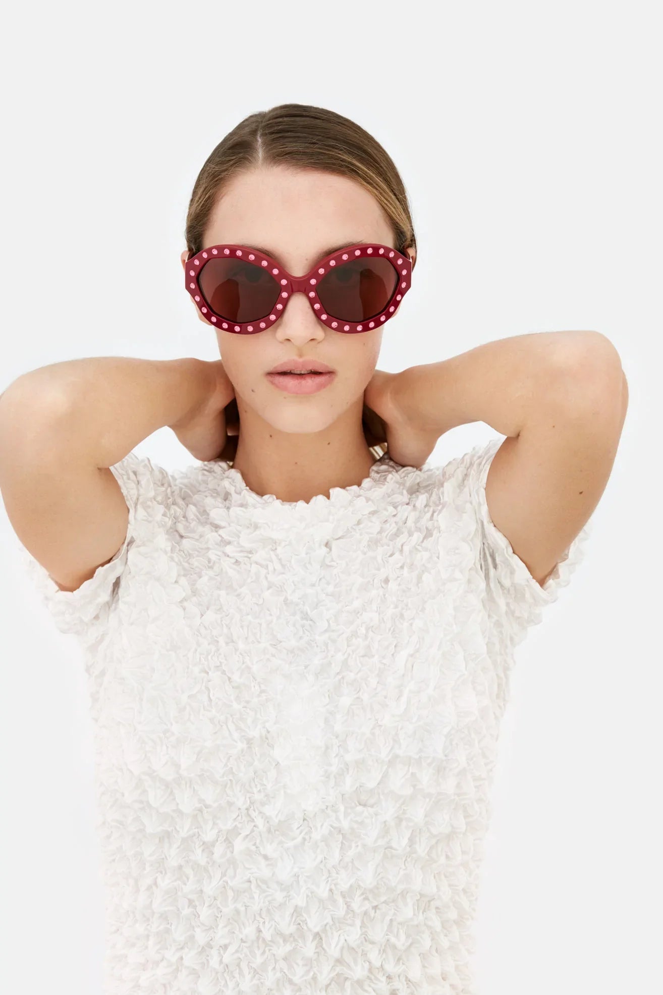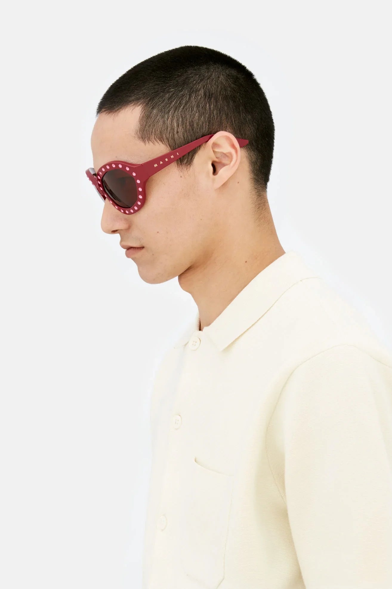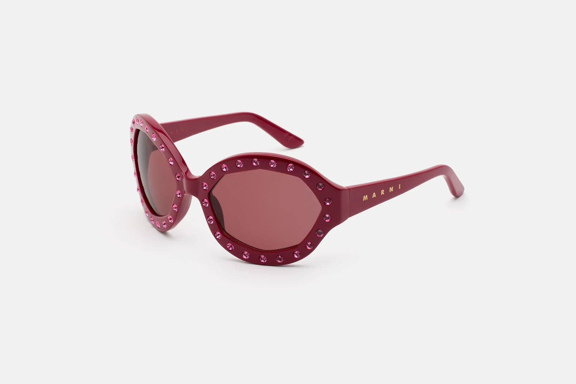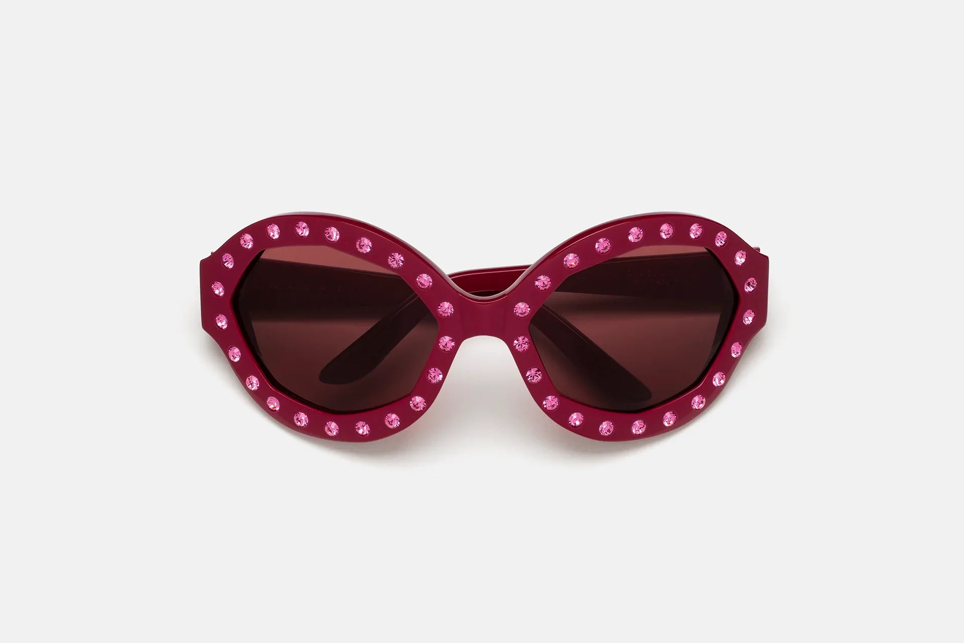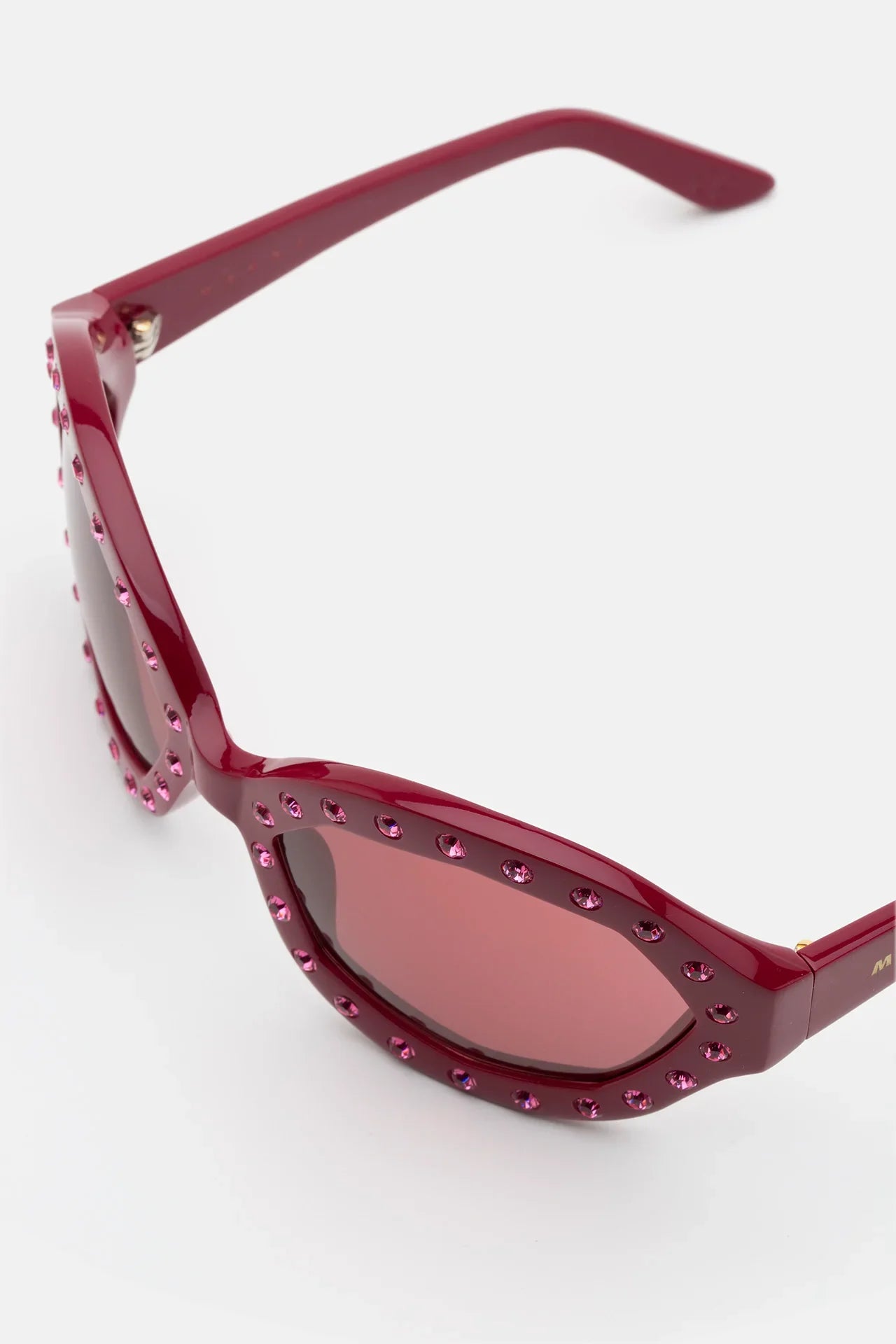 Naica Mine is a high-end silhouette designed for those looking for glamour in everyday life. Naica Mine is a luxurious, yet wearable piece that reinterprets the classic diva aesthetics with a more contemporary, urban edge. An oversized acetate piece, Naica Mine features a wrap-around design with a curved front and lenses encased within geometric octagonal rings. The key feature of the model are the precious stones that have been applied by hand on the outer rims, further highlighting its unique shape. This version comes in dark red with pink stones.