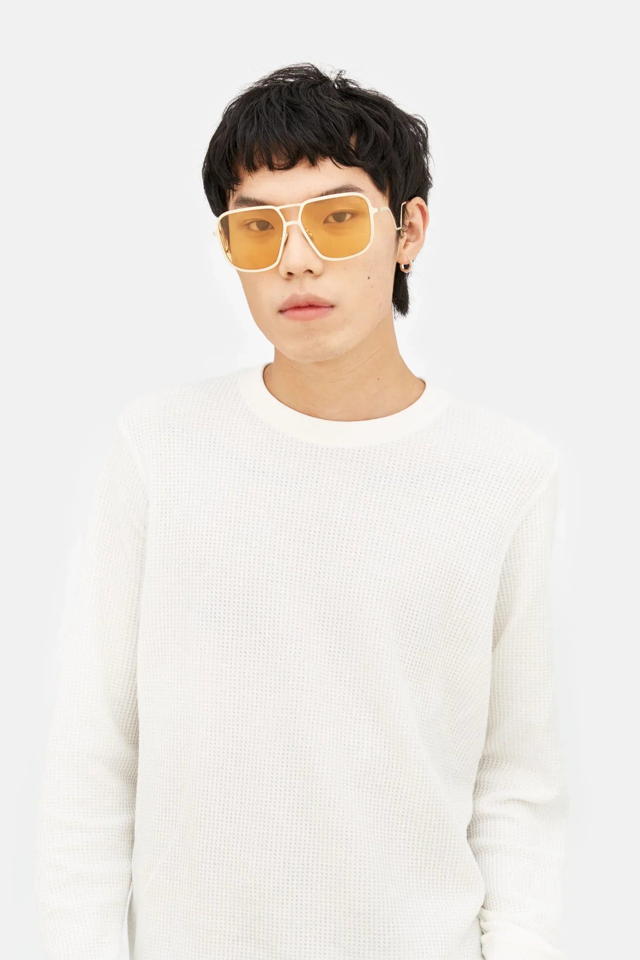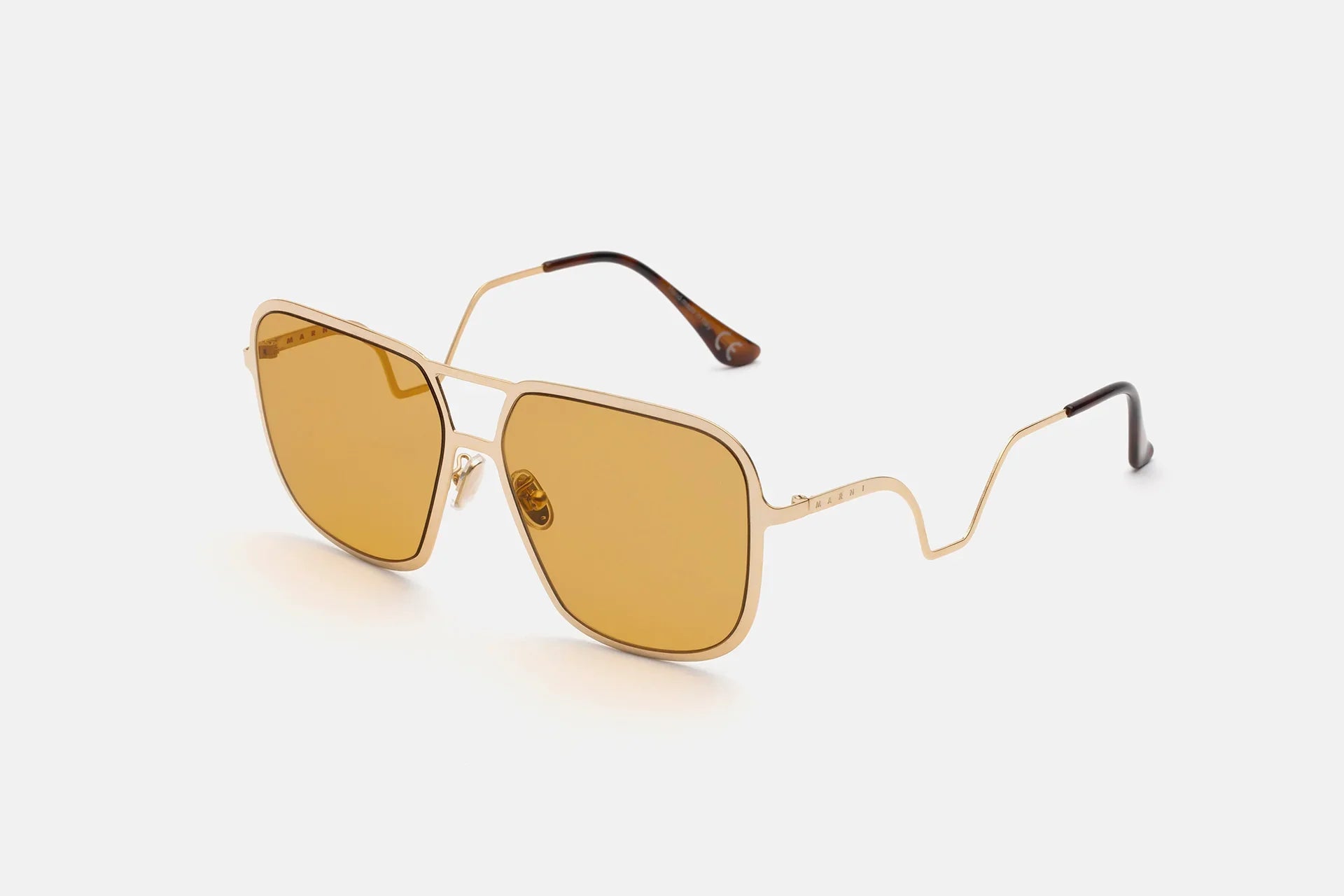 Designed exclusively for Marni, Ha Long Bay is a sleek silhouette carved out of a single sheet of shiny metal. The model features squared lenses encased within flat metal rims with a double nose-bridge. The key feature of the model are its curved temples with acetate tips. The model comes with shiny gold metal finish and bright yellow lenses.