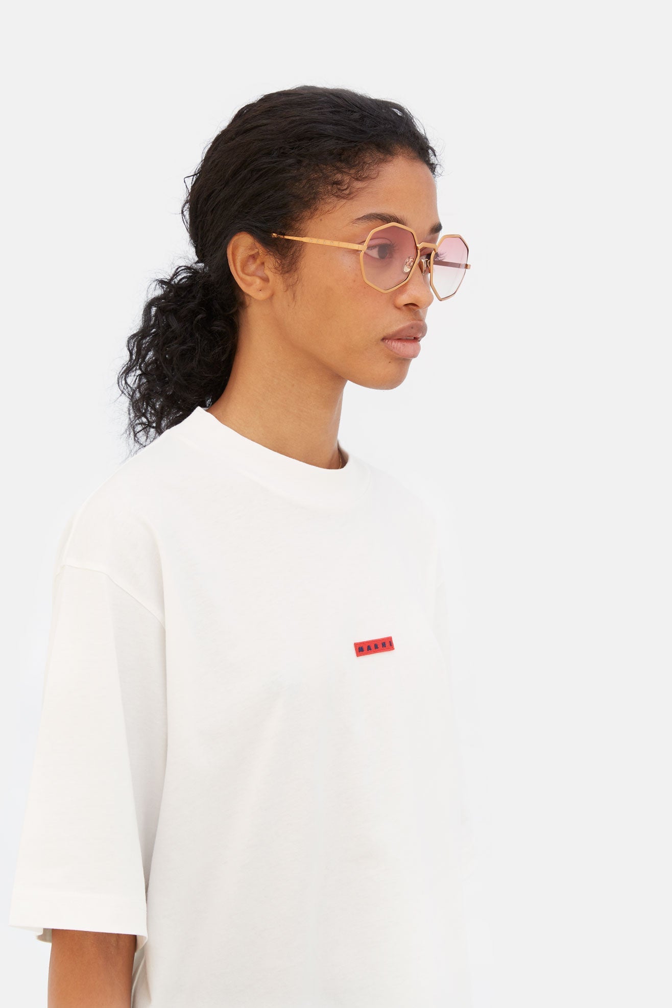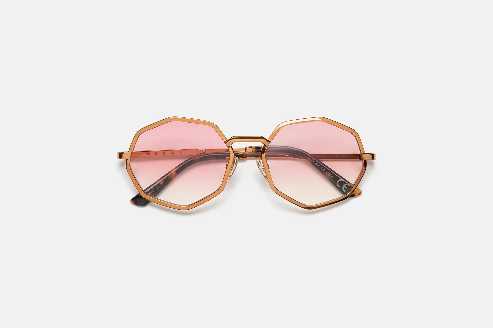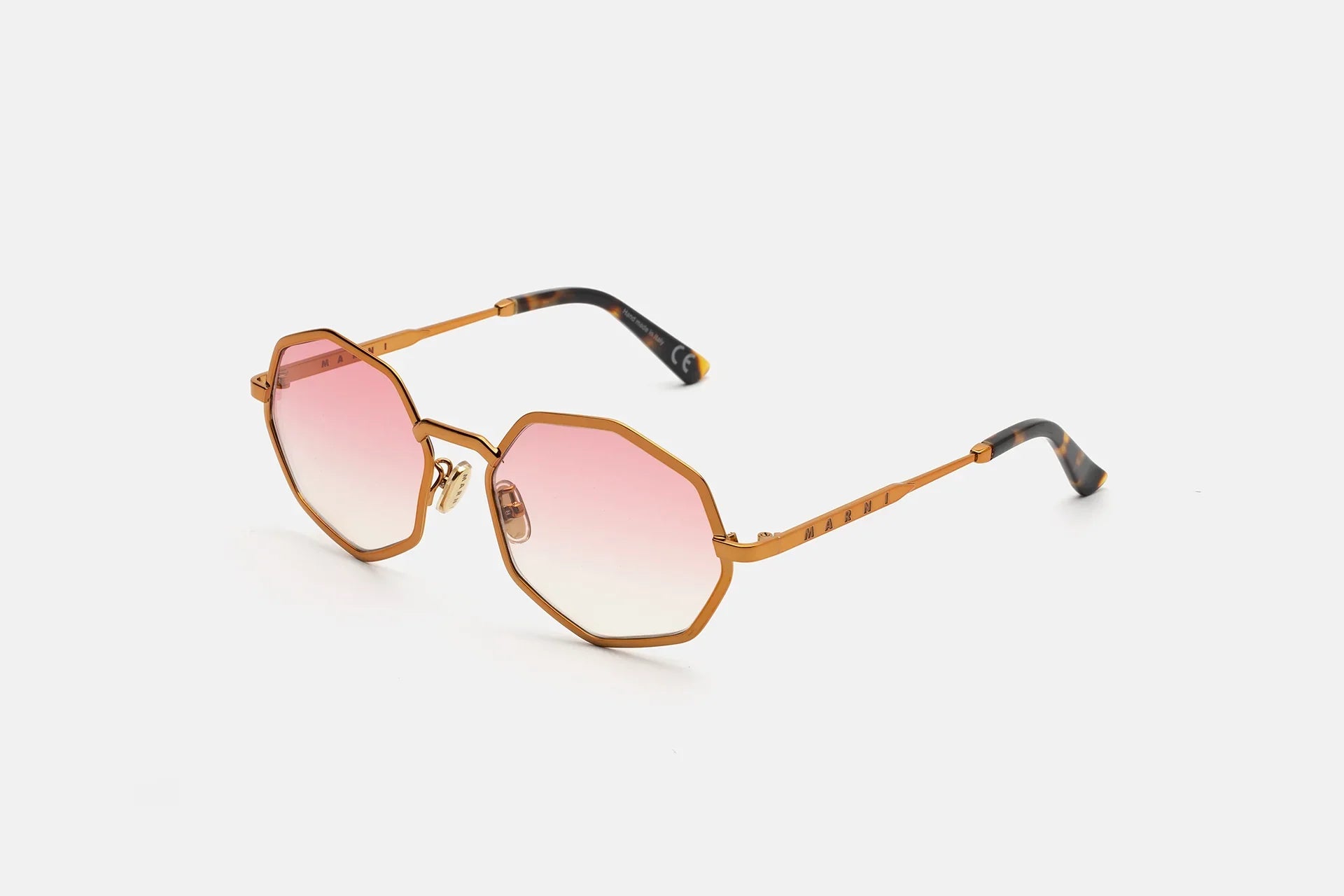 Pulpit Rock is an exclusive silhouette designed for Marni that features an all-metal construction. An edgy, innovative shape Pulpit Rock is an oversized model designed with reference to 1970s eclecticism, updated for a fresh contemporary aesthetics. Its oversized lenses are encased within angular, octagonal rims elevating the classic metal designs. This model comes in gold metal finish and pink tinted lenses.