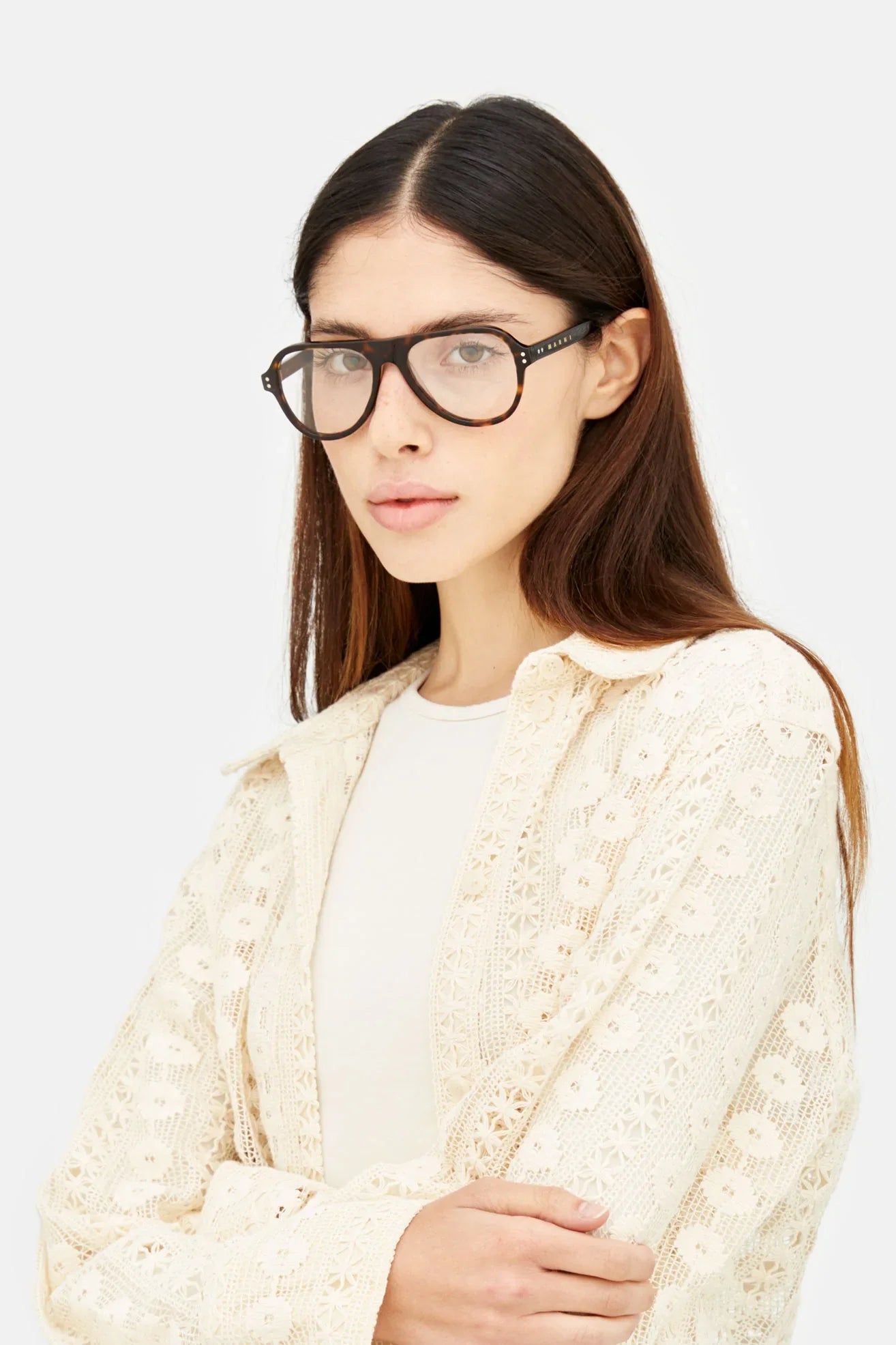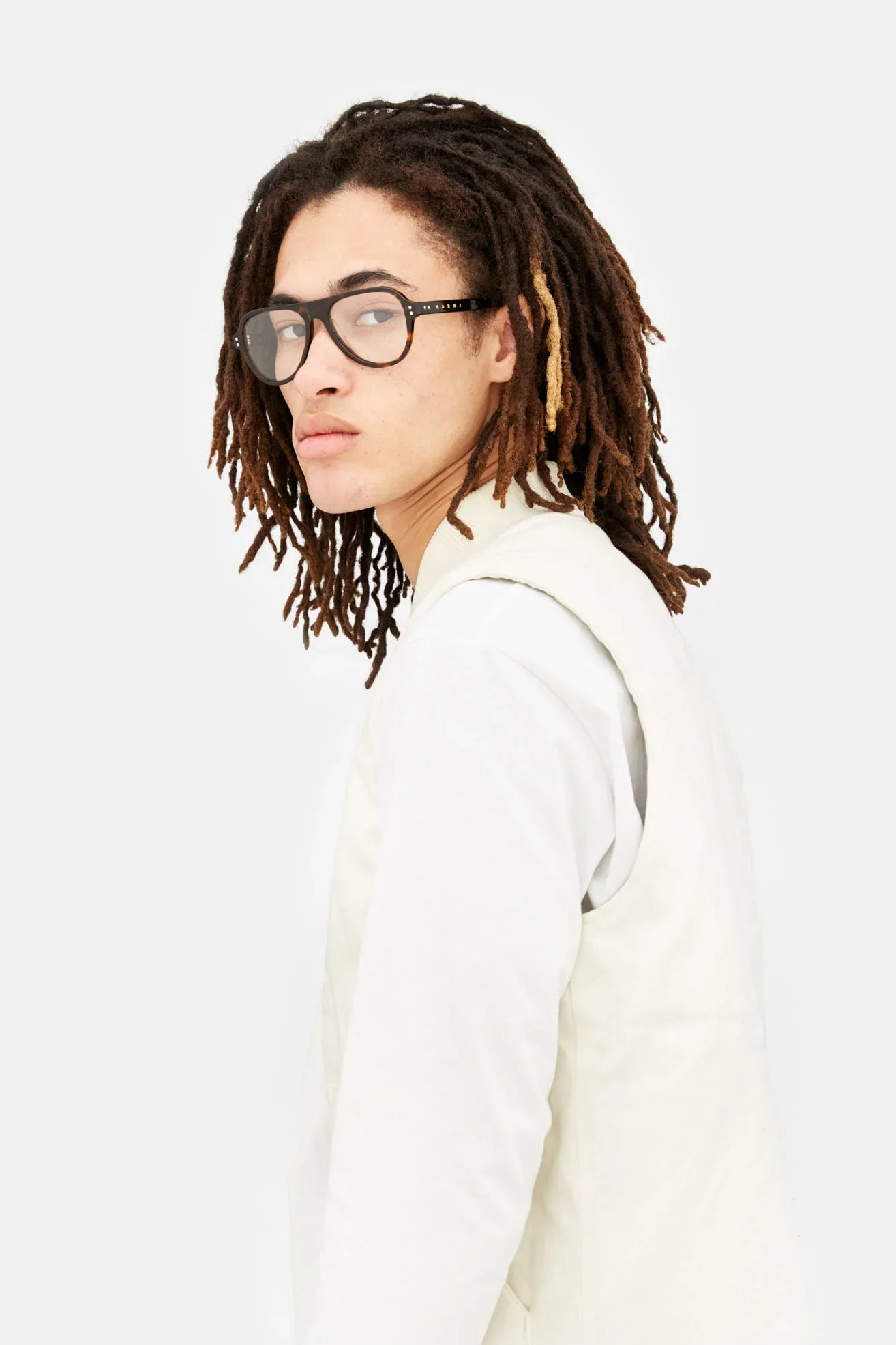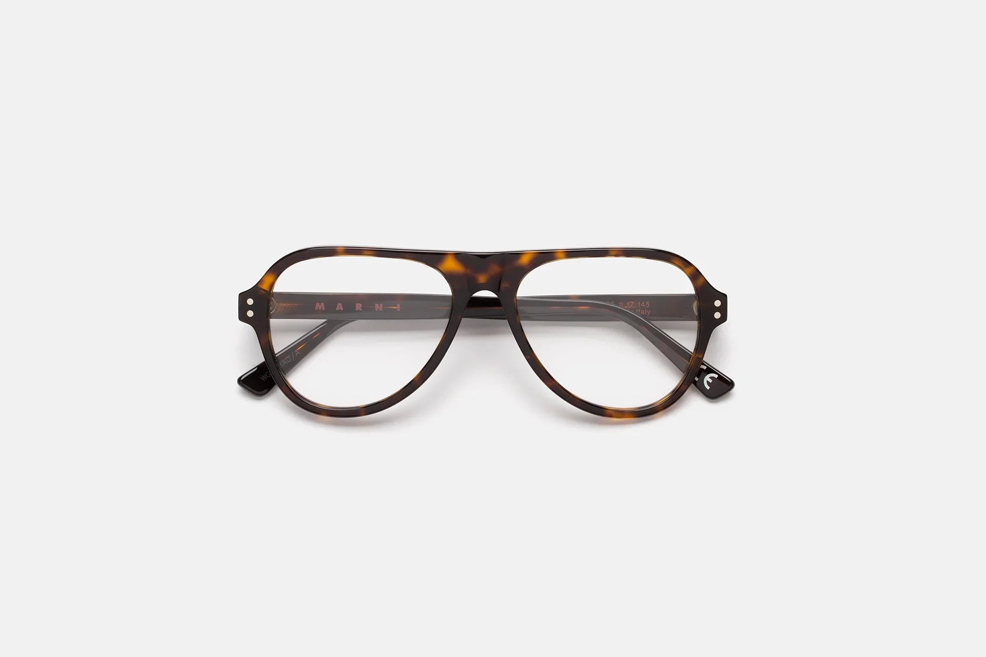 Designed exclusively for Marni, Blue Ridge Mountains is a bold optical silhouette characterised by a classic tear-drop shape crafted from thick Italian acetate. The model’s curved rims were carved for lightness in use, without compromising its aesthetic impact. This model comes in dark Havana acetate with metal rivets on the temples.