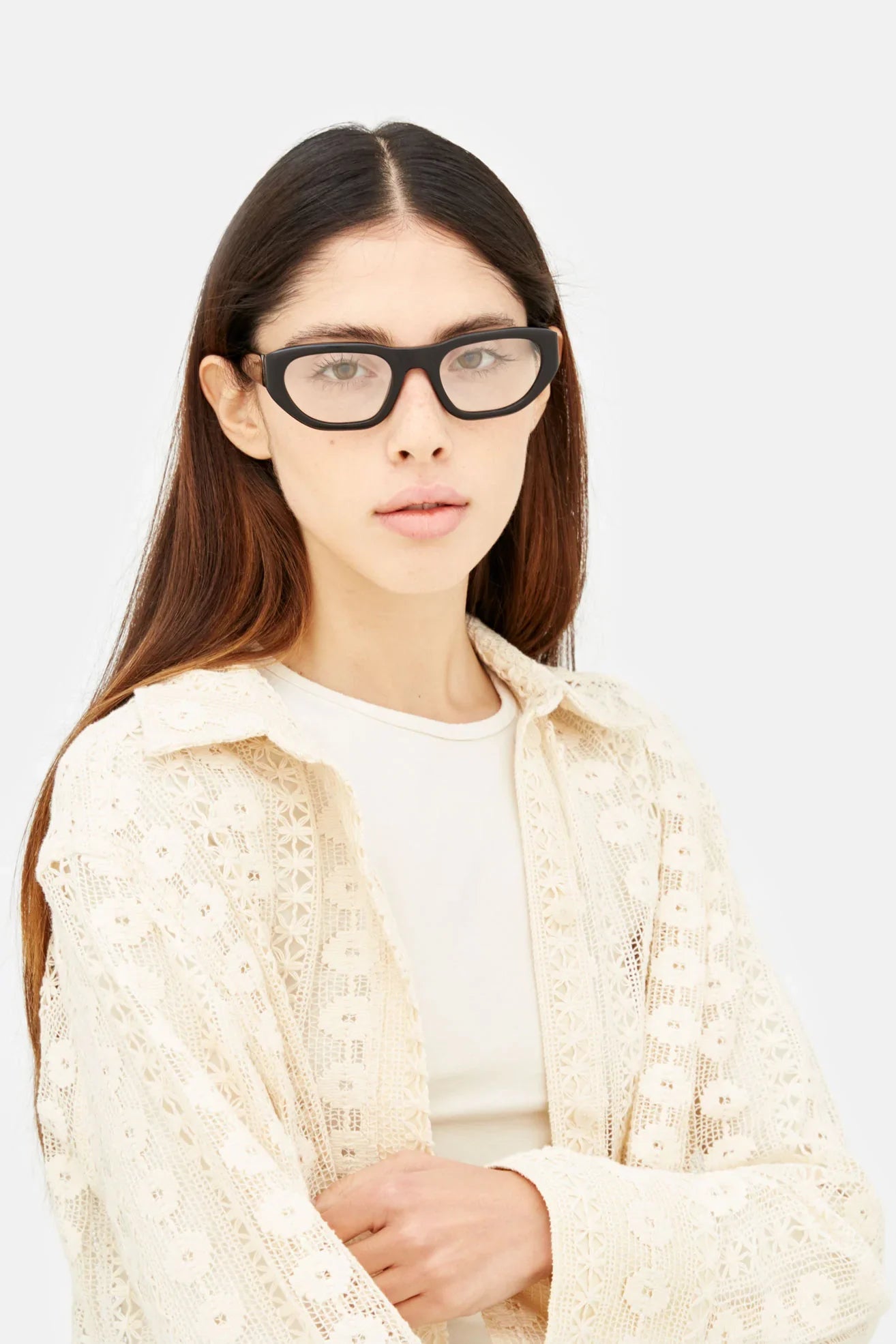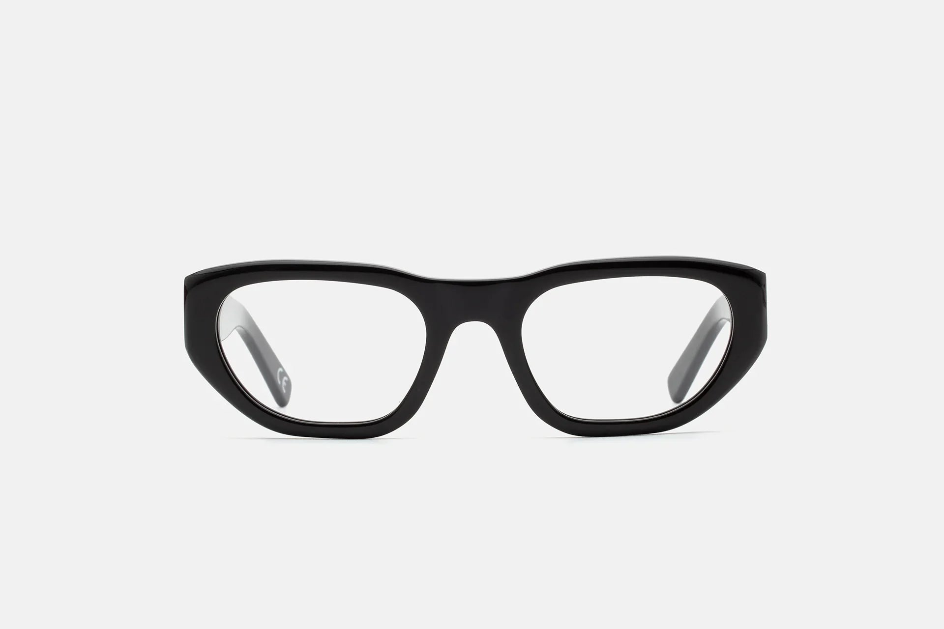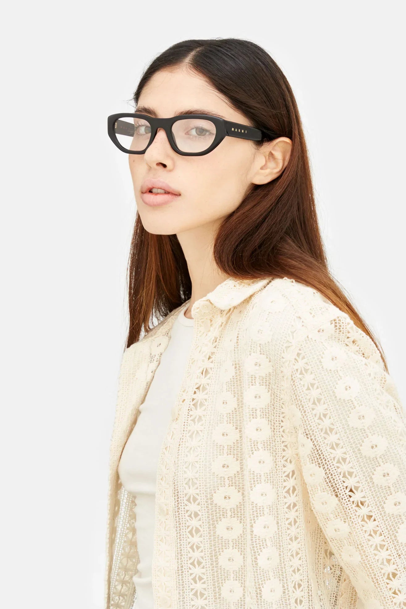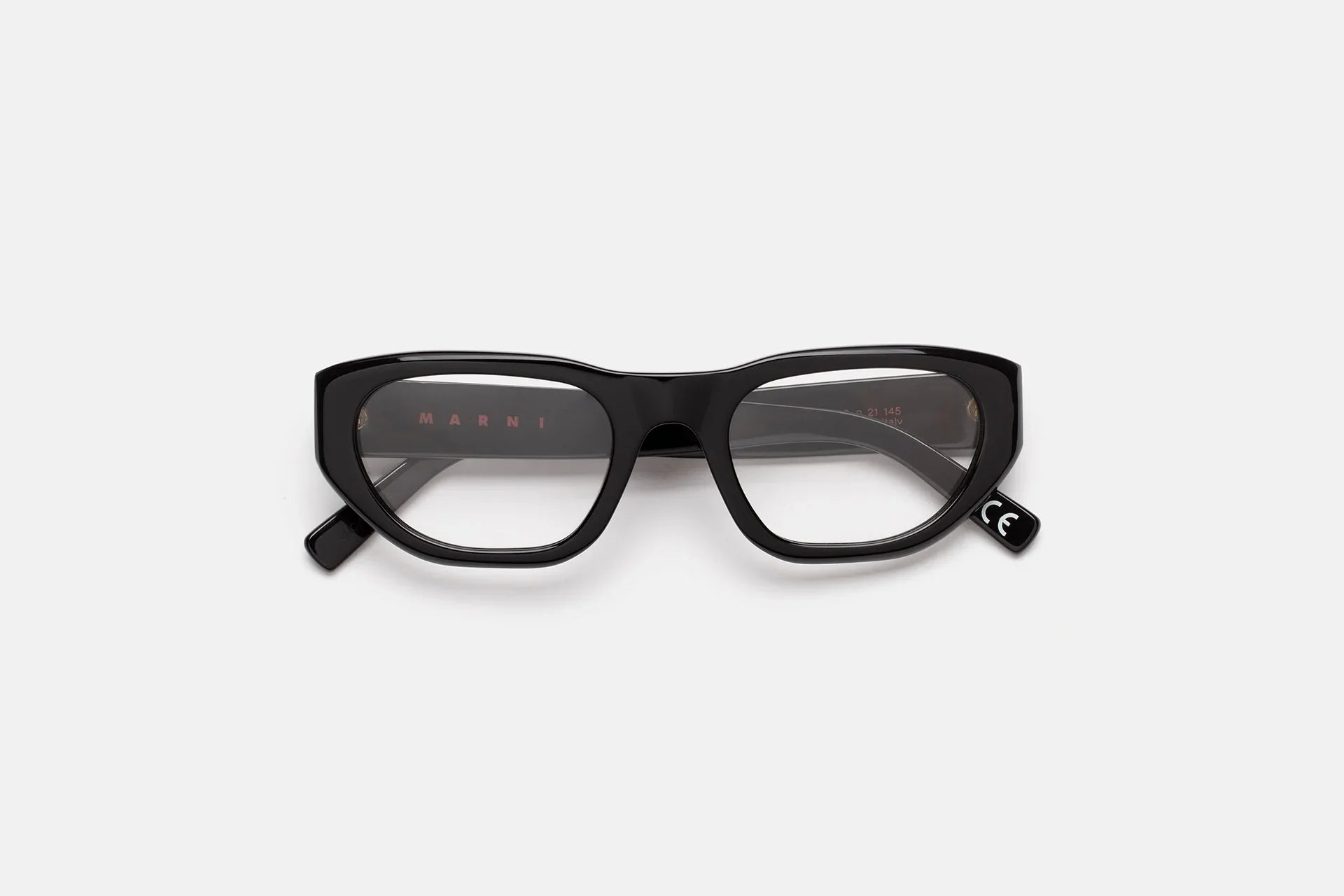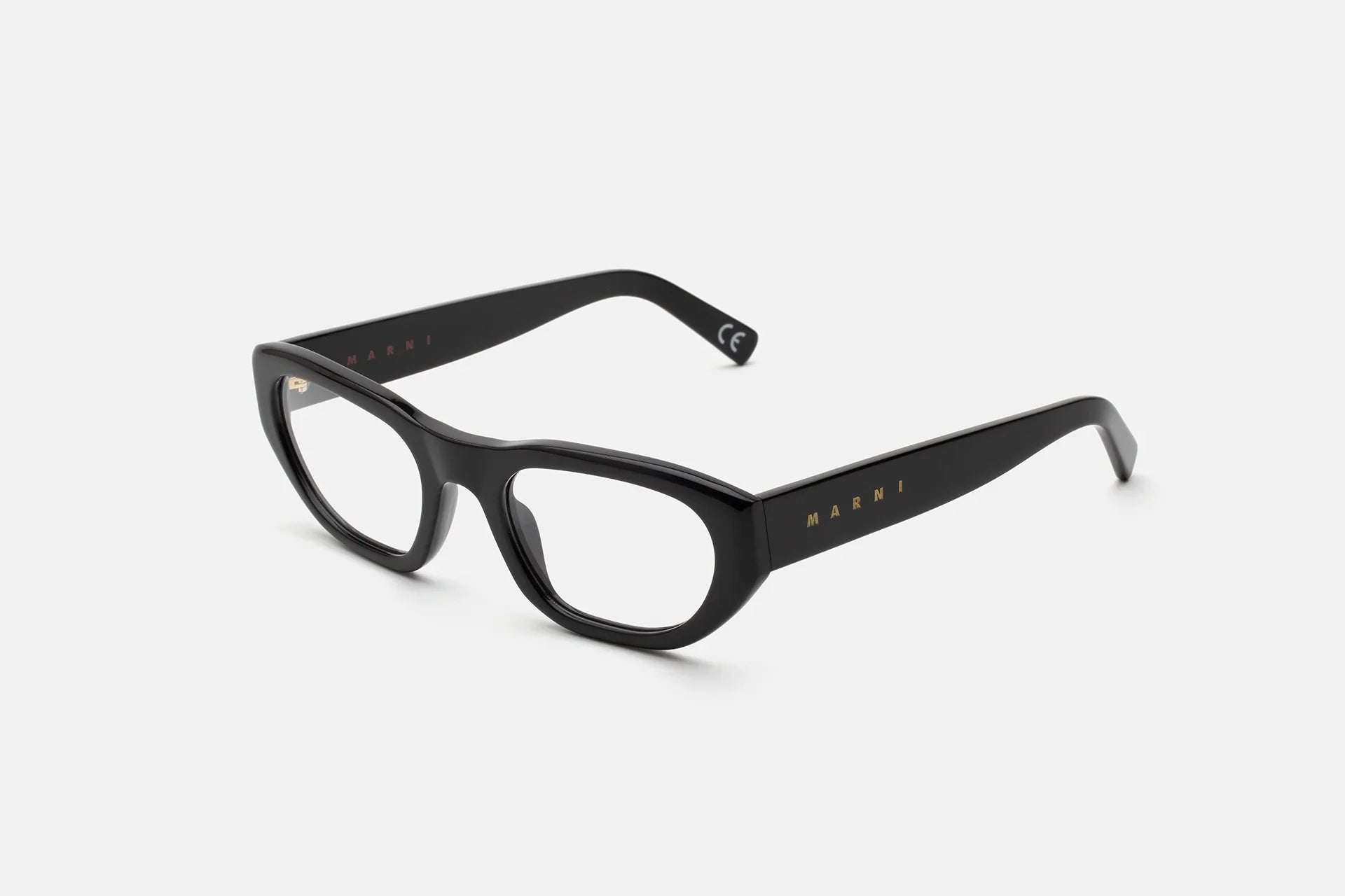 Designed exclusively for Marni, Laamu Atoll is a chunky Optical silhouette characterised by a wide, horizontal shape and a bold brow-line. The model’s thick acetate rims were carefully carved for comfort in use, with curved lines around the lenses and a slanted profile. This version comes in black acetate.