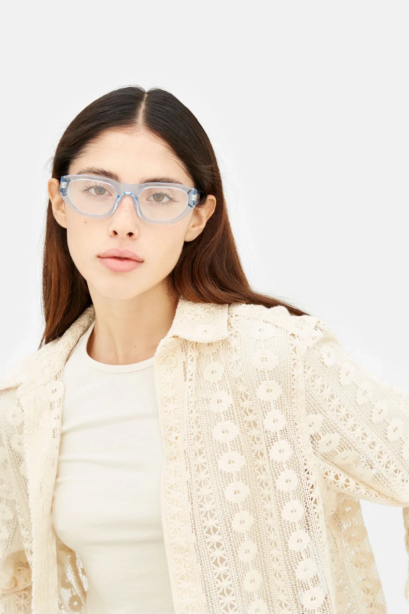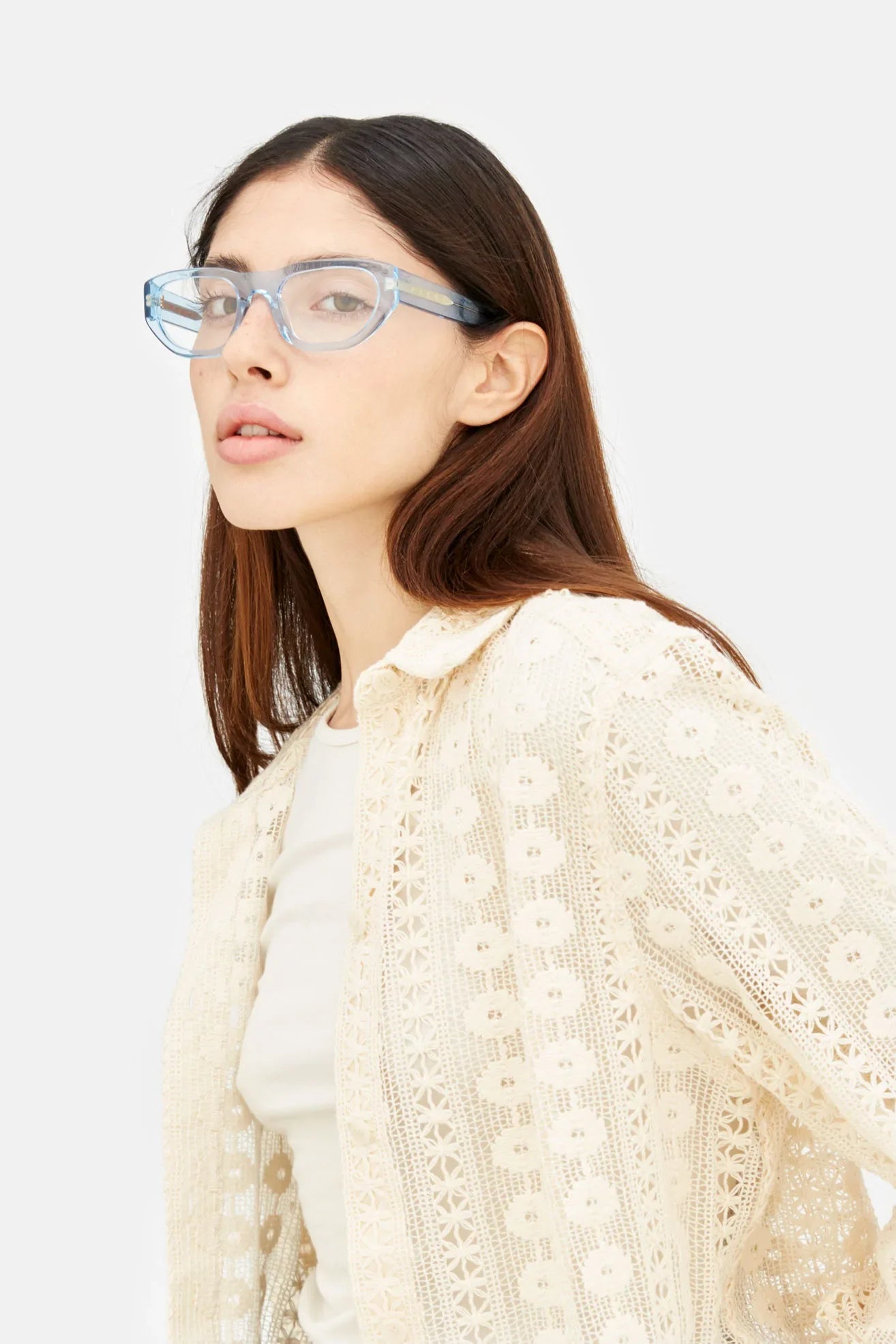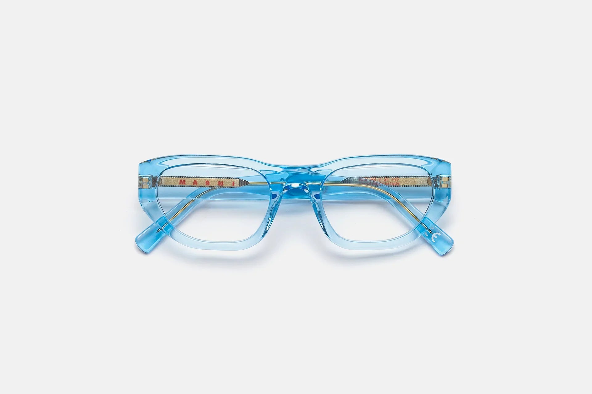 Designed exclusively for Marni, Laamu Atoll is a chunky Optical silhouette characterised by a wide, horizontal shape and a bold brow-line. The model’s thick acetate rims were carefully carved for comfort in use, with curved lines around the lenses and a slanted profile. This version comes in a light crystal blue acetate.