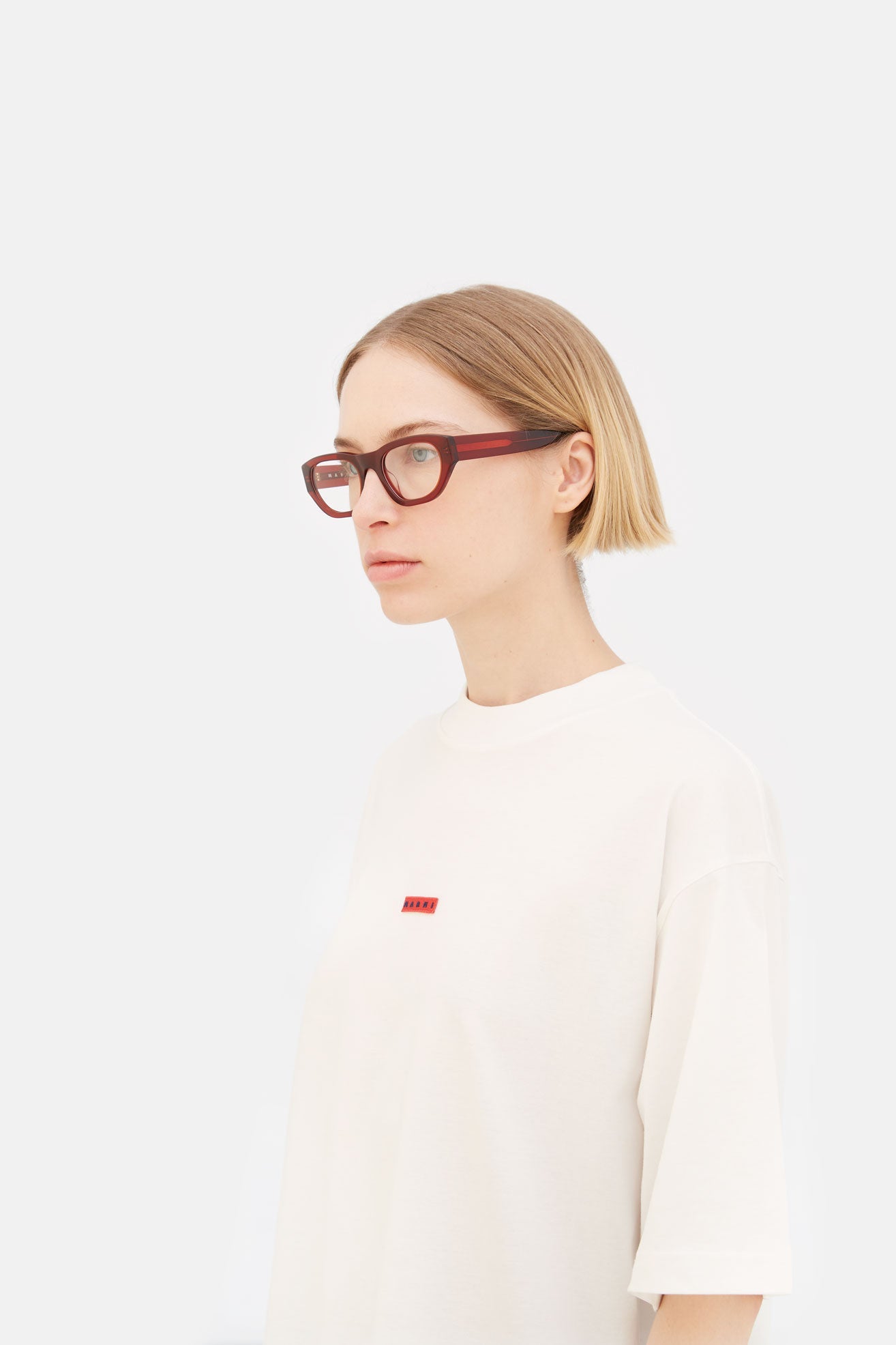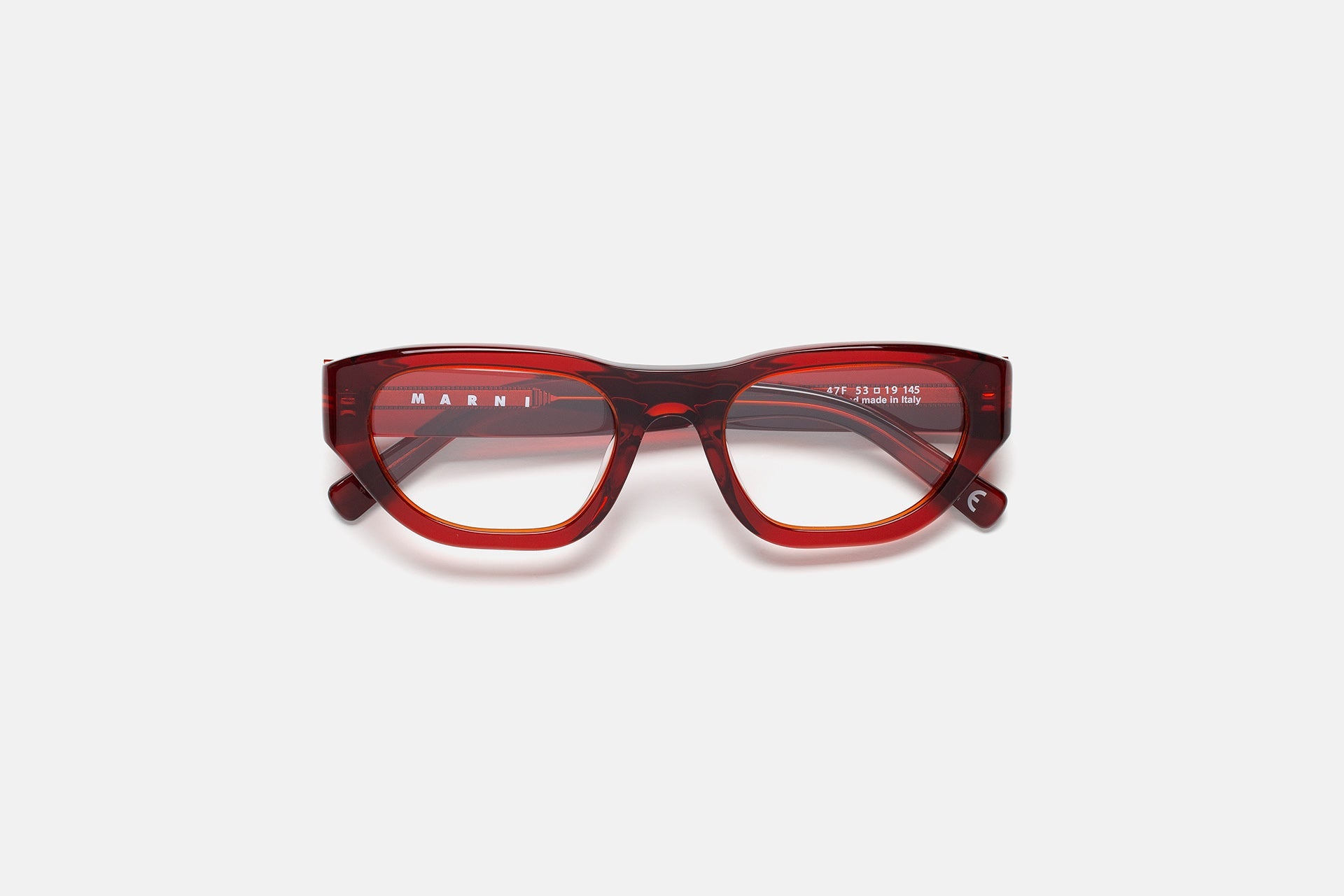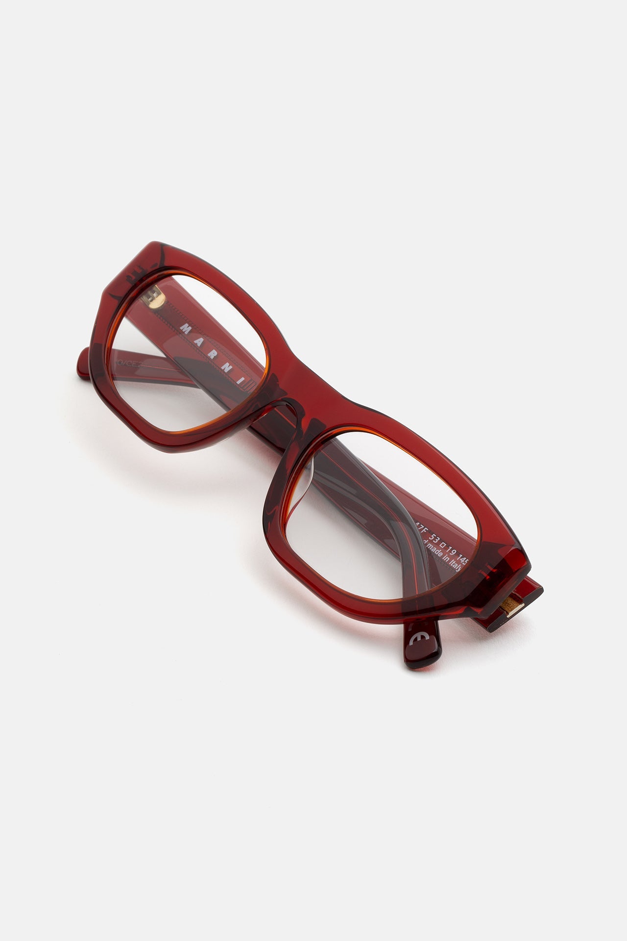 Laamu Atoll is a unique Optical silhouette designed exclusively for Marni. The model is a sophisticated version of wide, slightly oversized everyday frames, featuring sharp geometric detailing and chunky acetate rims. This is a stand-out design that highlights Marni’s eclectic approach to style. This version comes in a shiny deep red acetate.