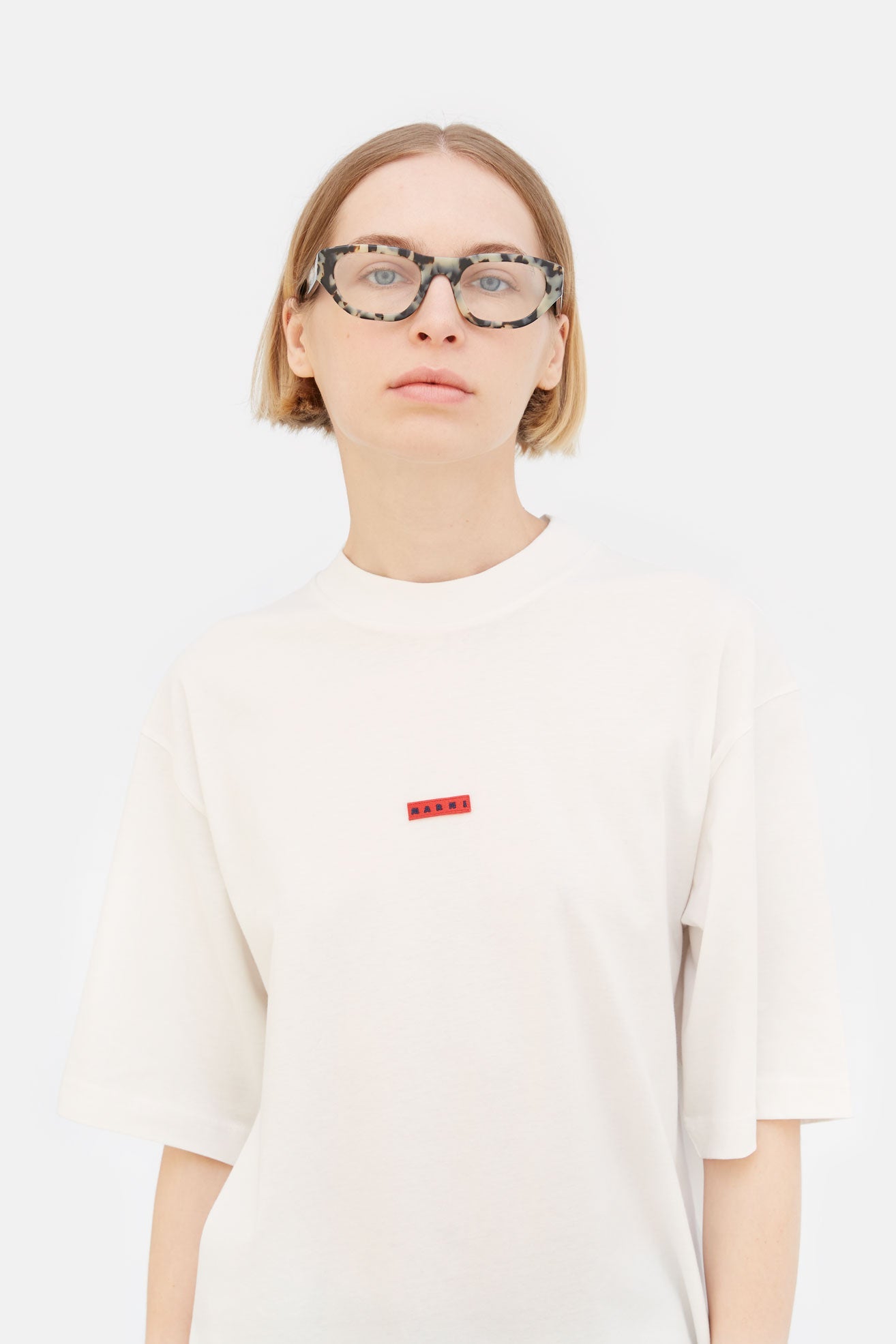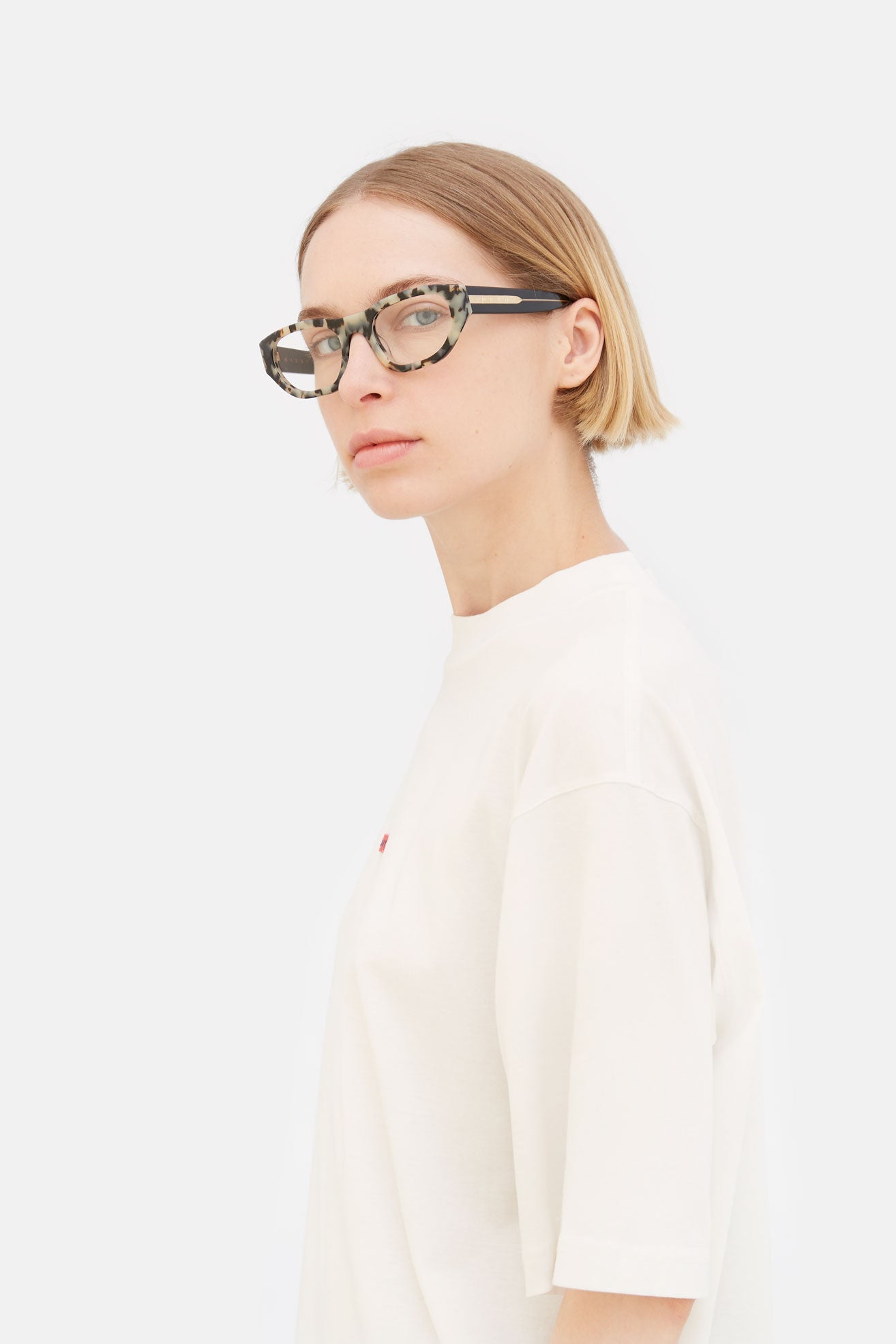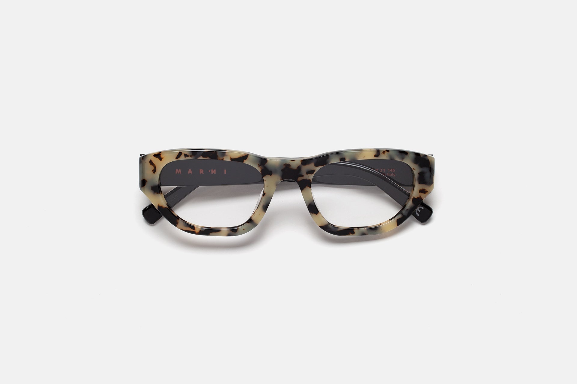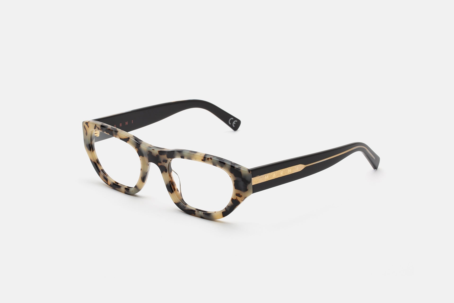 Laamu Atoll is a unique Optical silhouette designed exclusively for Marni. The model is a sophisticated version of wide, slightly oversized everyday frames, featuring sharp geometric detailing and chunky acetate rims. This is a stand-out design that highlights Marni’s eclectic approach to style. This version comes in a black and white spotted acetate.