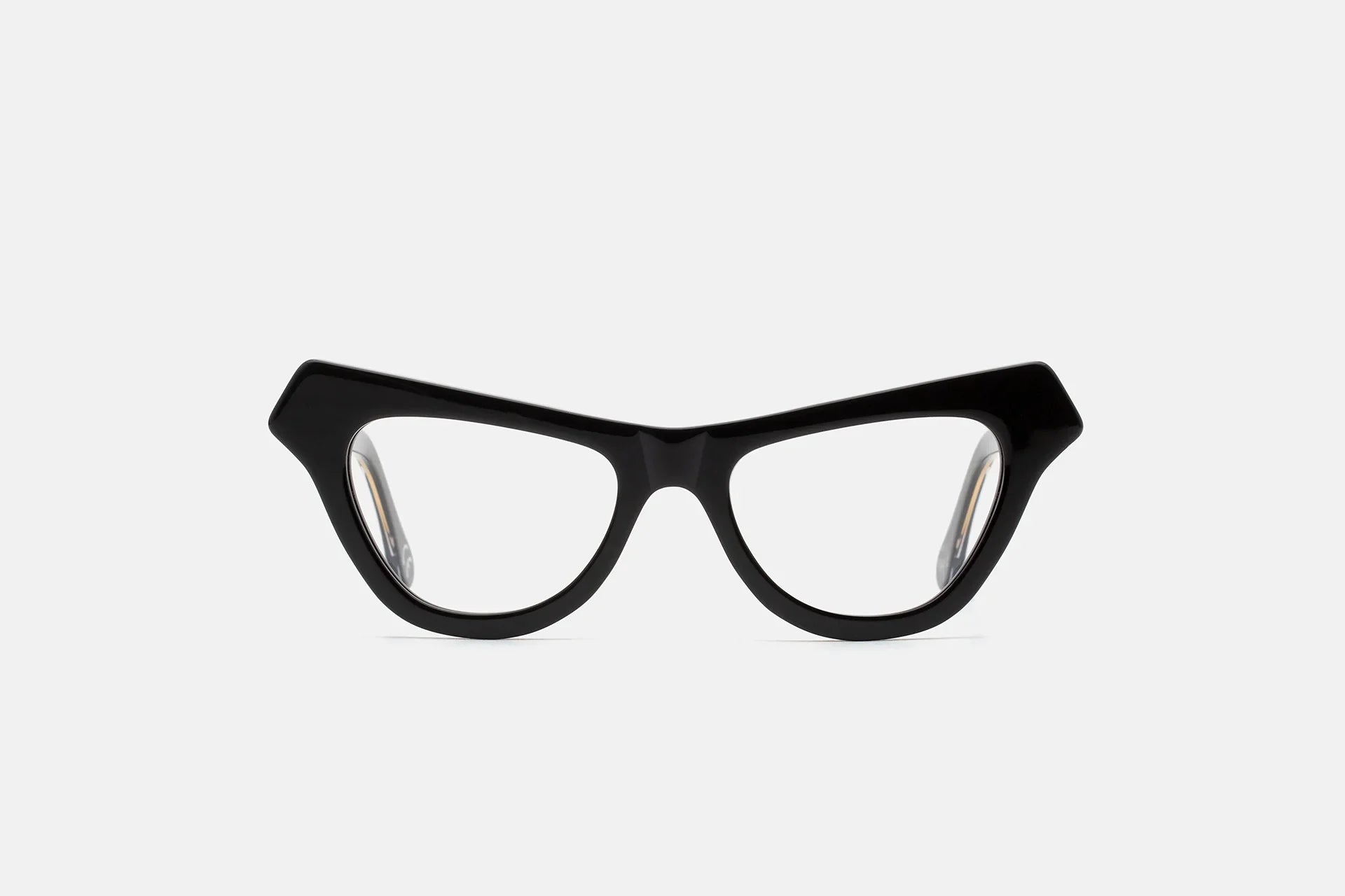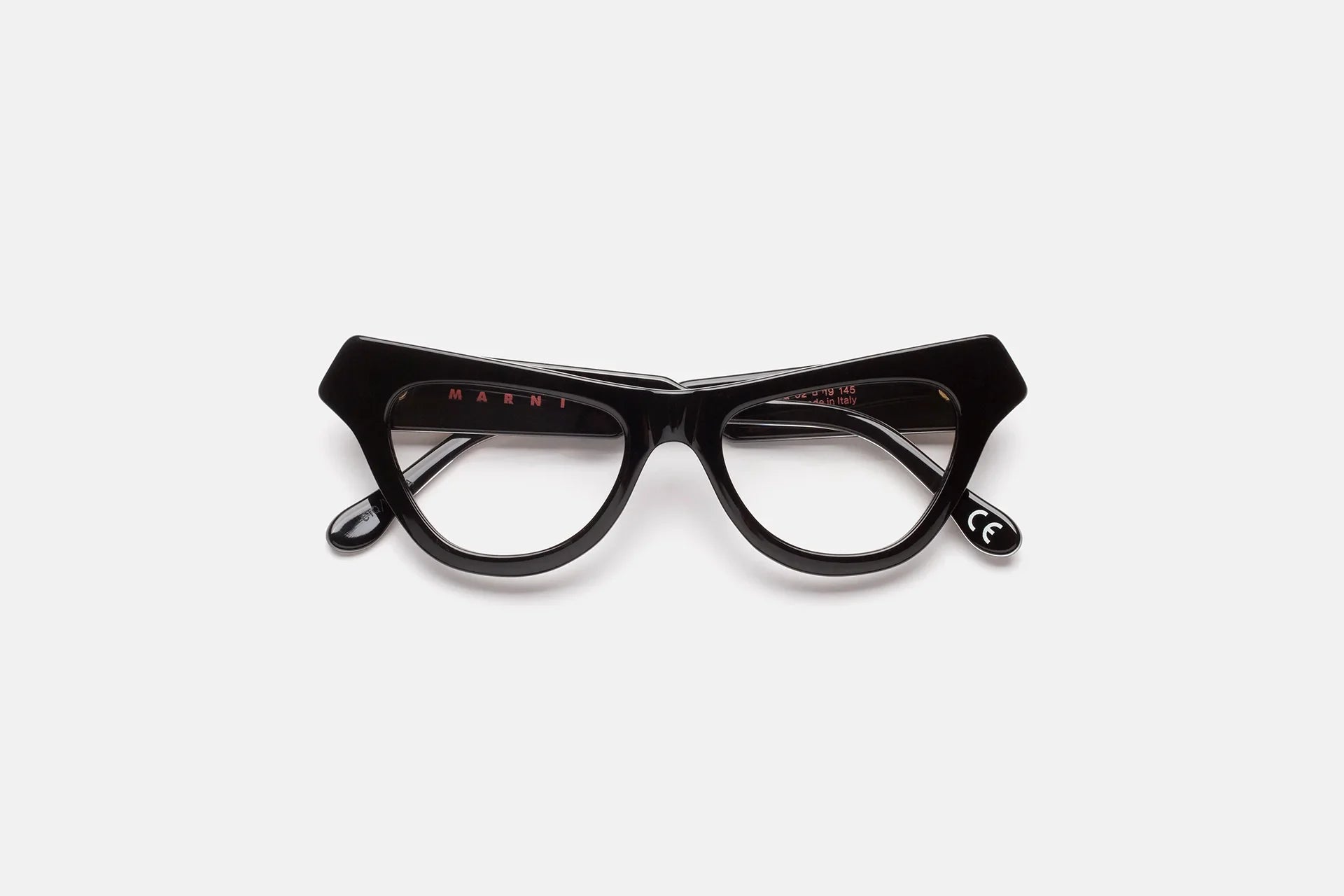 Designed exclusively for Marni, Jeju Island is a bold Optical frame characterised by a chunky acetate construction and sculpted rims. The model is a unique reinterpretation of cat-eye shapes, with triangular lenses and a pointed front. The unique v-shaped browline is matched by softly curved lenses. This version features an all-black acetate.