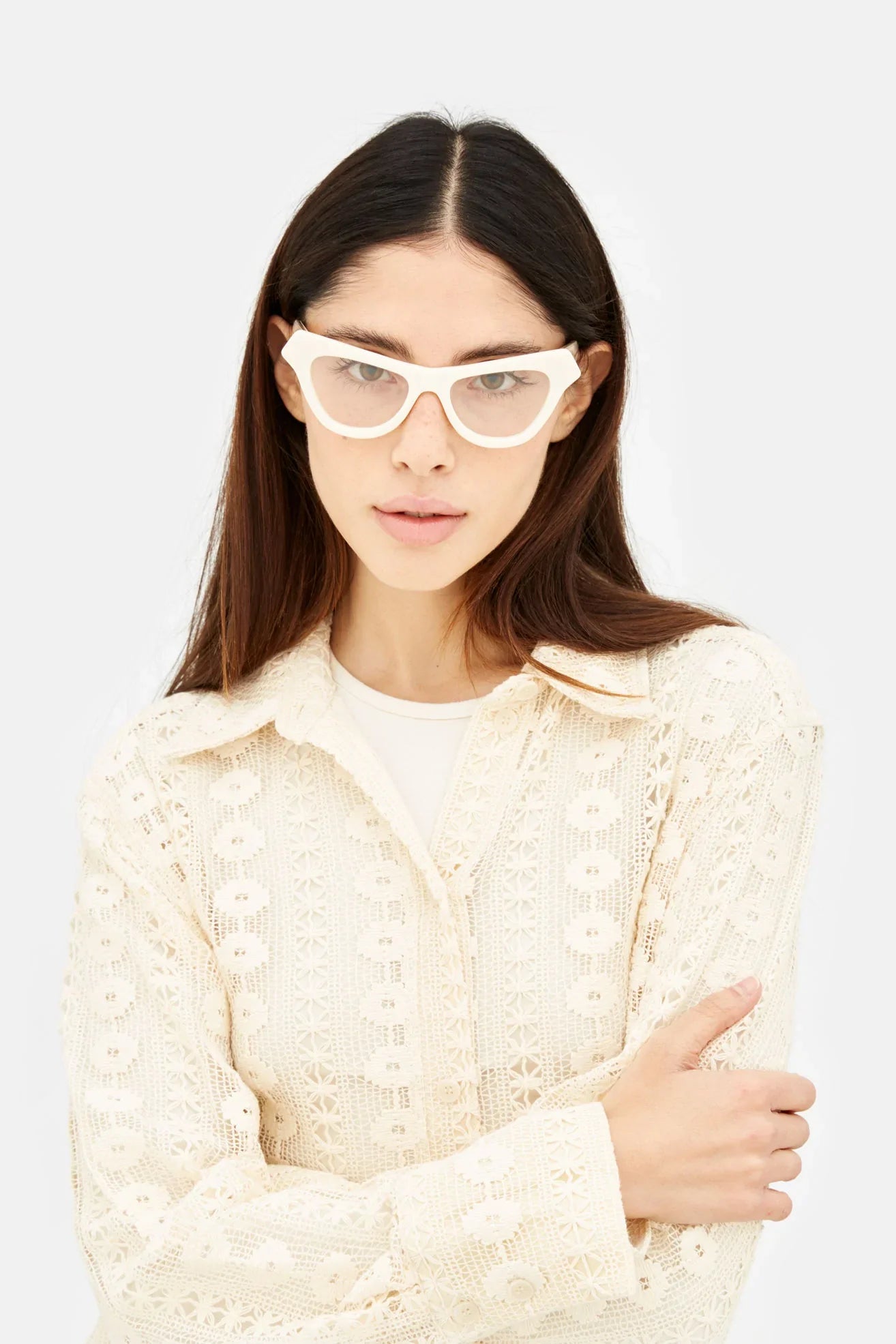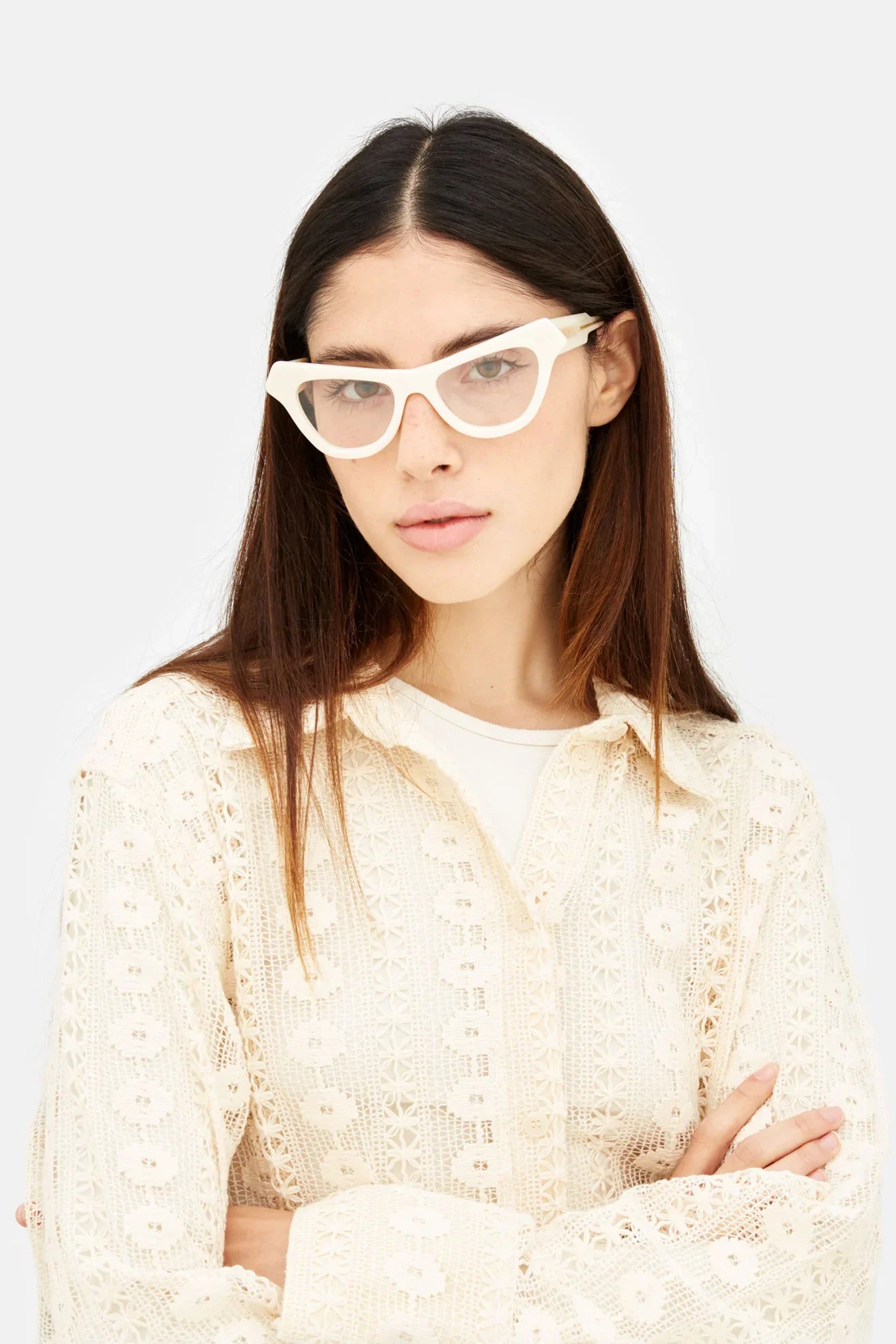 Designed exclusively for Marni, Jeju Island is a bold Optical frame characterised by a chunky acetate construction and sculpted rims. The model is a unique reinterpretation of cat-eye shapes, with triangular lenses and a pointed front. The unique v-shaped browline is matched by softly curved lenses. This version features a solid-white acetate.