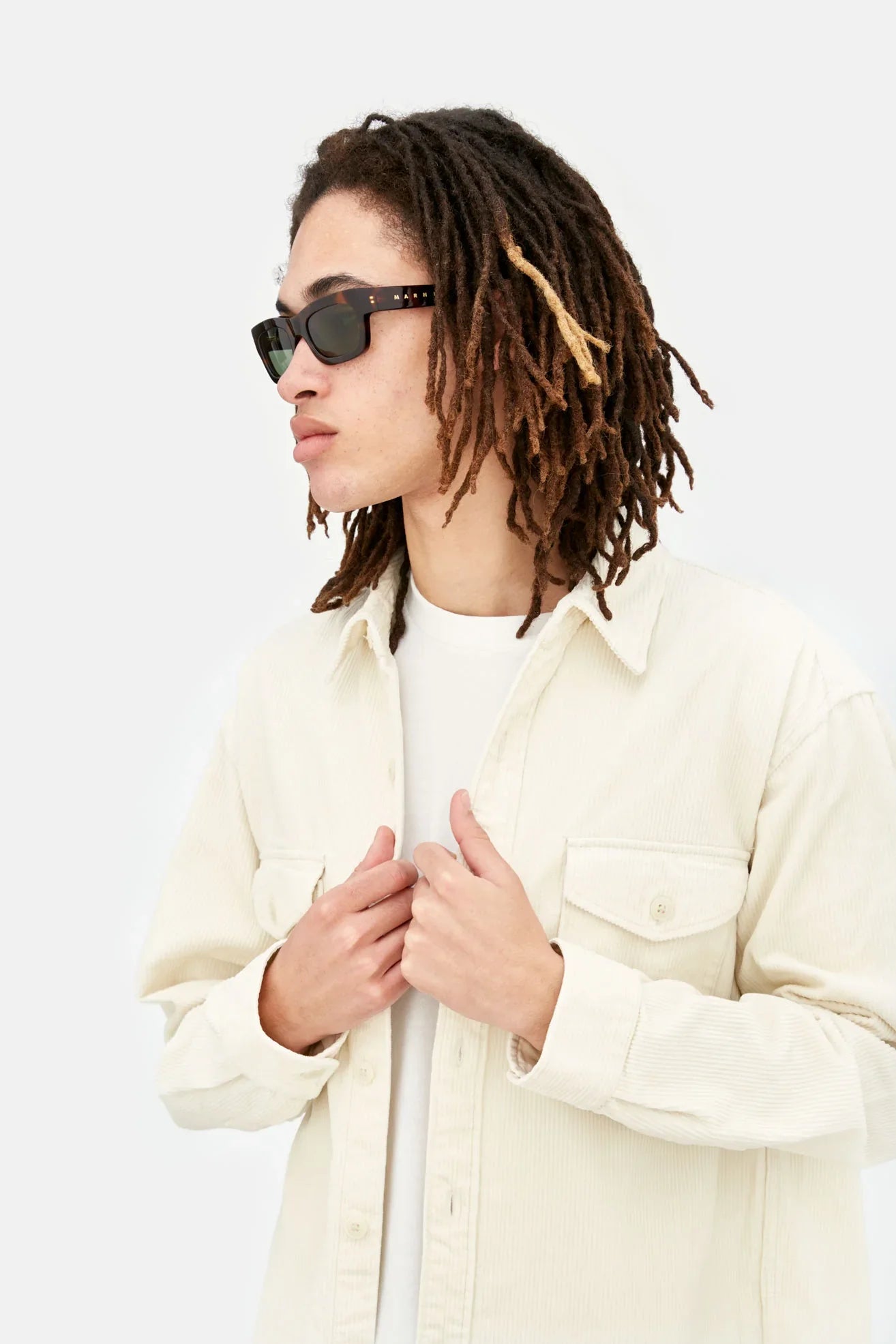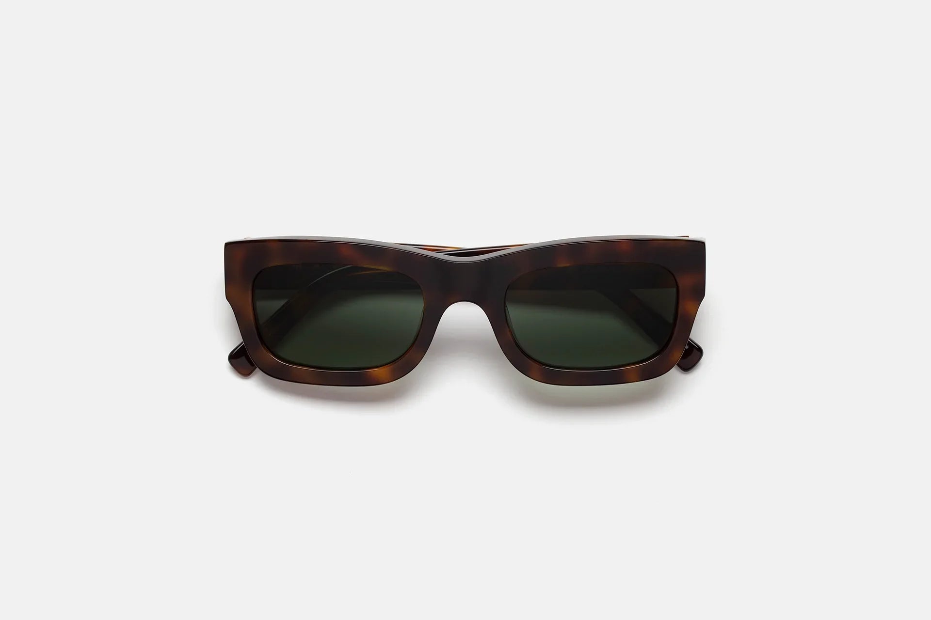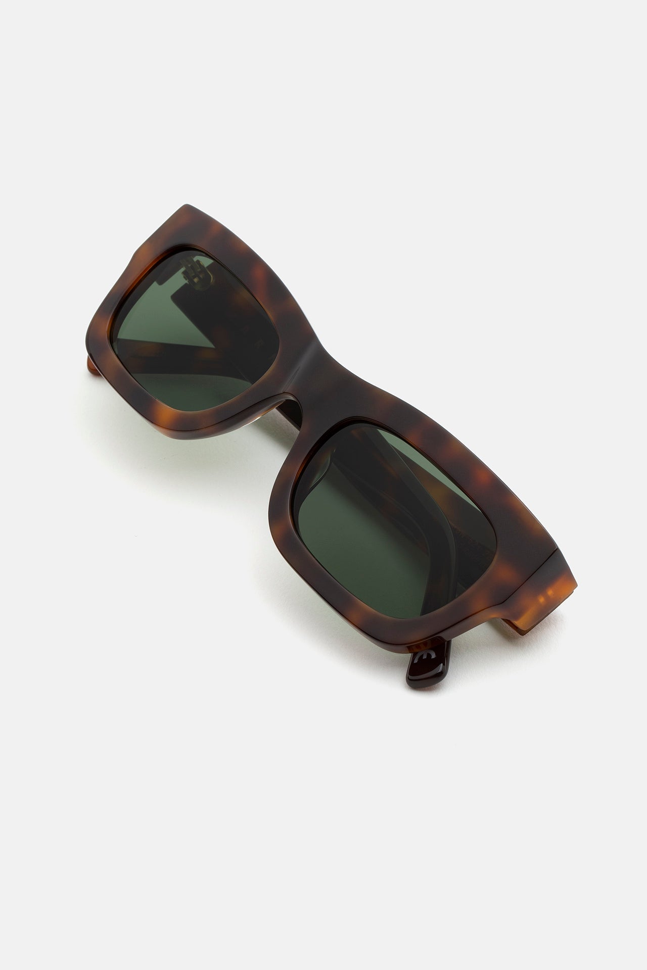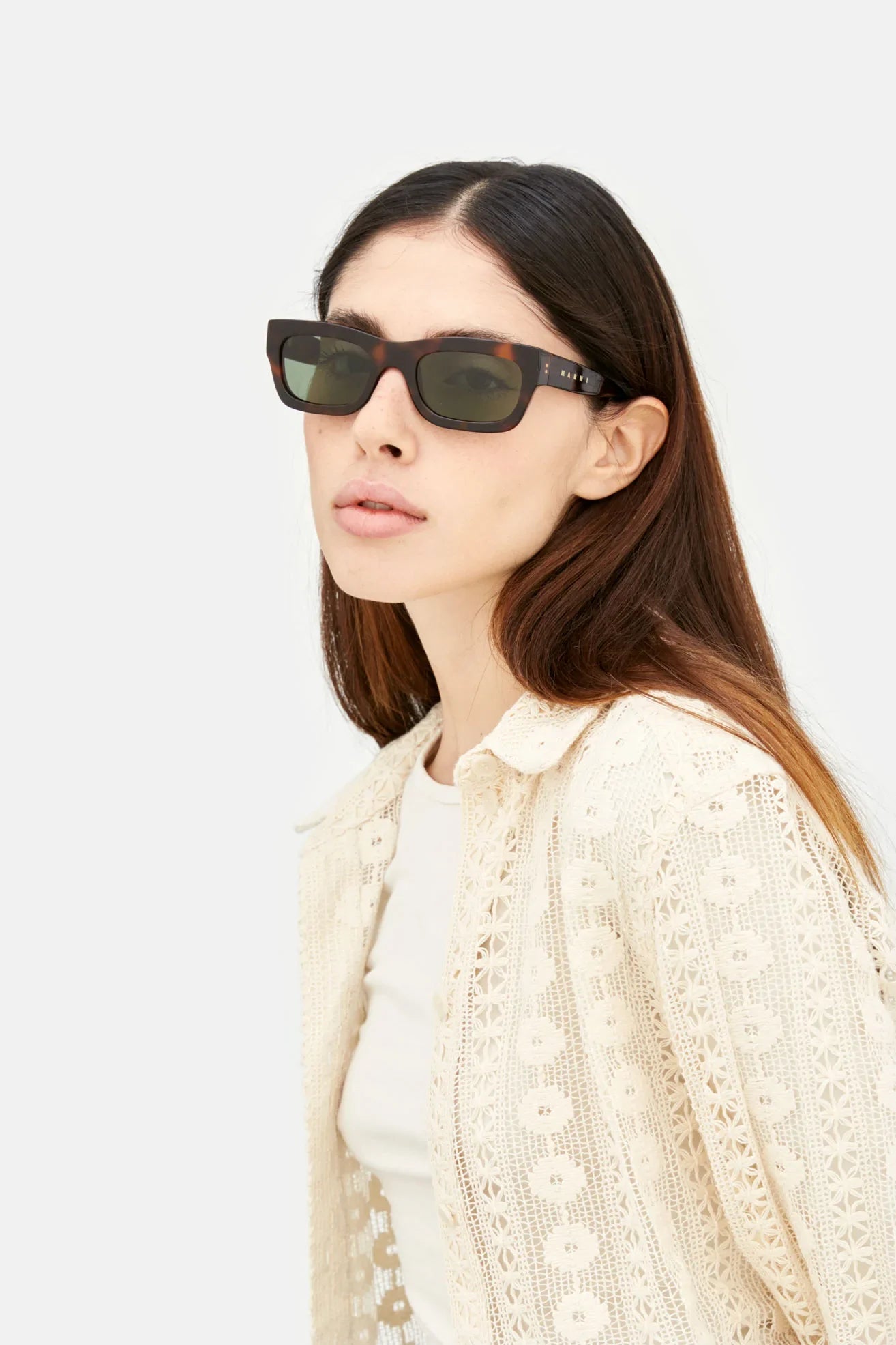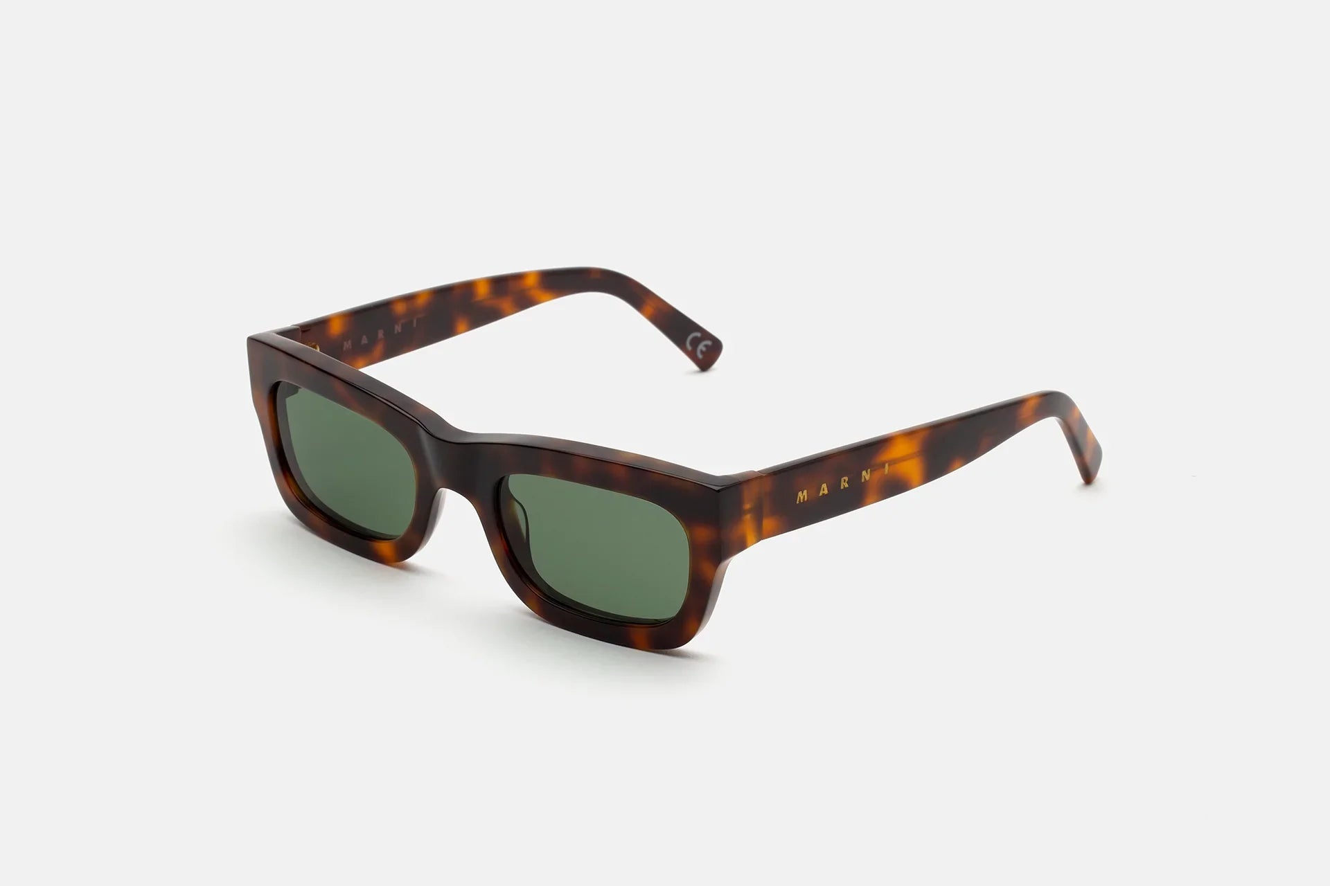 Kawasan Falls was conceived as an everyday essential silhouette, yet with a unique twist. True to Marni’s identity that celebrates quirky style, individualism and originality, these squared acetate glasses feature unexpected detailing. Its straight, geometric temples are wide and sturdy to match its thick front, with a prominent nose bridge and angular rims. This version comes with a warm Havana acetate and bottle green lenses.