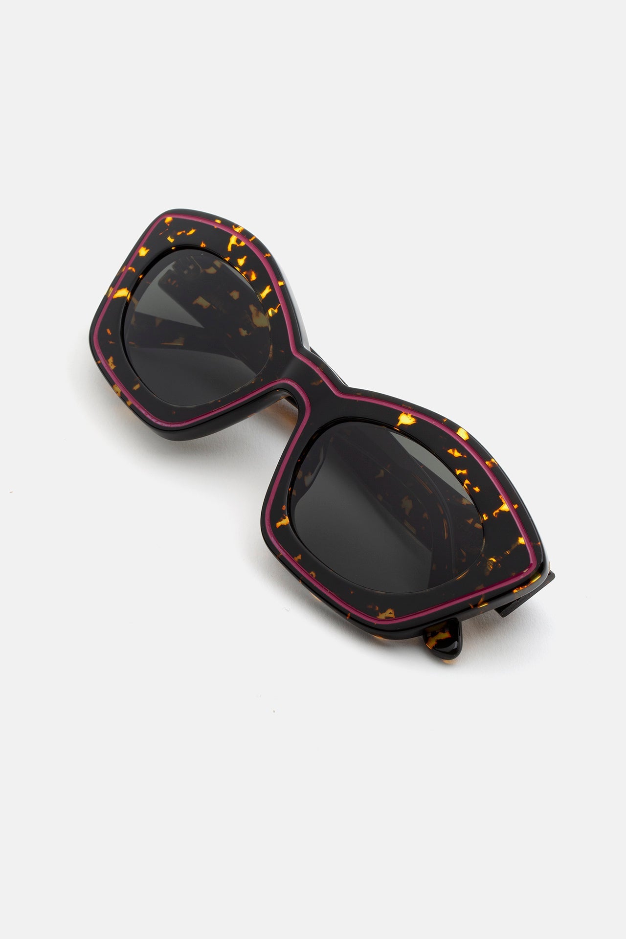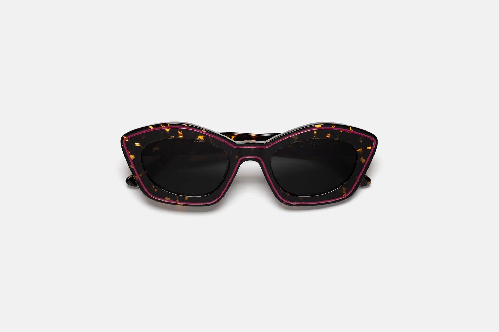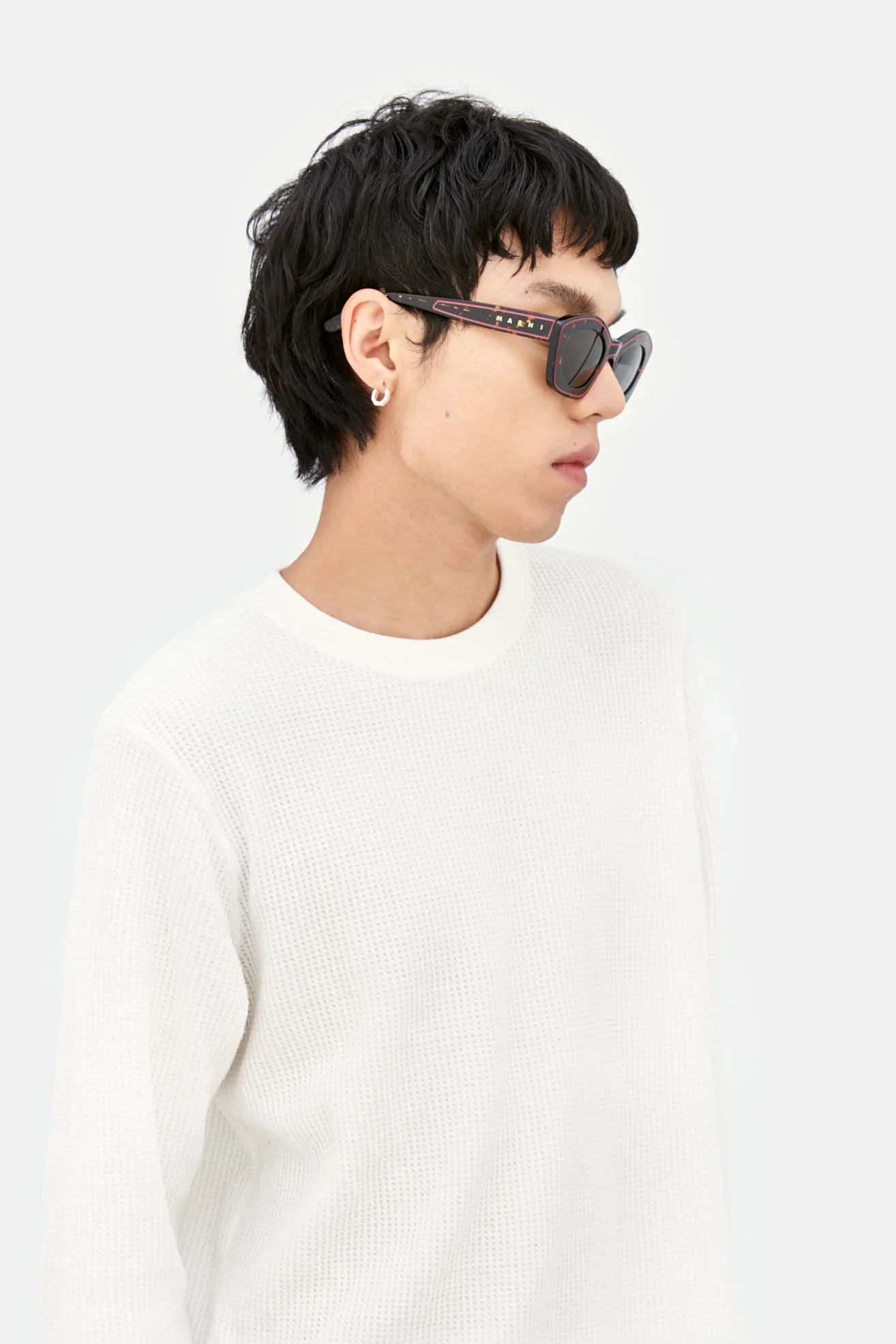 Kea Island is a genderless interpretation of classic cat-eye silhouettes. In-line with Marni’s approach to design, characterised by unique geometries, deconstruction and graphic detailing, these sunglasses are a hybrid piece that matches high-end construction with experimental style. The model features an angular design with a markedly curved rims on the top. The front has been laser engraved and filled with color to further evidence this iconic shape. This version comes with a Havana acetate, red engraving and black lenses.