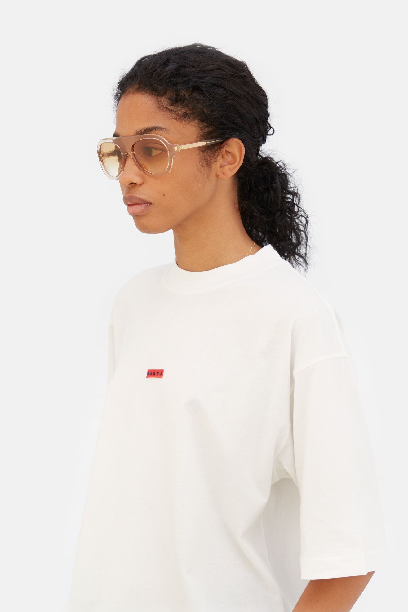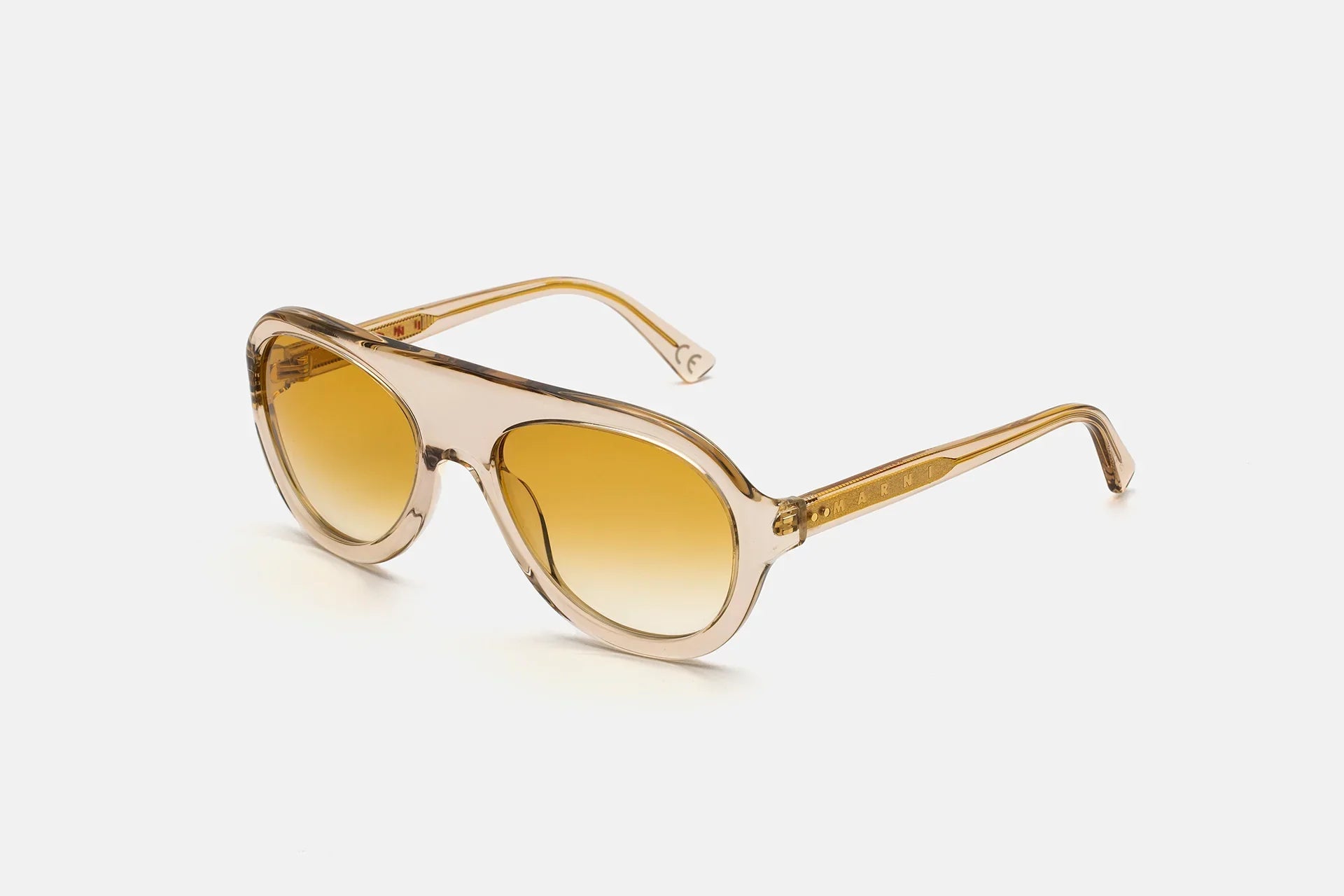 Mount Toc is a bold interpretation of classic aviator-style designs. In true Marni fashion, this timeless design was updated with bold geometries and quirky detailing, for an aesthetics that references 1970s sportswear glamour. Its broad structure features a sturdy nose-bridge and pear-shape lenses encased within chunky acetate rims. A unique detail: wrap-around temple design. This model comes in a crystal resin acetate with light tinted lenses.