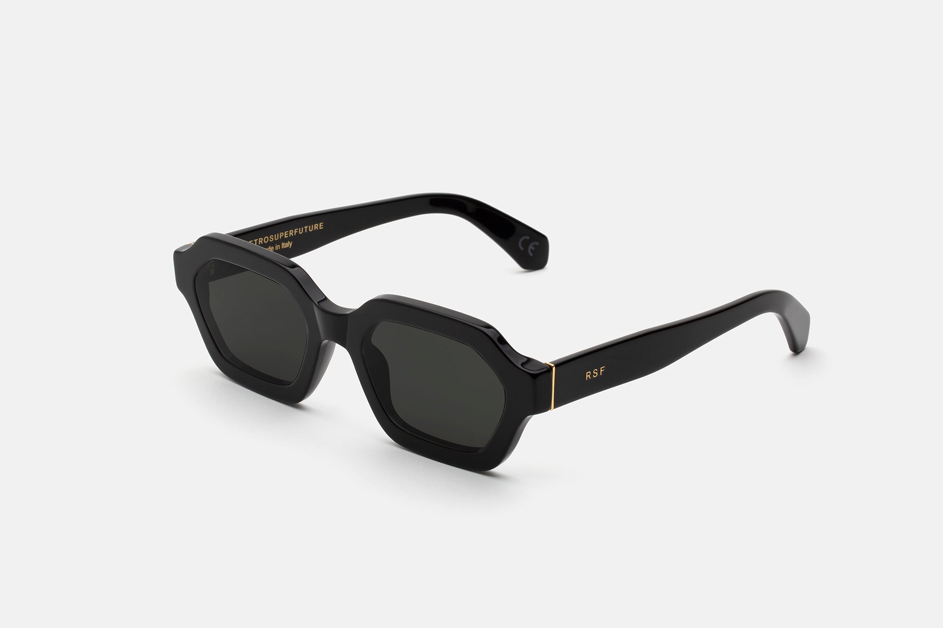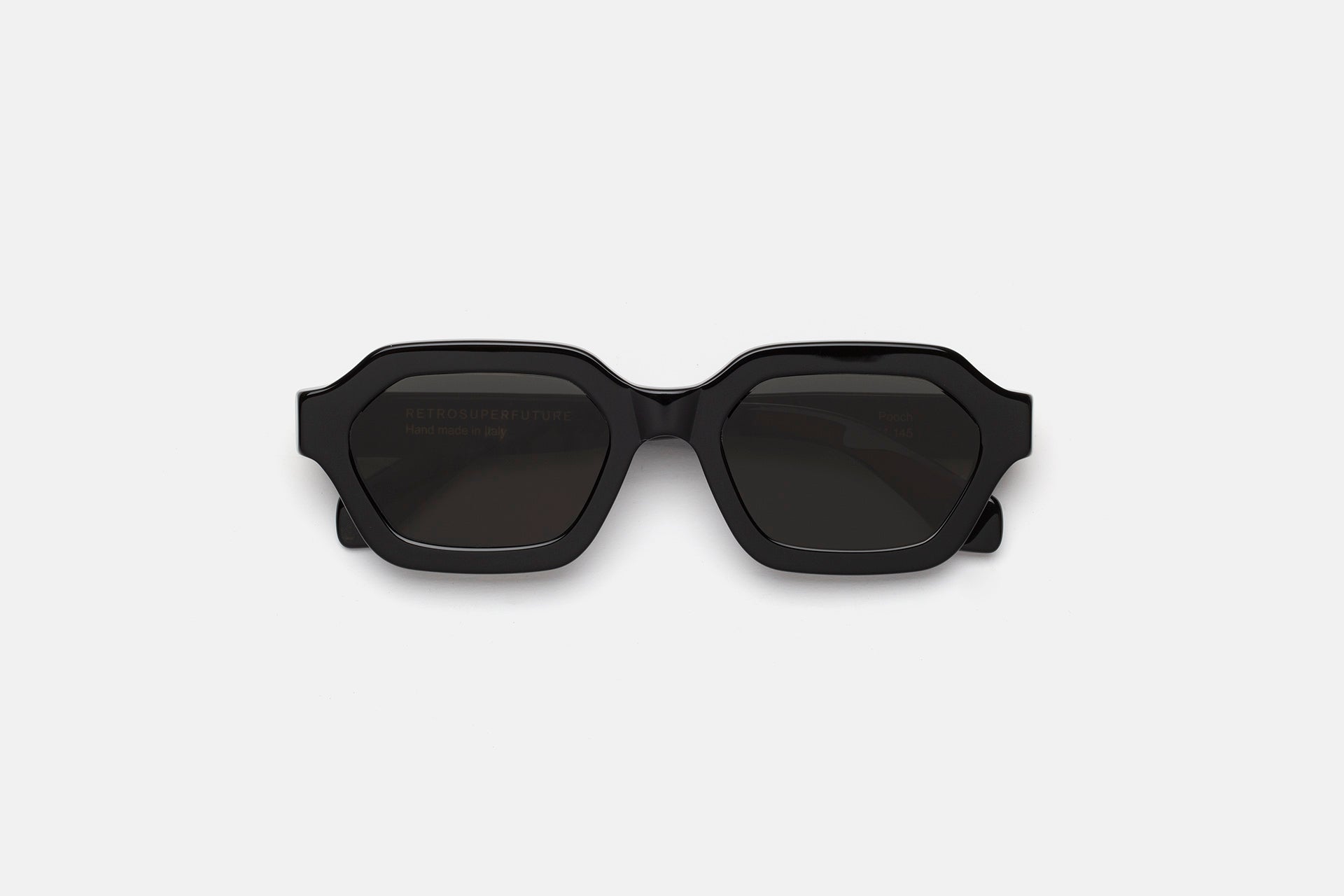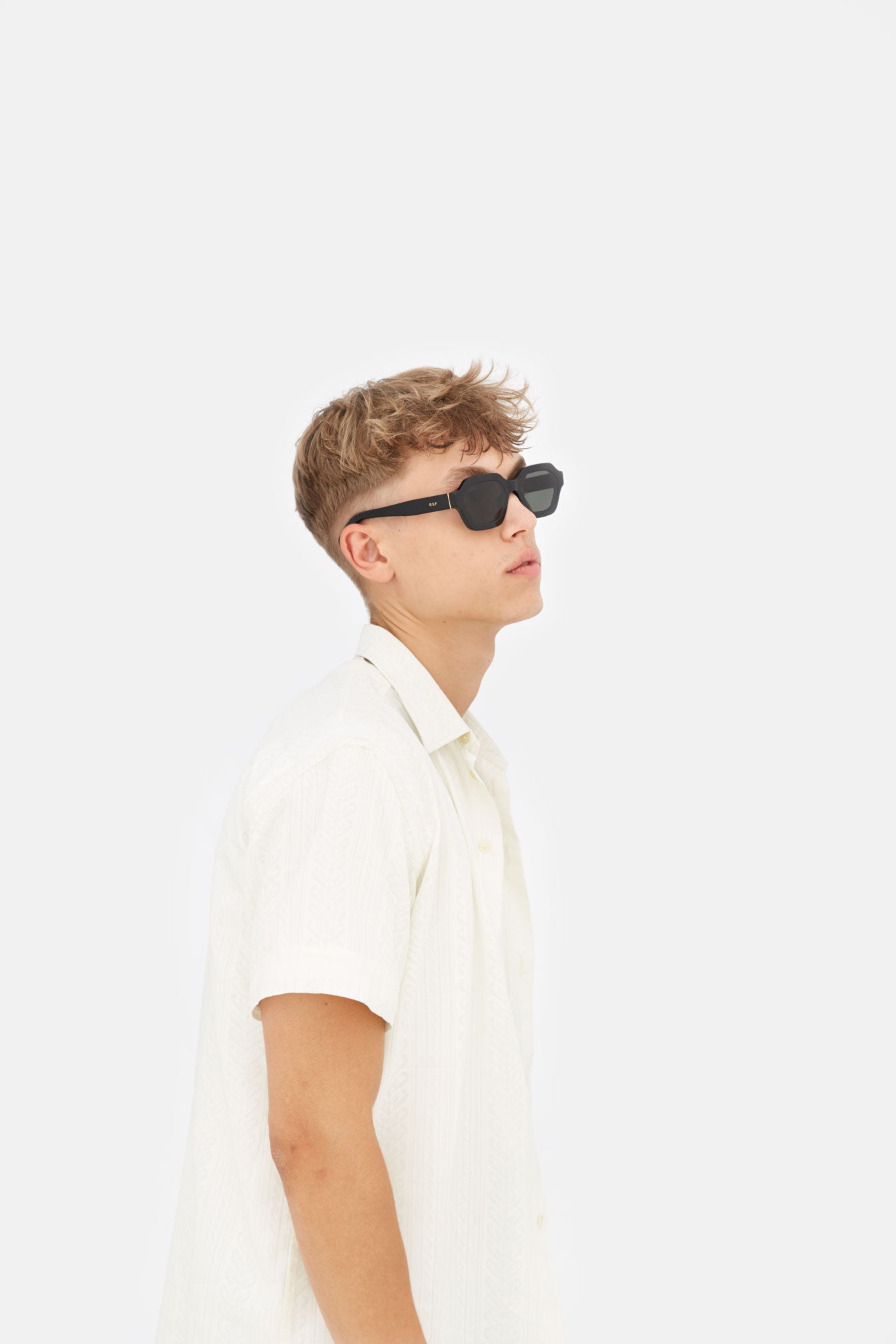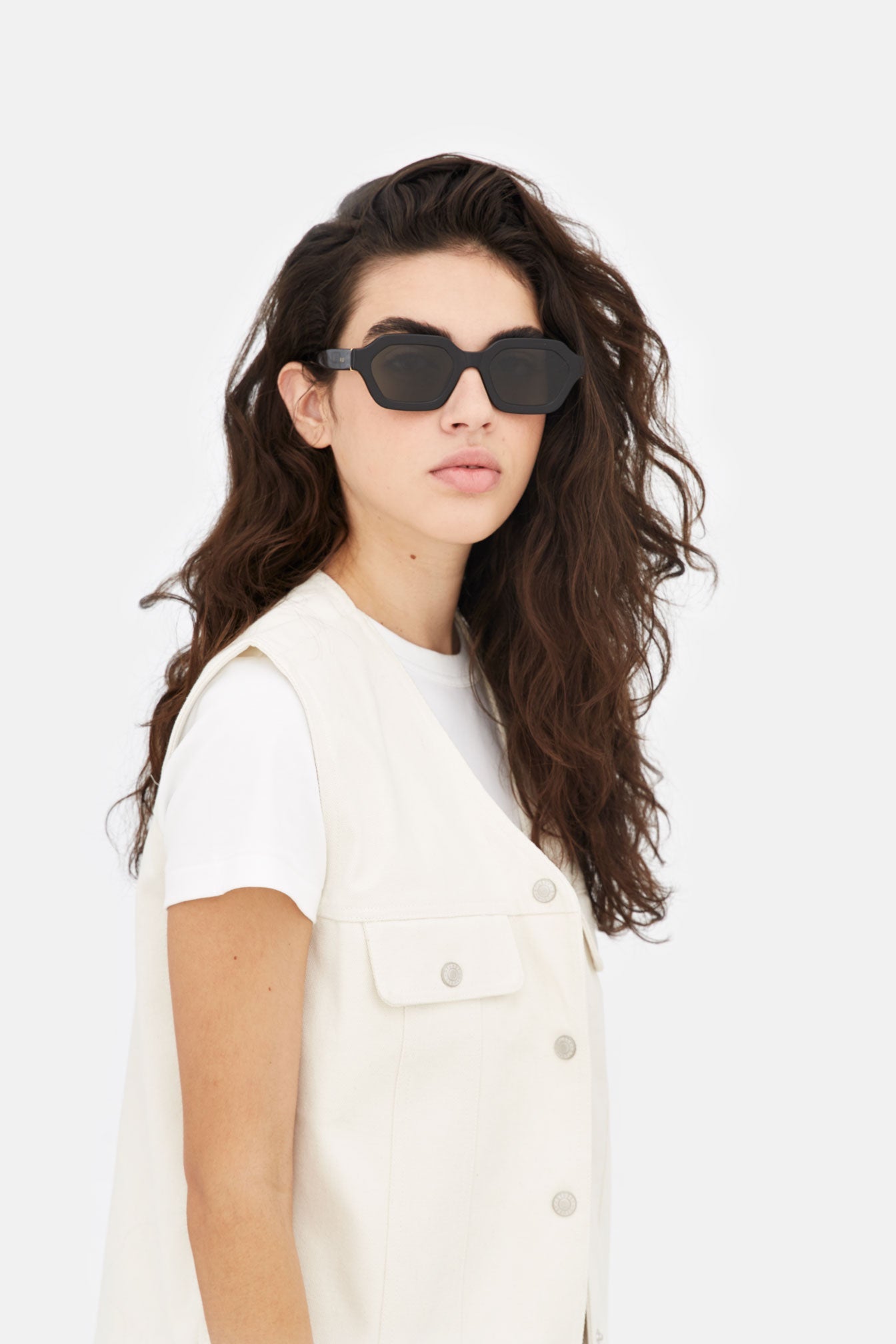 A pair of sunglasses with a story to tell: Pooch is inspired by the coolest kid on the bloc, the one always breaking norms and experimenting with style. A standout model, Pooch is an iconic silhouette with a unique hexagonal shape and wide lenses encased within its thick acetate construction. A silhouette with a distinctive street edge, it features a low nose-bridge and angular temple tips. This model comes in black acetate with timeless grey lenses.