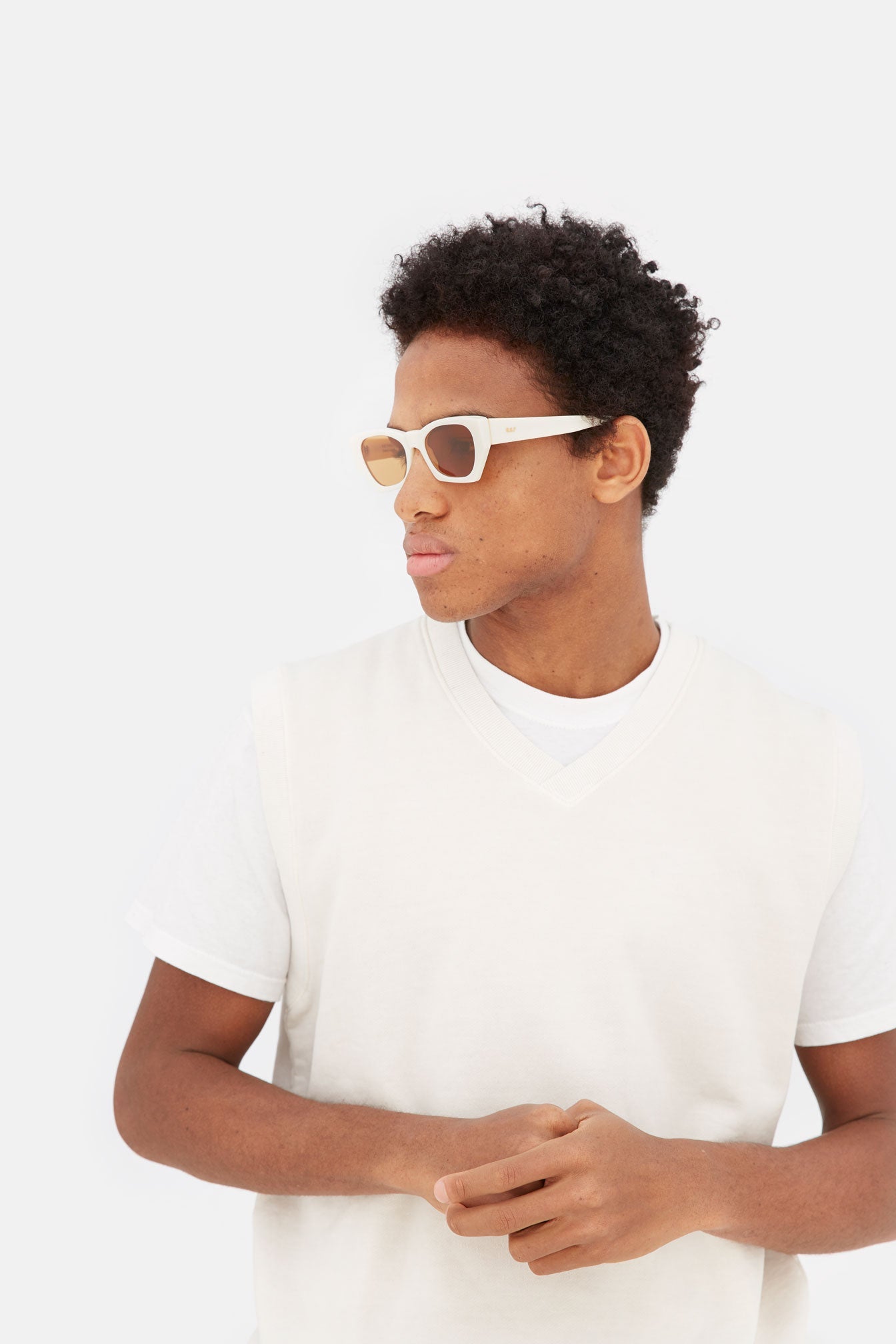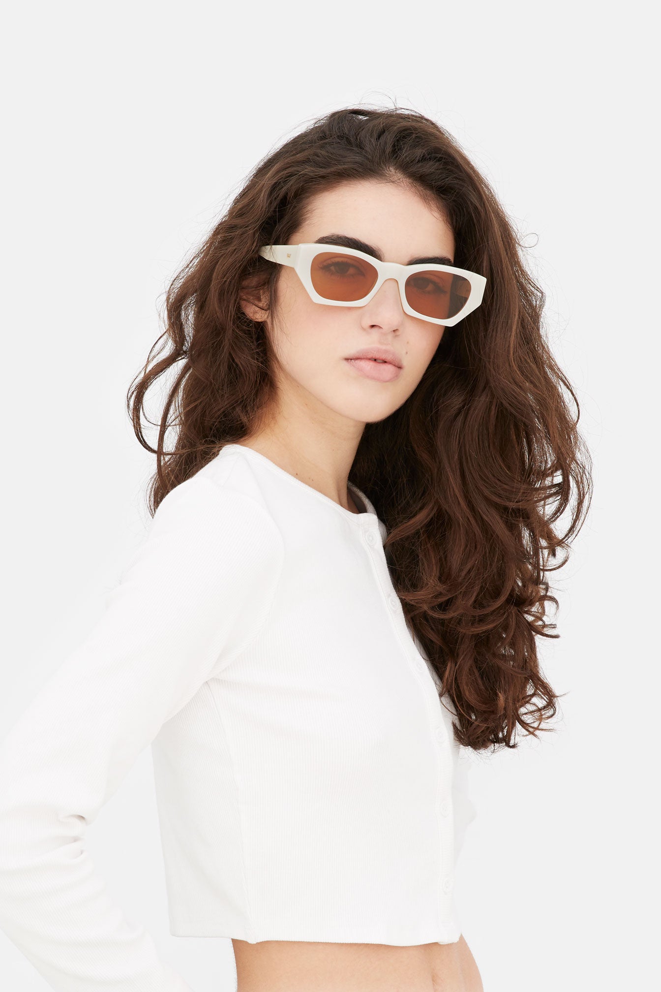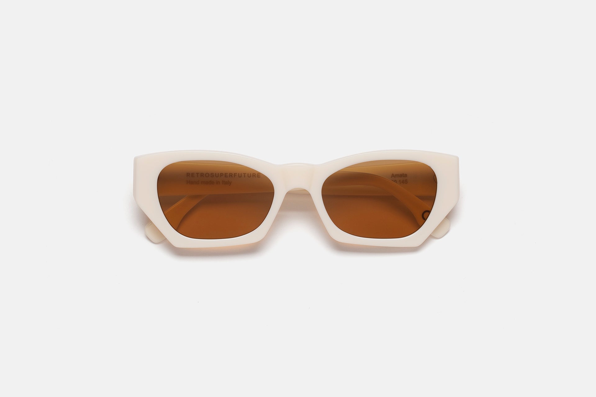 Designed as a determined, bold, unisex frame, Amata has become a staple of RSF’s collections, characterized by sharp lines and a universally fitting silhouette. The model’s iconic design features geometric rims on the lower part of the frame with a curved, rounded upper line. This version of Amata comes with a solid cream acetate and brown lenses.
