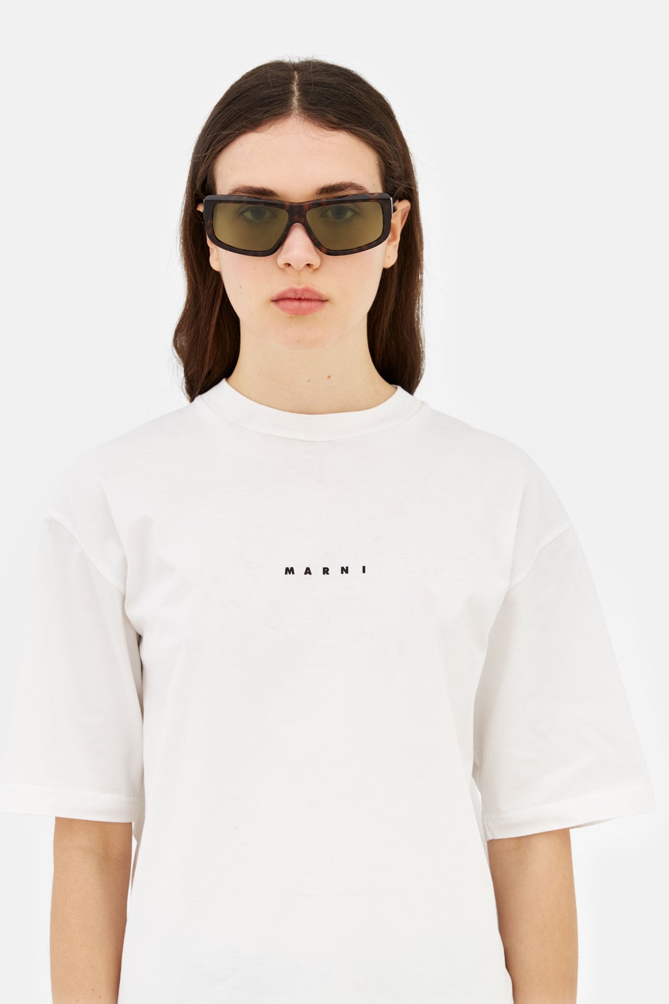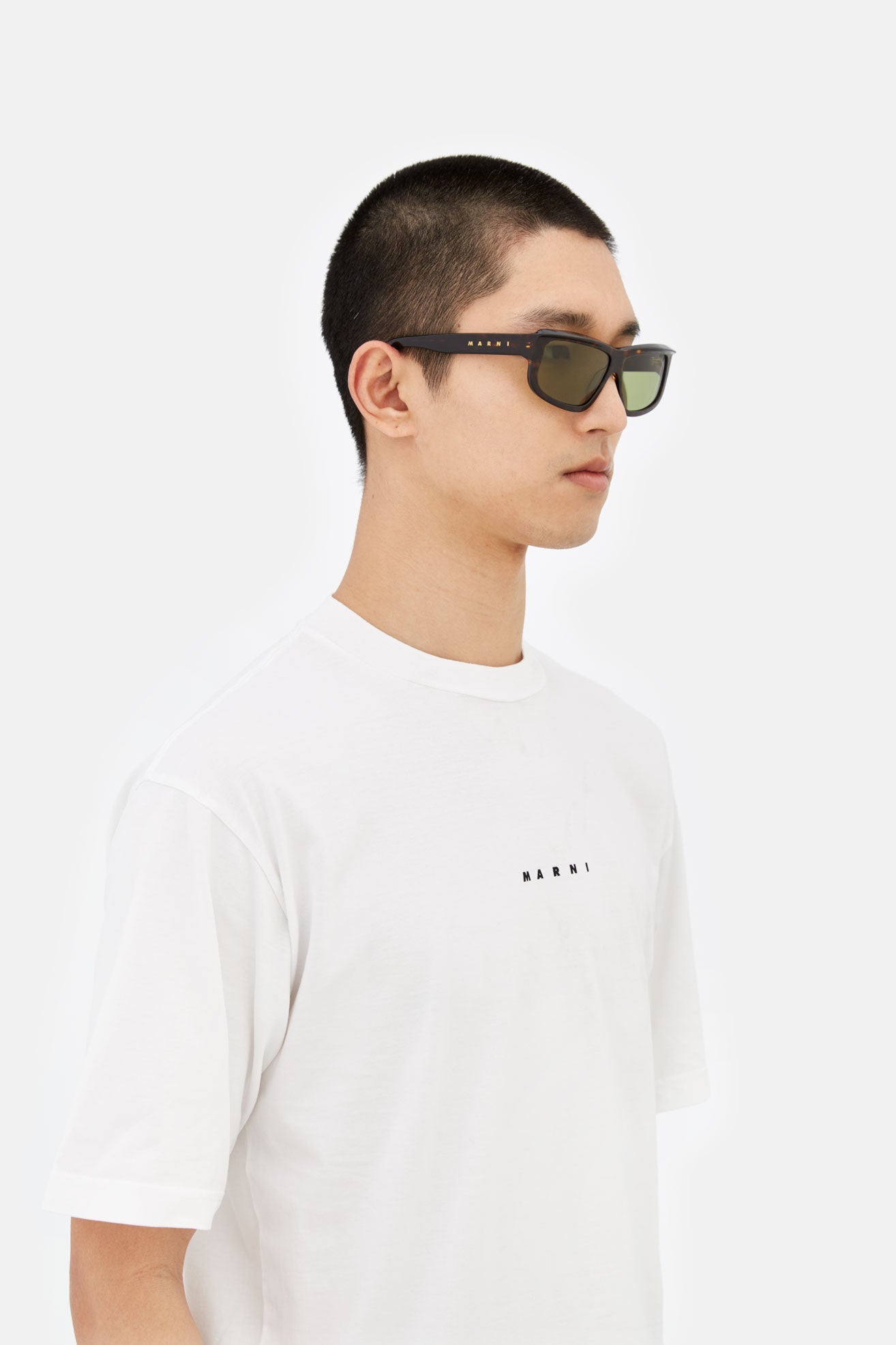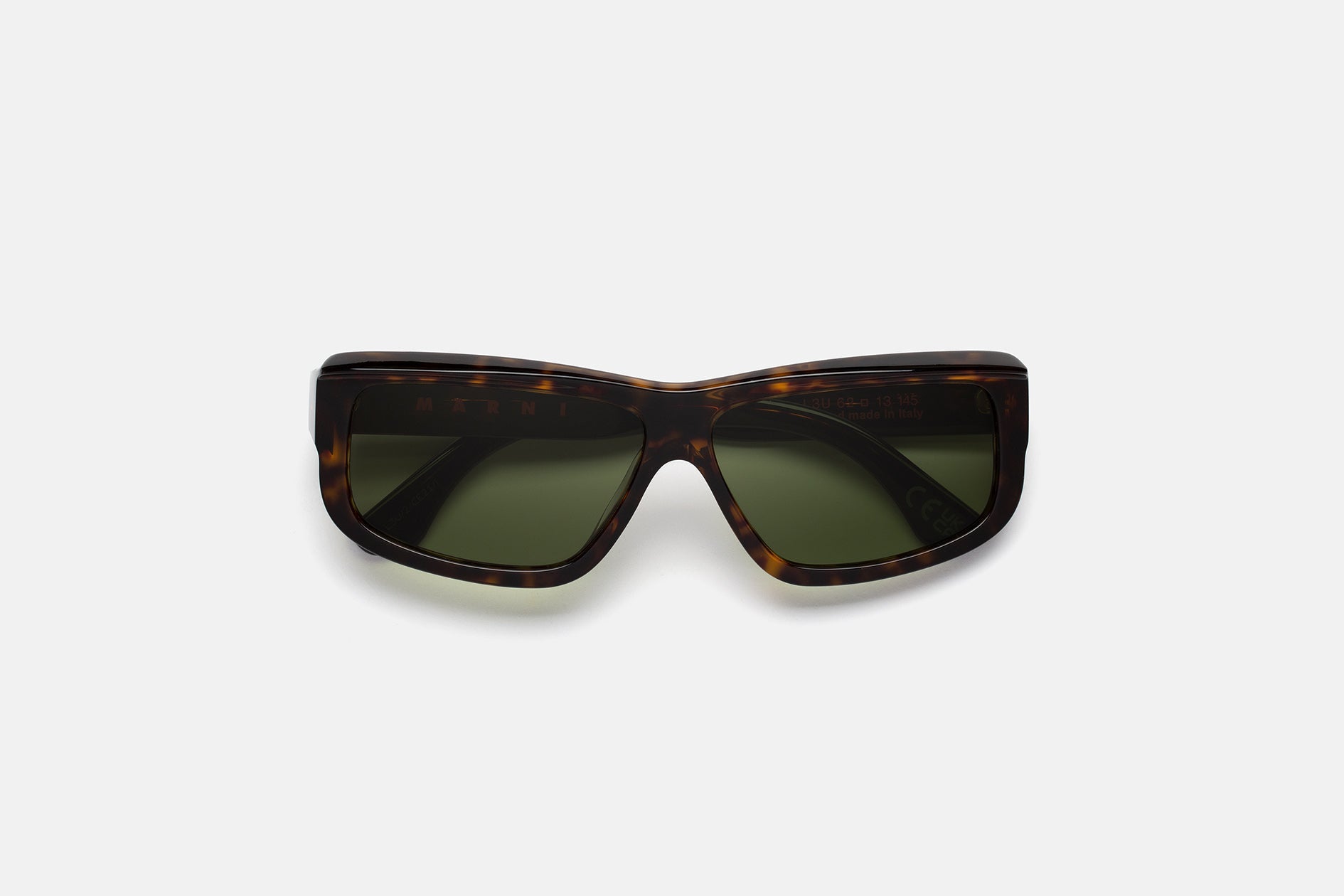 Designed exclusively for Marni, Annapuma Circuit is a silhouette that embraces a fast-paced sportswear heritage, reinterpreting it with a high-end approach to design. The model features a slight wrap-around structure, with a distinctive stretched brow-piece, a nod towards daring sporting features. The squared profile with slanted rims on the bottom, gives this shape its daredevil character. This model is available in a dark Havana acetate with bottle green lenses.