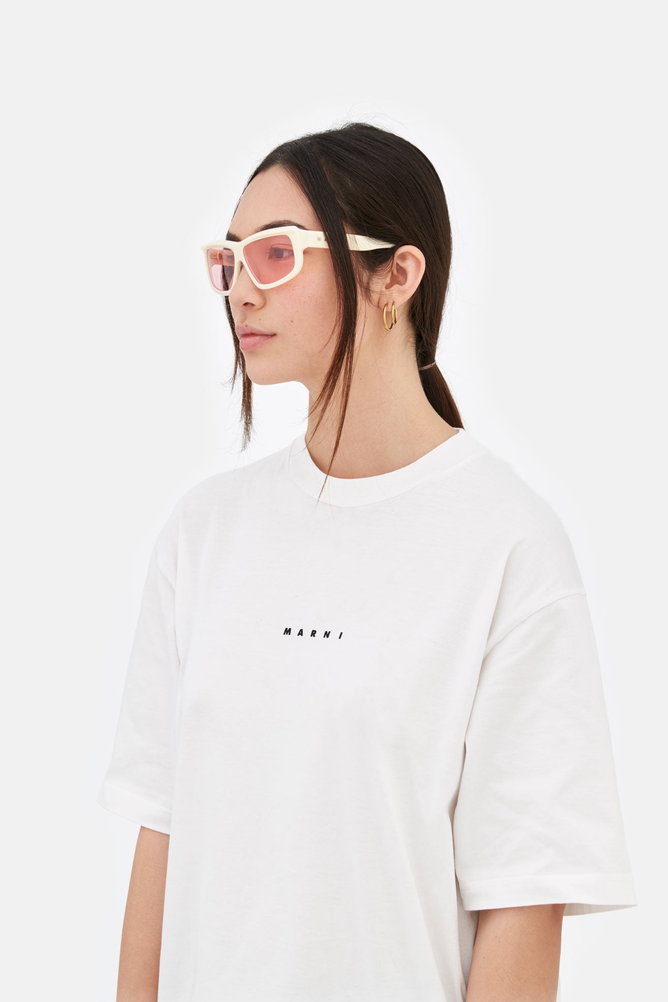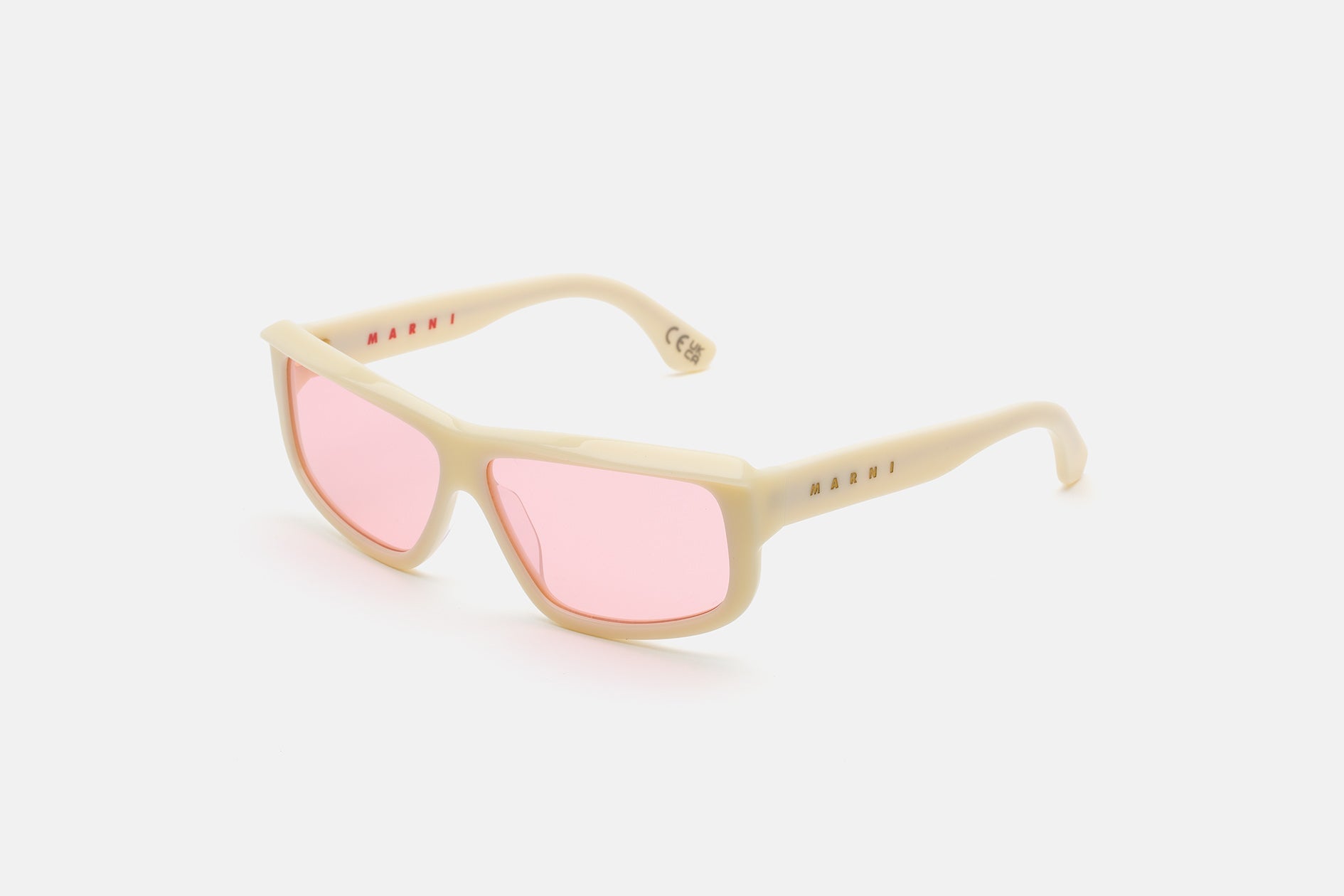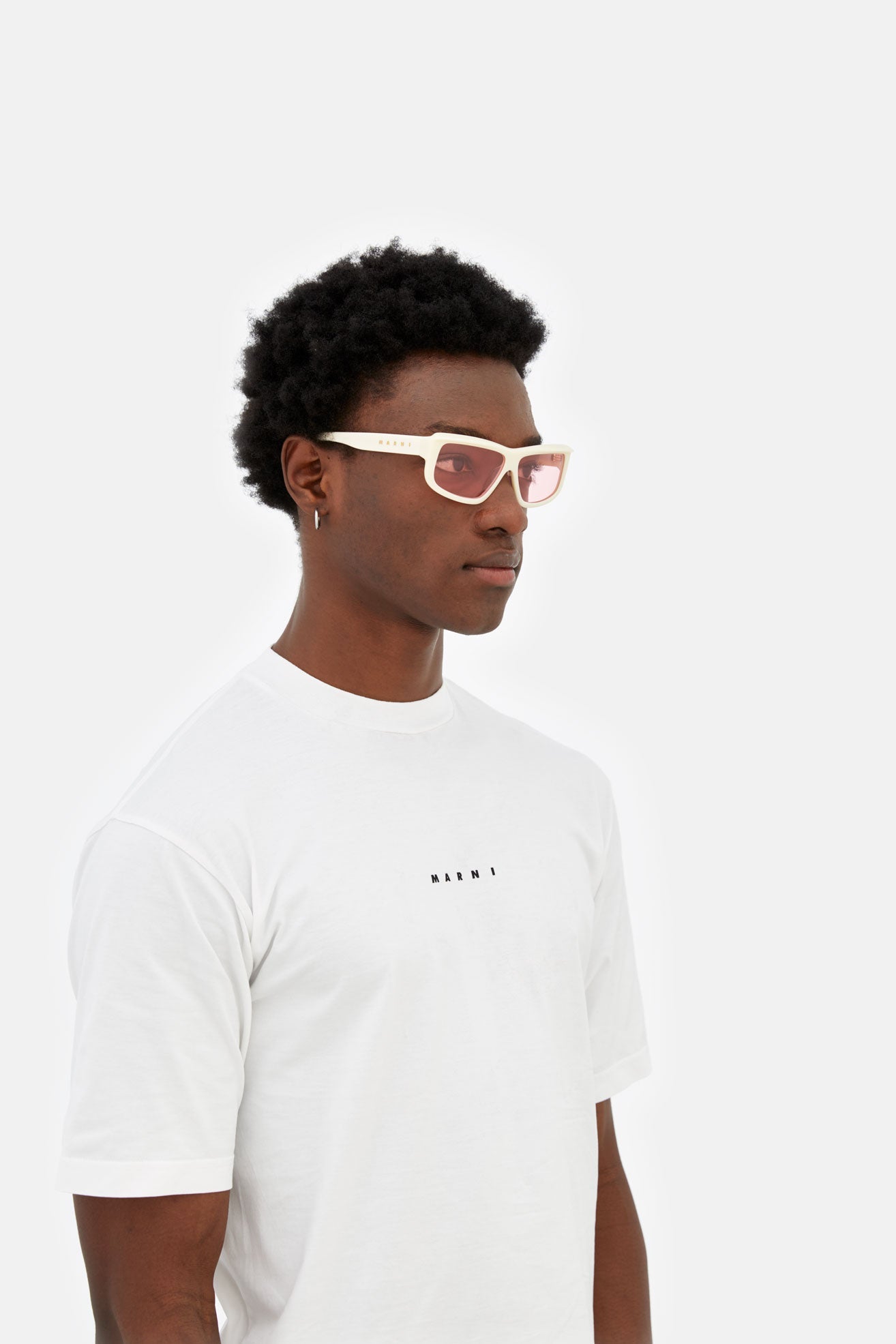 Designed exclusively for Marni, Annapuma Circuit is a silhouette that embraces a fast-paced sportswear heritage, reinterpreting it with a high-end approach to design. The model features a slight wrap-around structure, with a distinctive stretched brow-piece, a nod towards daring sporting features. The squared profile with slanted rims on the bottom, gives this shape its daredevil character. This model is available in a solid white acetate with pink tinted lenses.