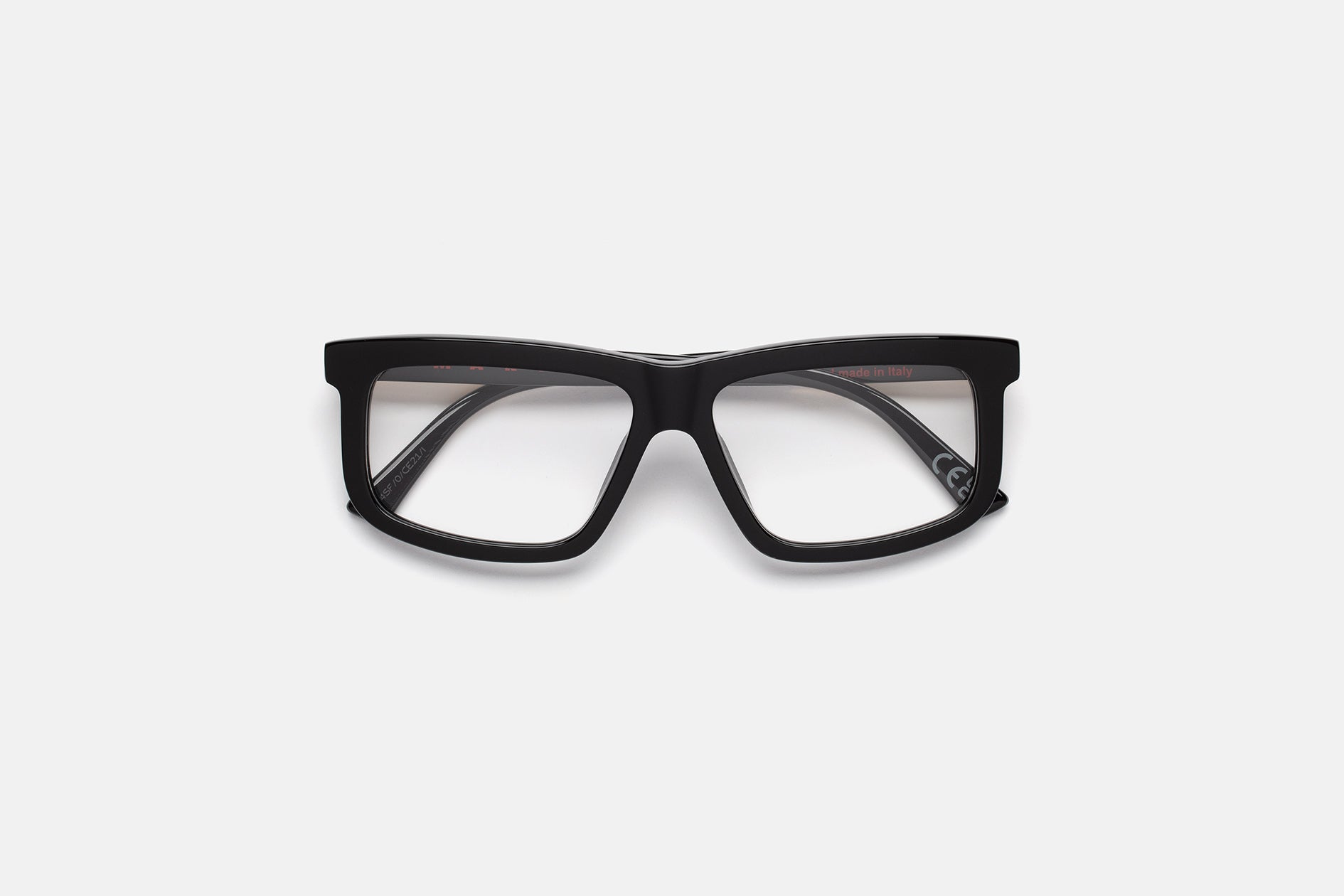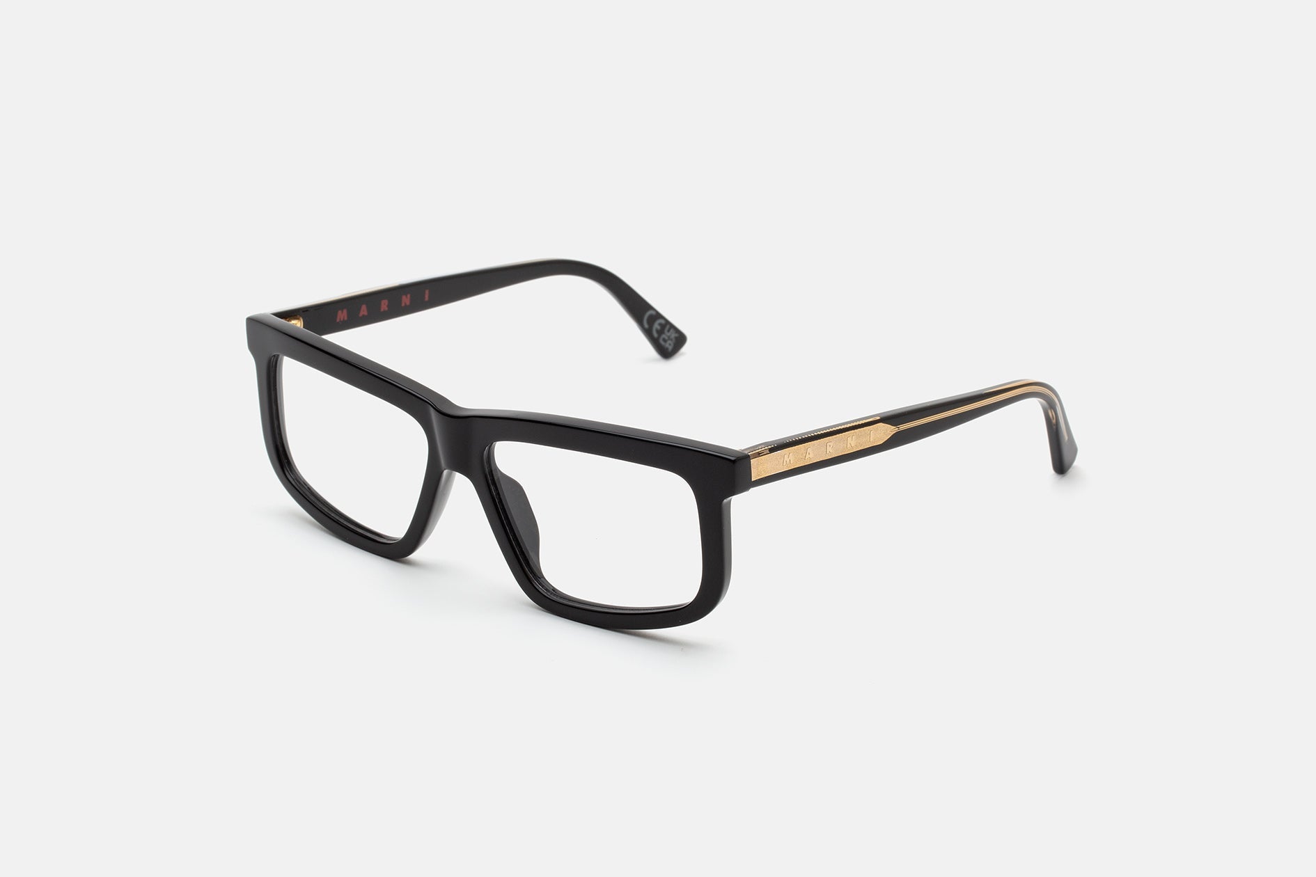 Designed exclusively for Marni, this is an Optical interpretation of the bold Annapuma Circuit sun silhouette. The model is characterised by sportswear-inspired design, seen from its slanted angular shape and thick curves. Wide horizontal lenses and sturdy acetate construction elevate these everyday glasses into a unique piece of design. This version is available in black acetate.