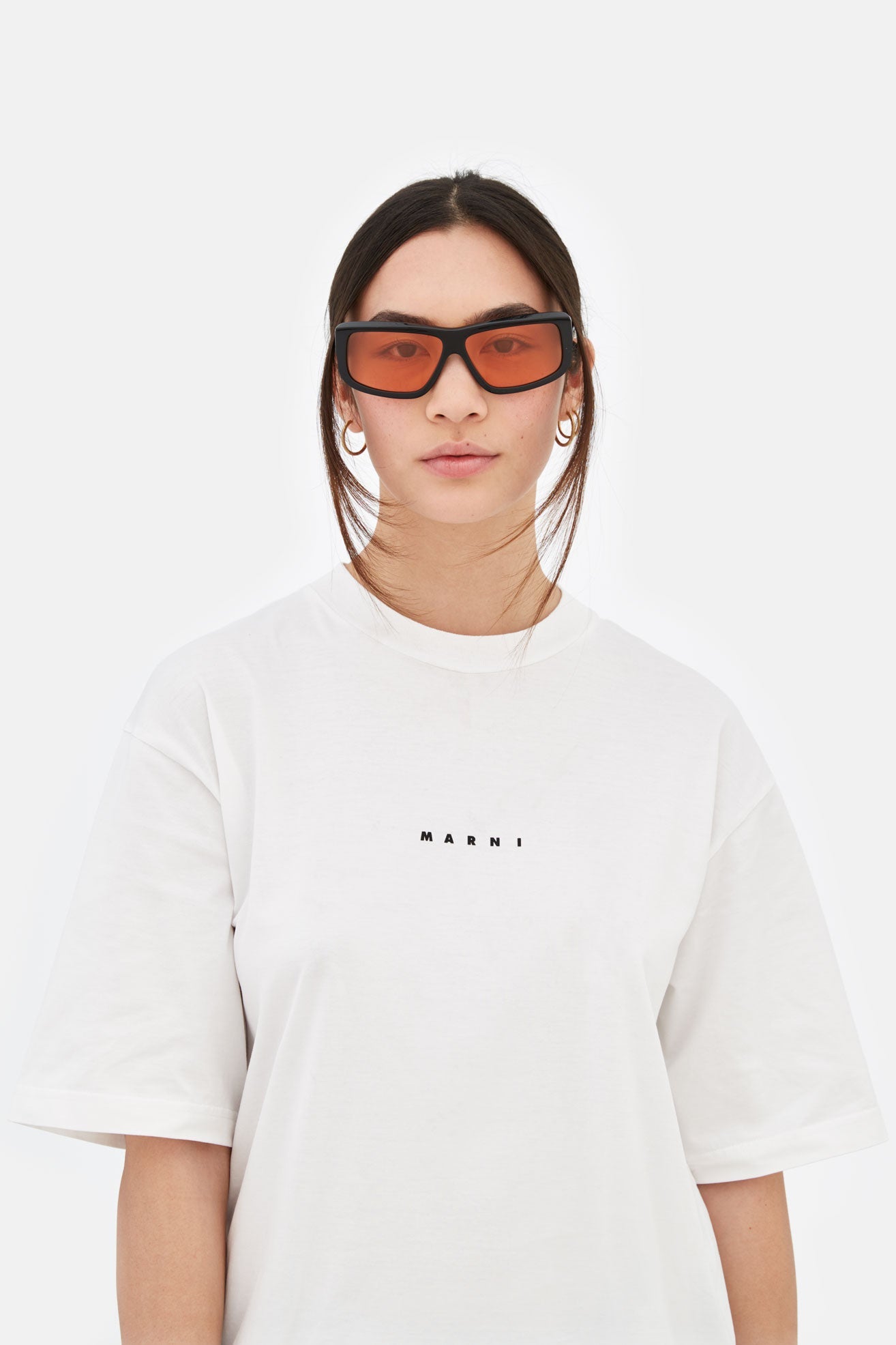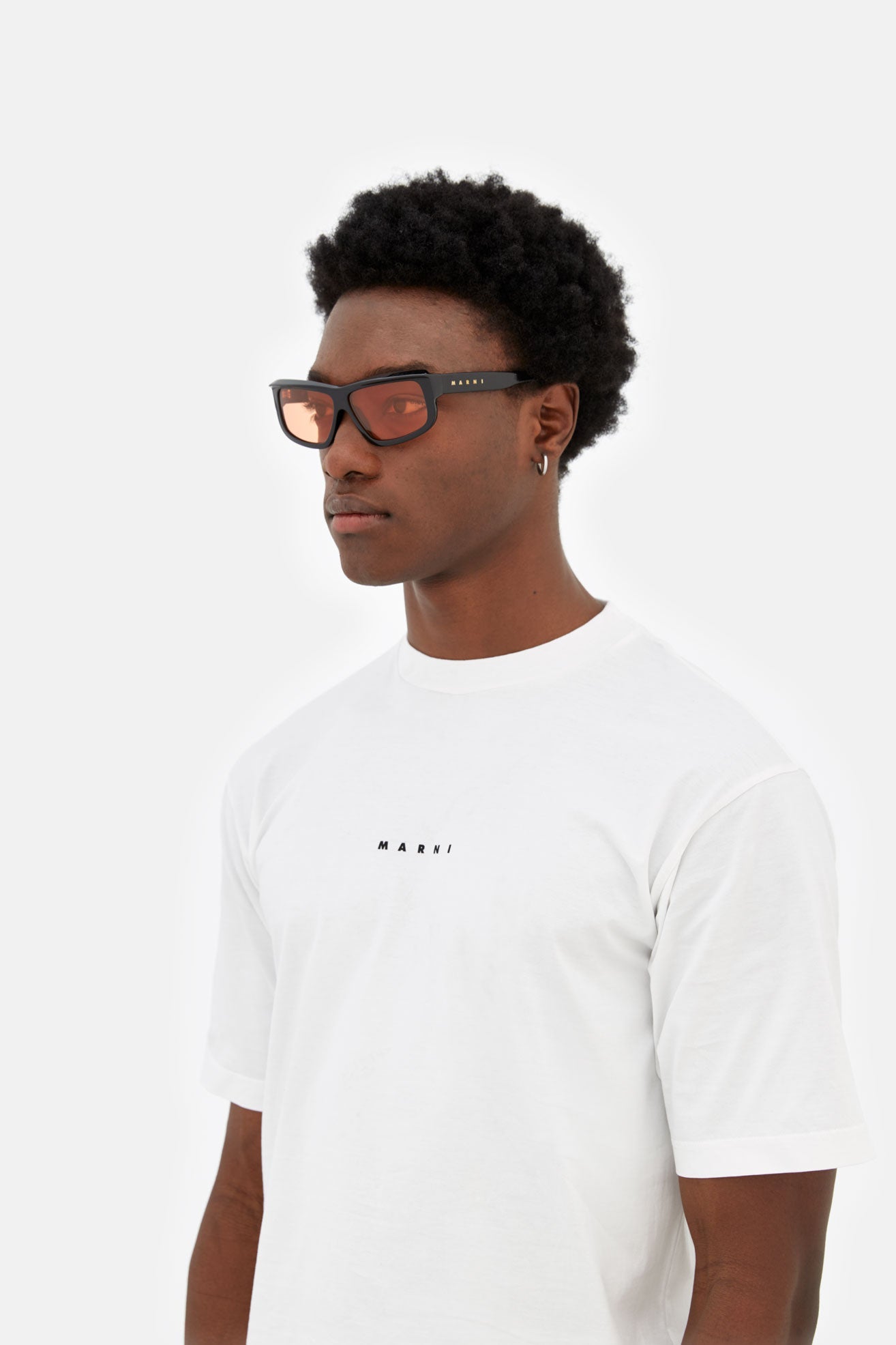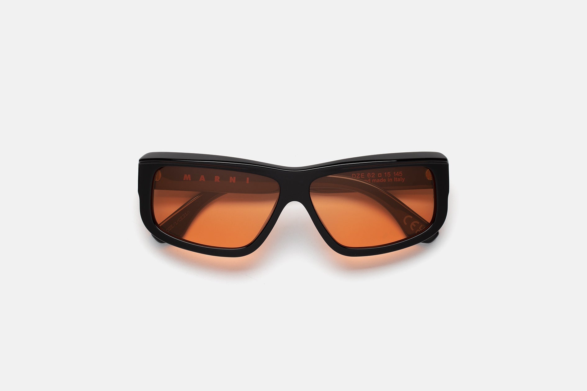 Designed exclusively for Marni, Annapuma Circuit is a silhouette that embraces a fast-paced sportswear heritage, reinterpreting it with a high-end approach to design. The model features a slight wrap-around structure, with a distinctive stretched brow-piece, a nod towards daring sporting features. The squared profile with slanted rims on the bottom, gives this shape its daredevil character. This model is available in black acetate with orange tinted lenses.