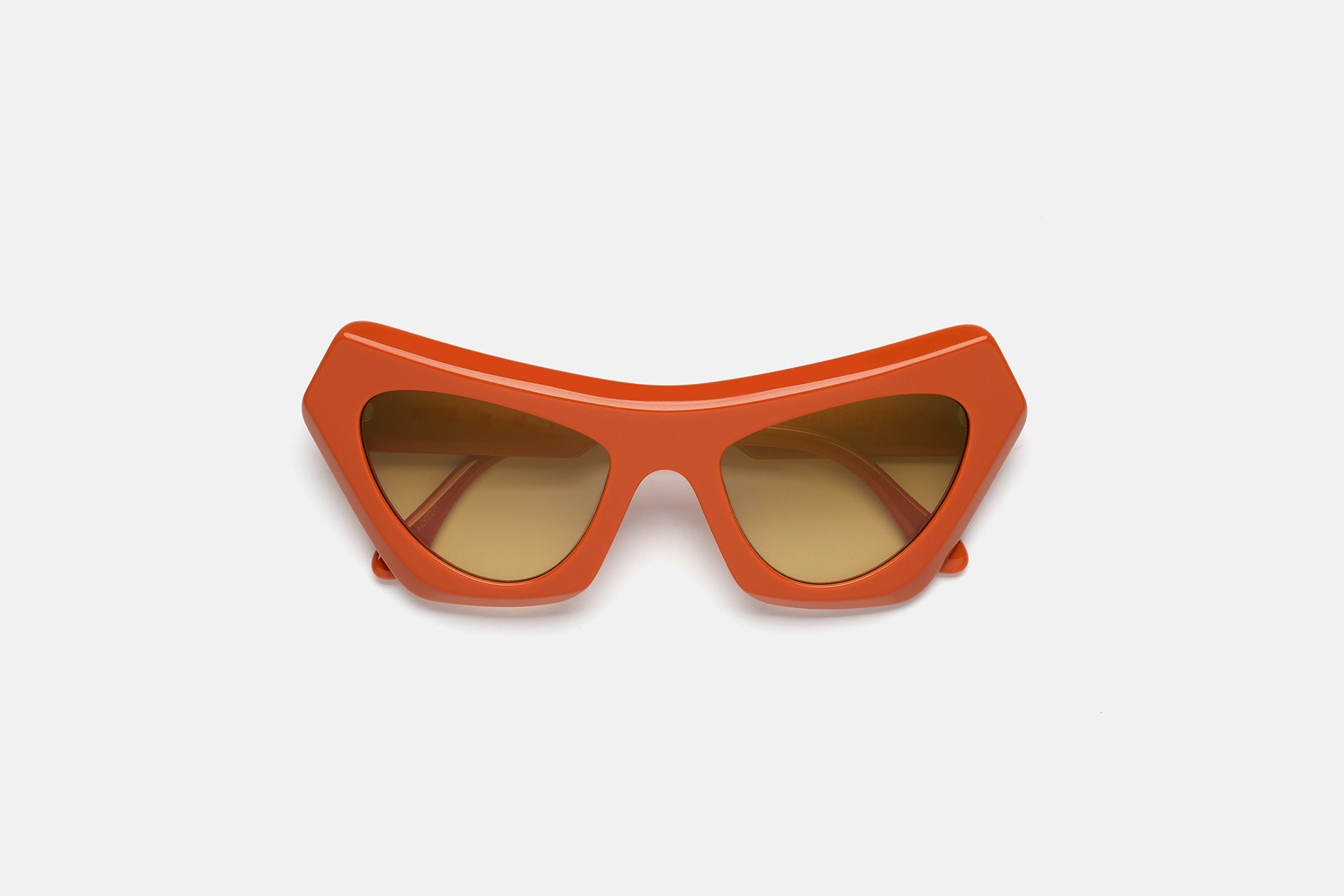Devil's Pool is a stand-out contemporary silhouette designed exclusively for Marni. Drawing on the brand's exceptional heritage, the model features a quirky, oversized shape with a thick curved brow-piece crafted for a different take on classic cat-eye shapes. Its thick acetate construction elevates the unconventional personal style while celebrating Italian luxury craftsmanship. This version comes in a playful orange acetate with grey lenses.