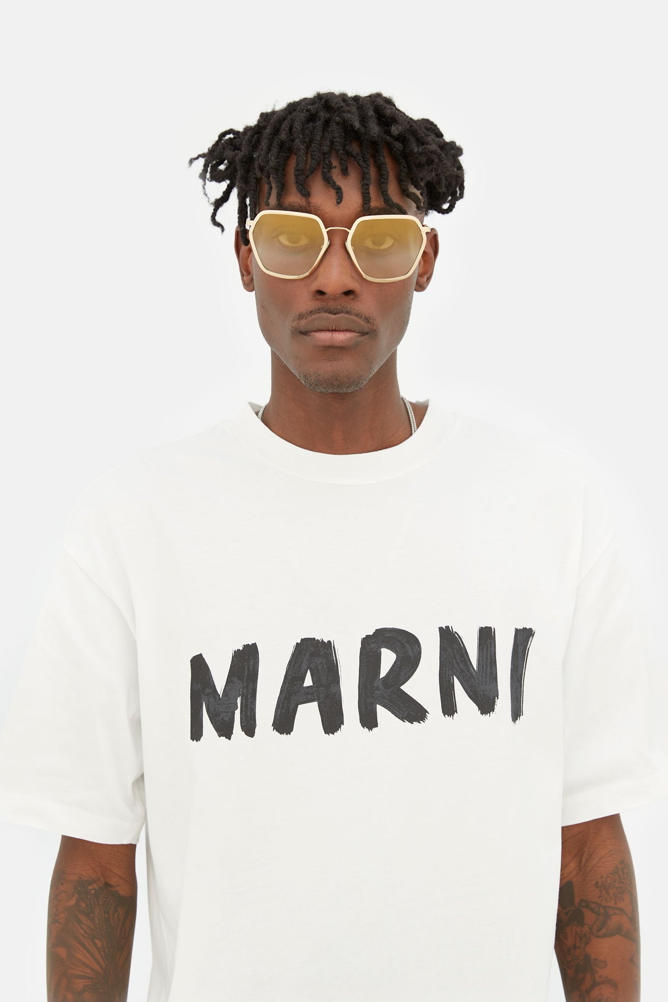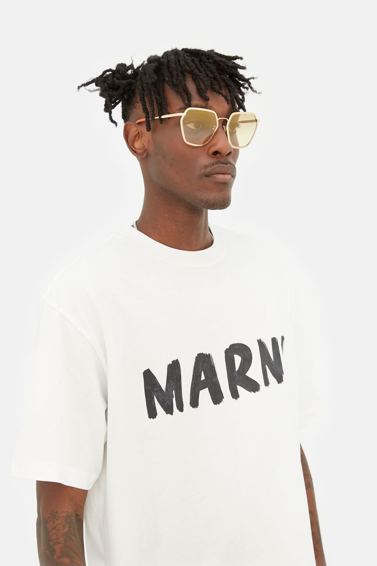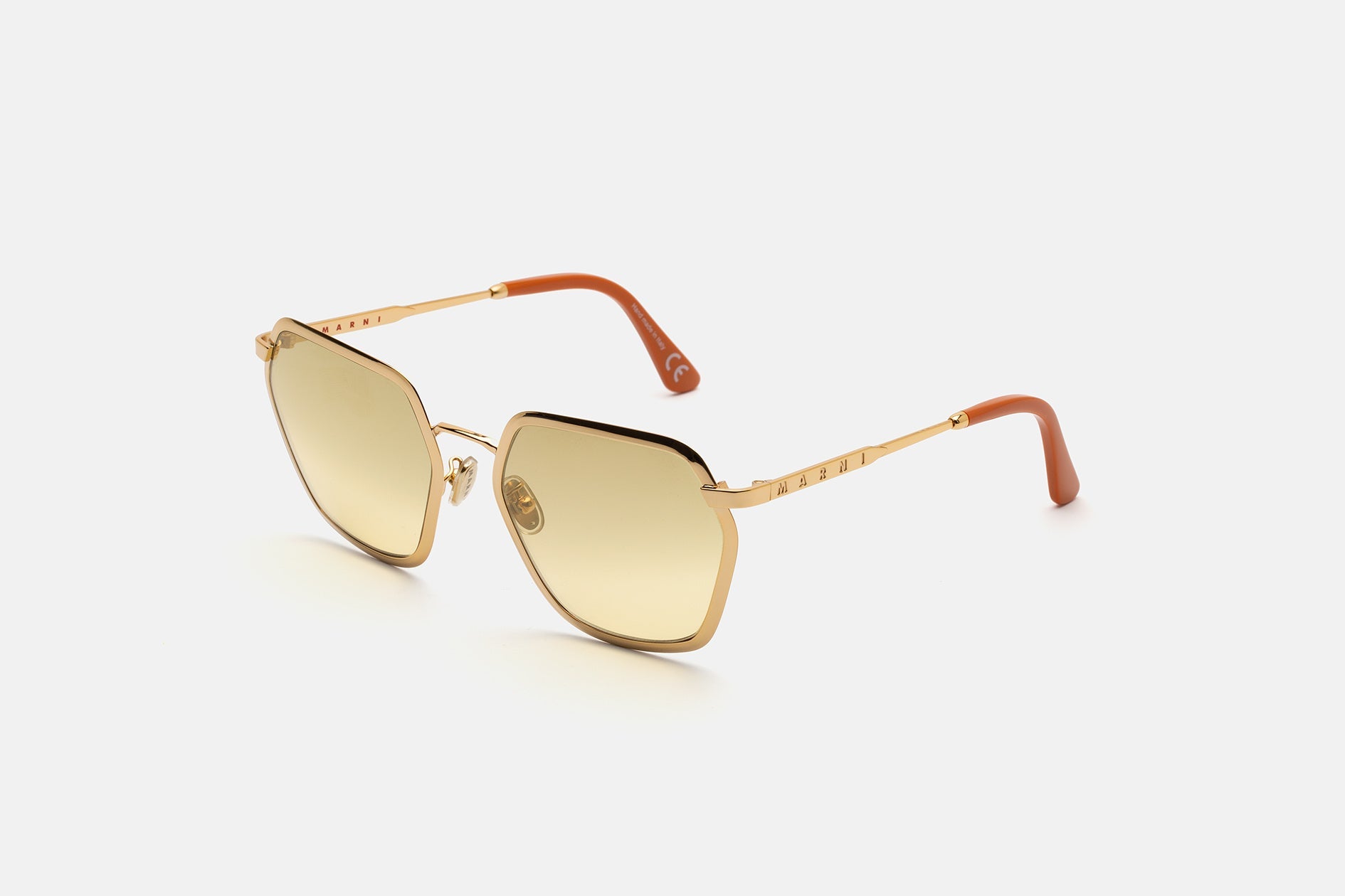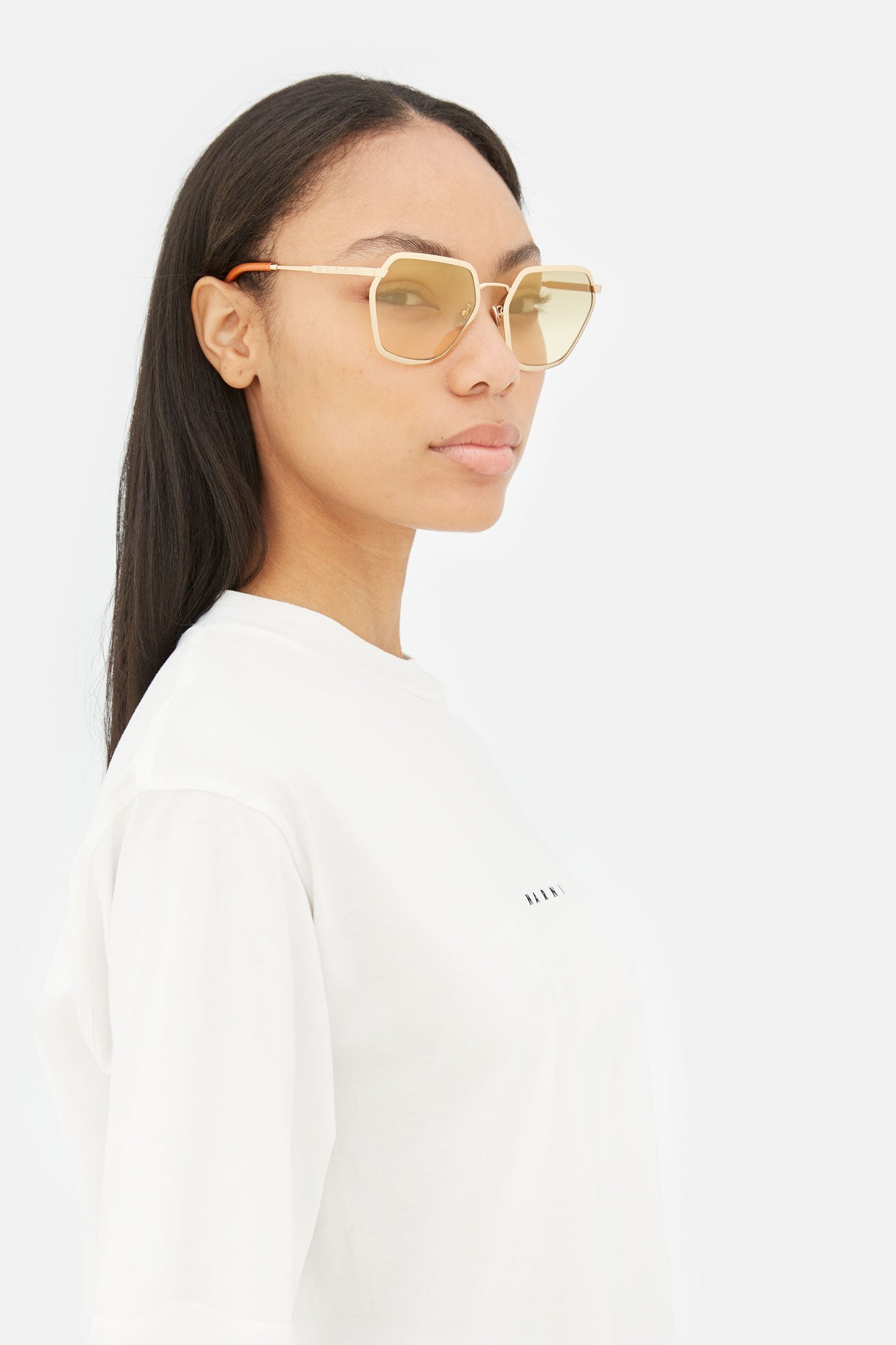 Designed exclusively for Marni, Great Noligwa Mine is a sophisticated metal silhouette characterised by an unexpected geometric shape and appealing oversized fit. It was inspired by a timeless vintage aesthetics, adapted for a contemporary style with a sharper, more streamlined design. The model’s distinctive lenses feature an asymmetrical hexagonal shape, encased within thick metal rims. A curved nose-bridge and sleek temples complete the piece. This model comes with gold metal finish and fading smoky yellow lens.