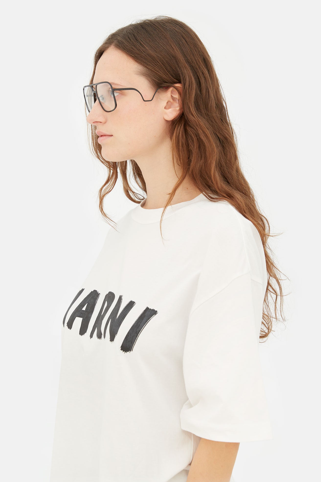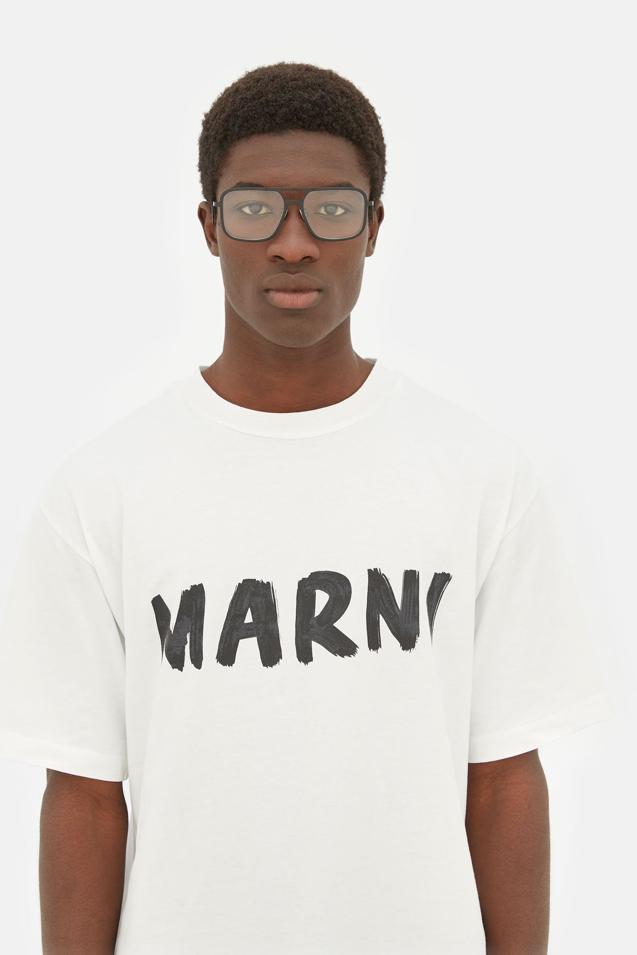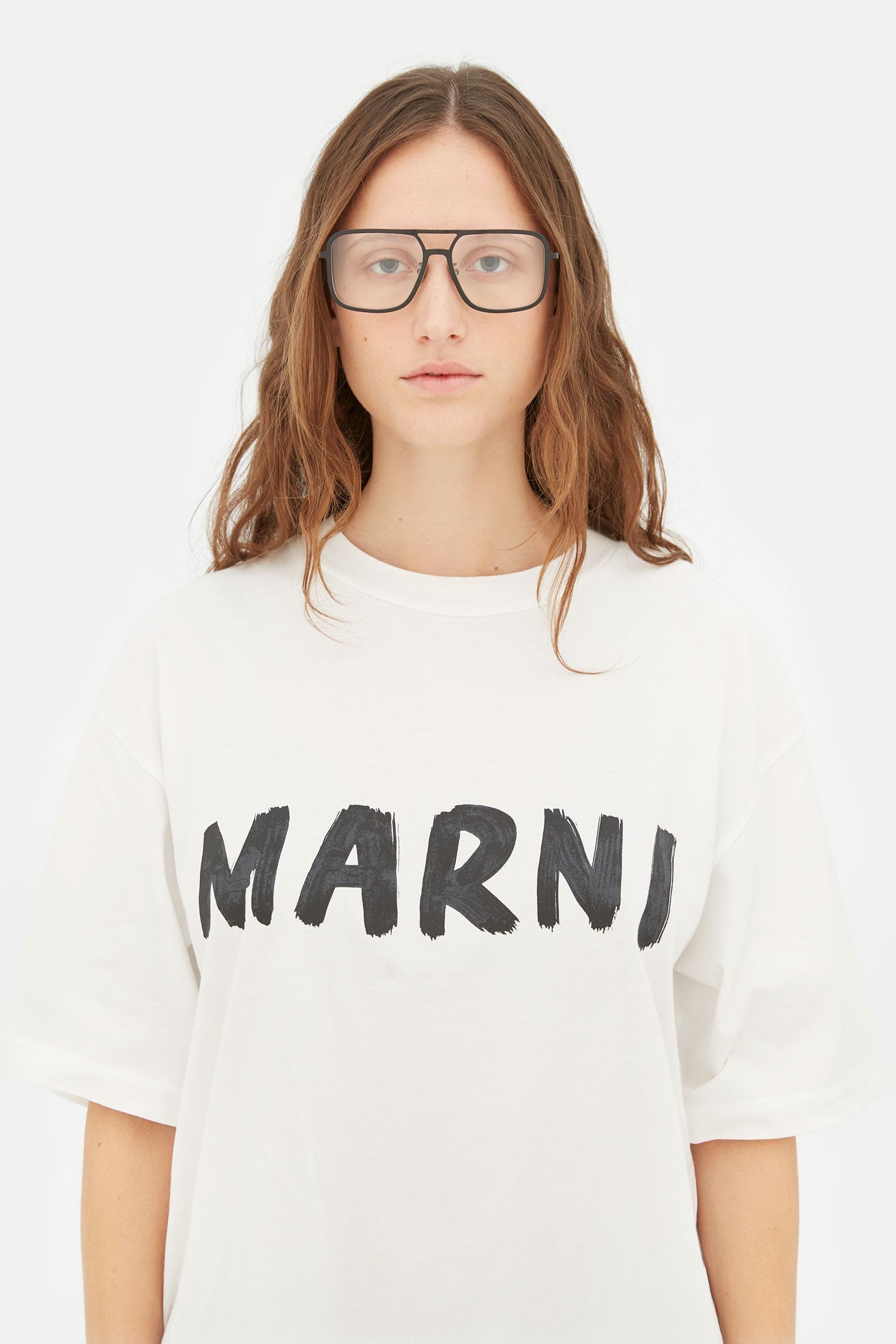 Designed exclusively for Marni, Ha Long Bay revisits timeless aviator frames for everyday optical use. This bold contemporary silhouette is characterised by an oversized fit and relaxed, unisex style. The model’s squared lenses and double nose-bridge revisit 1970s designs, with a thicker, sharper edge due to its thick metal rims. This version comes in black metal finish.