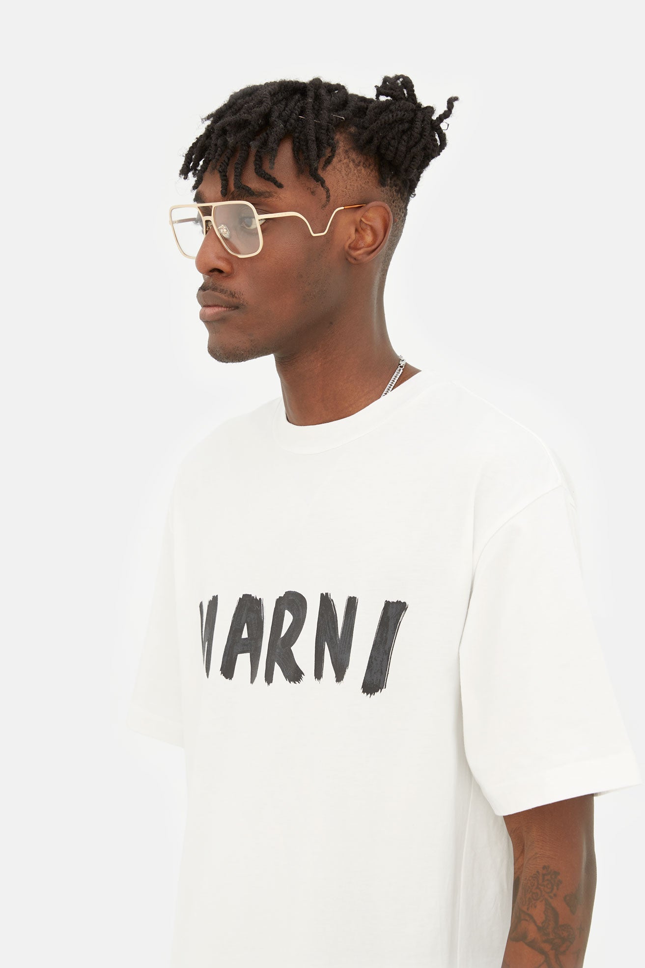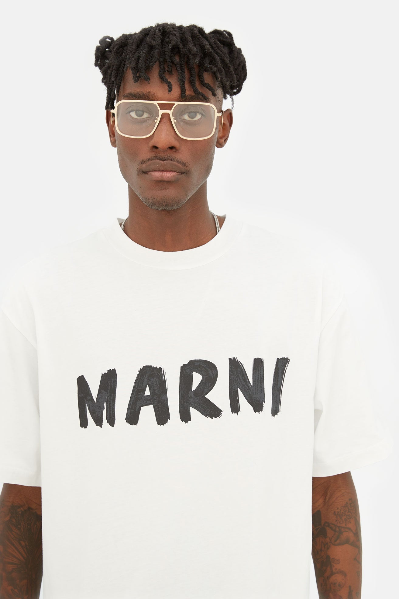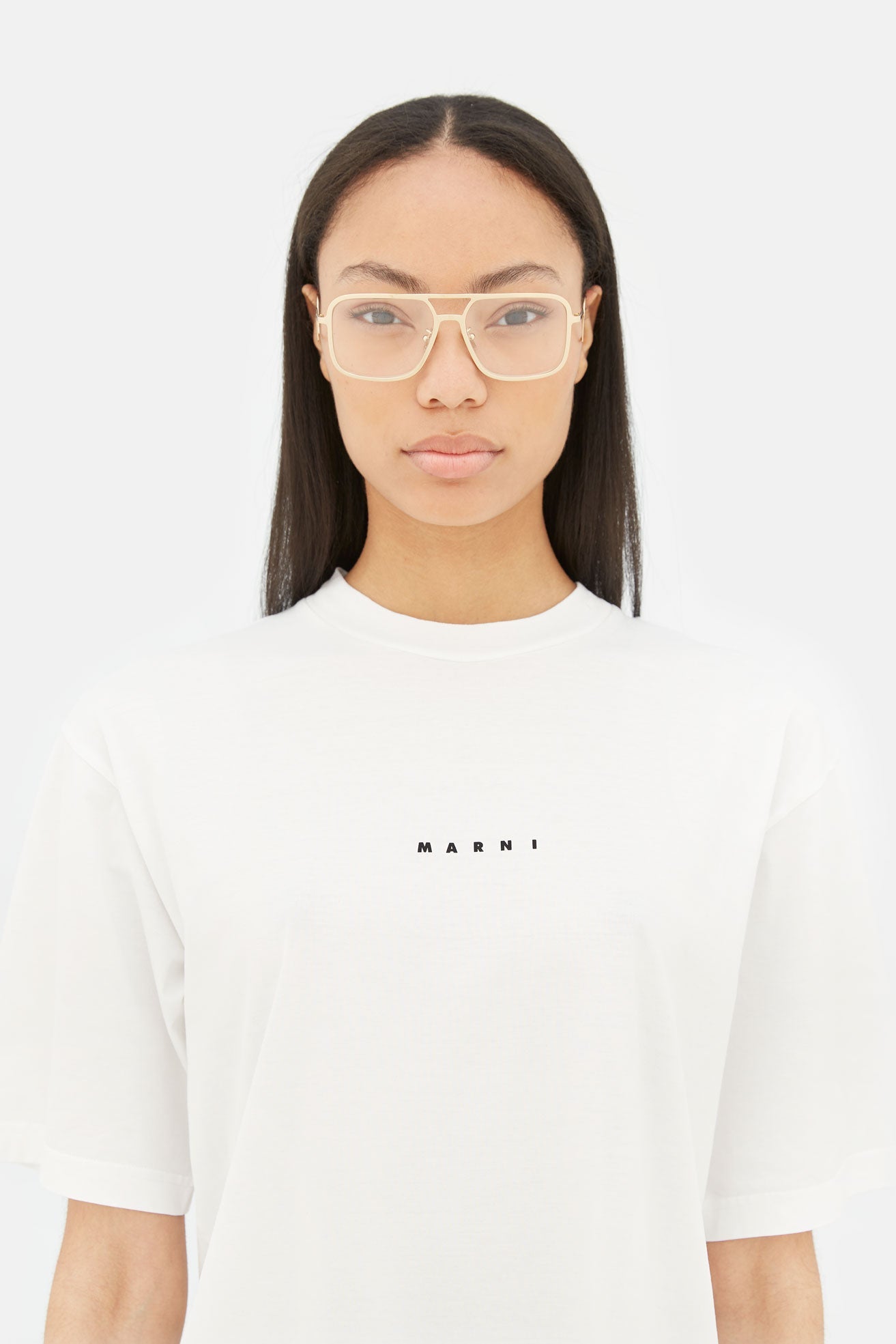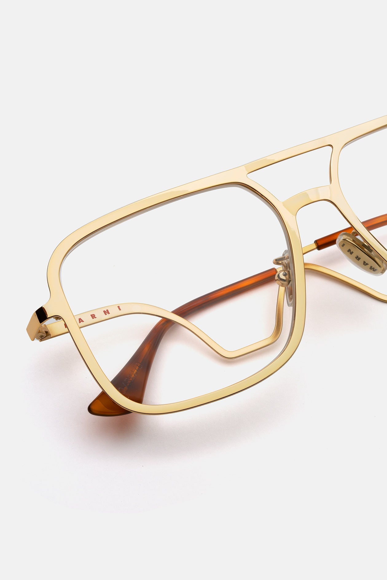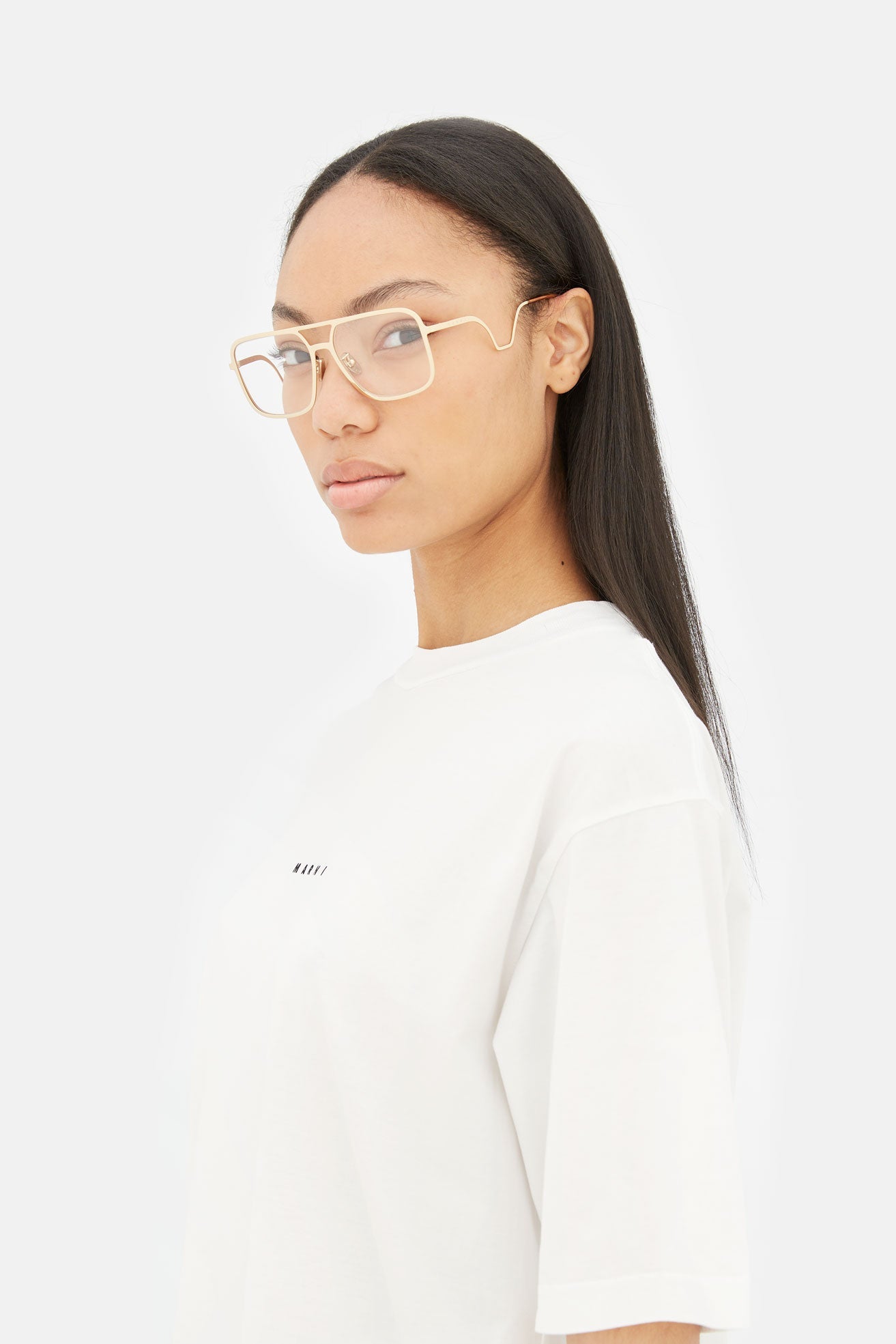 Designed exclusively for Marni, Ha Long Bay revisits timeless aviator frames for everyday optical use. This bold contemporary silhouette is characterised by an oversized fit and a relaxed, unisex style. The model’s squared lenses and double nose-bridge revisit 1970s designs, with a thicker, sharper edge due to its thick metal rims. This version comes in gold metal finish.