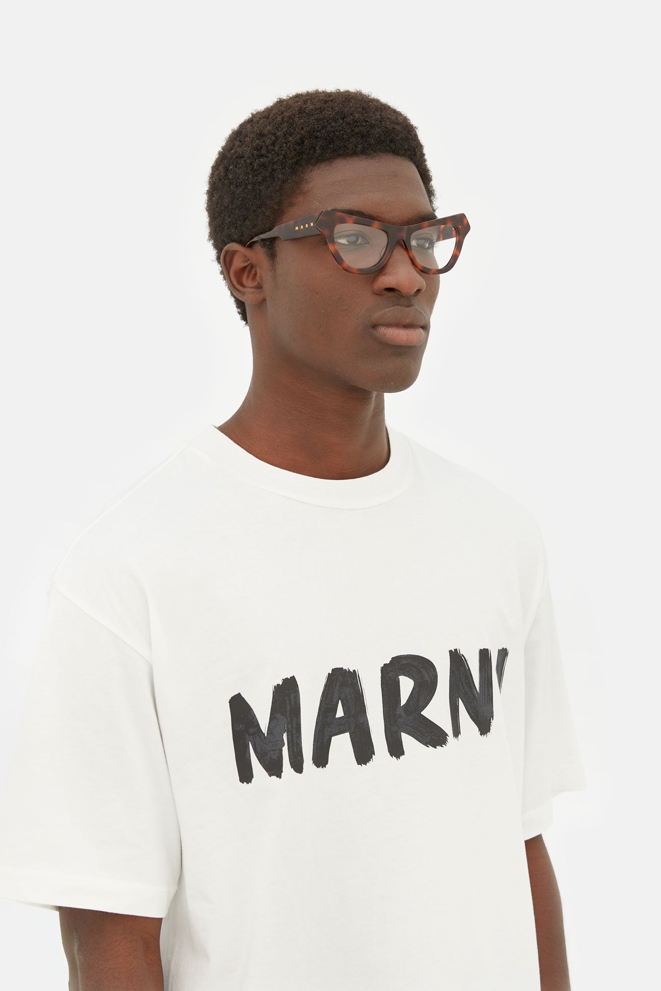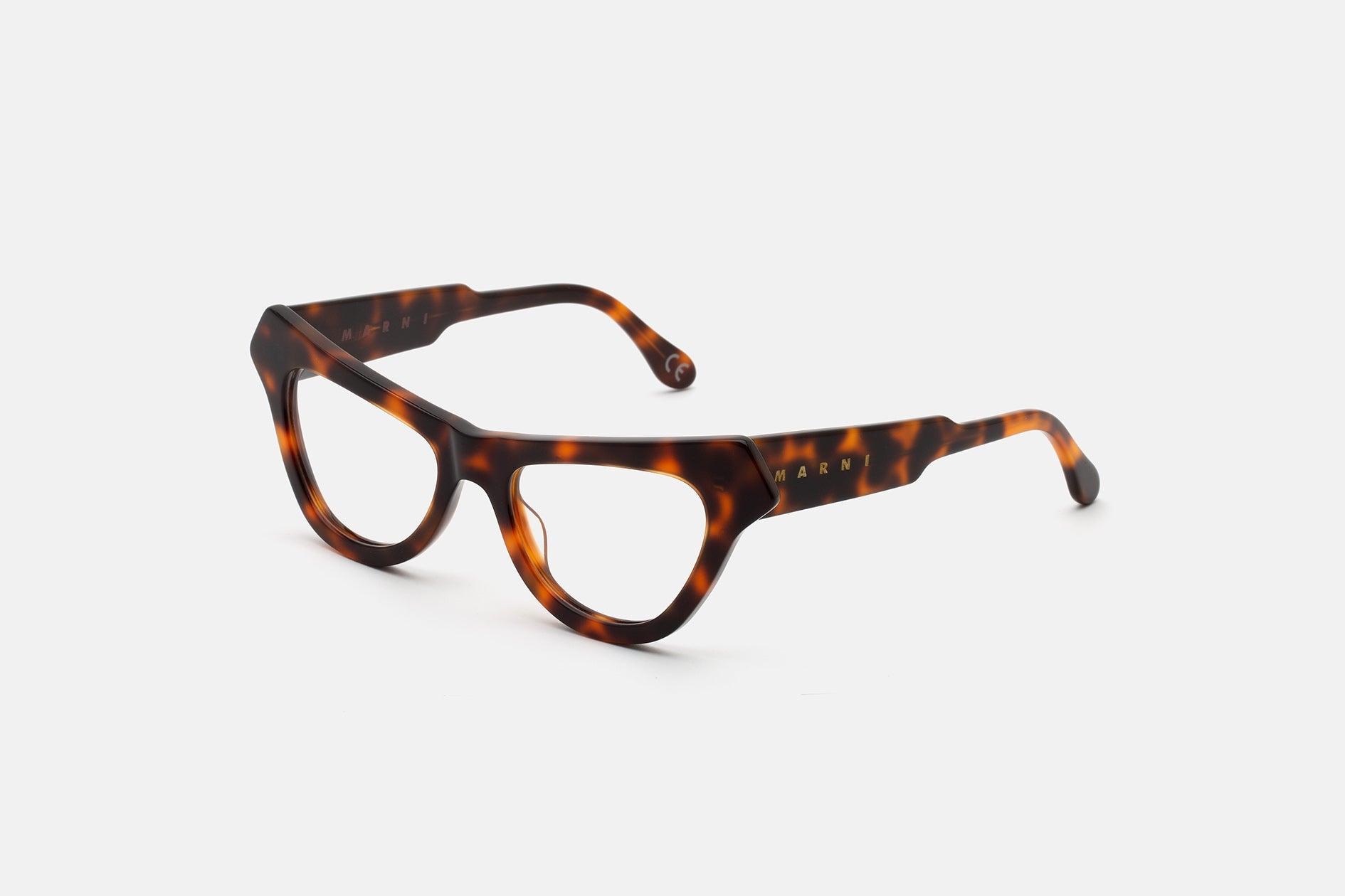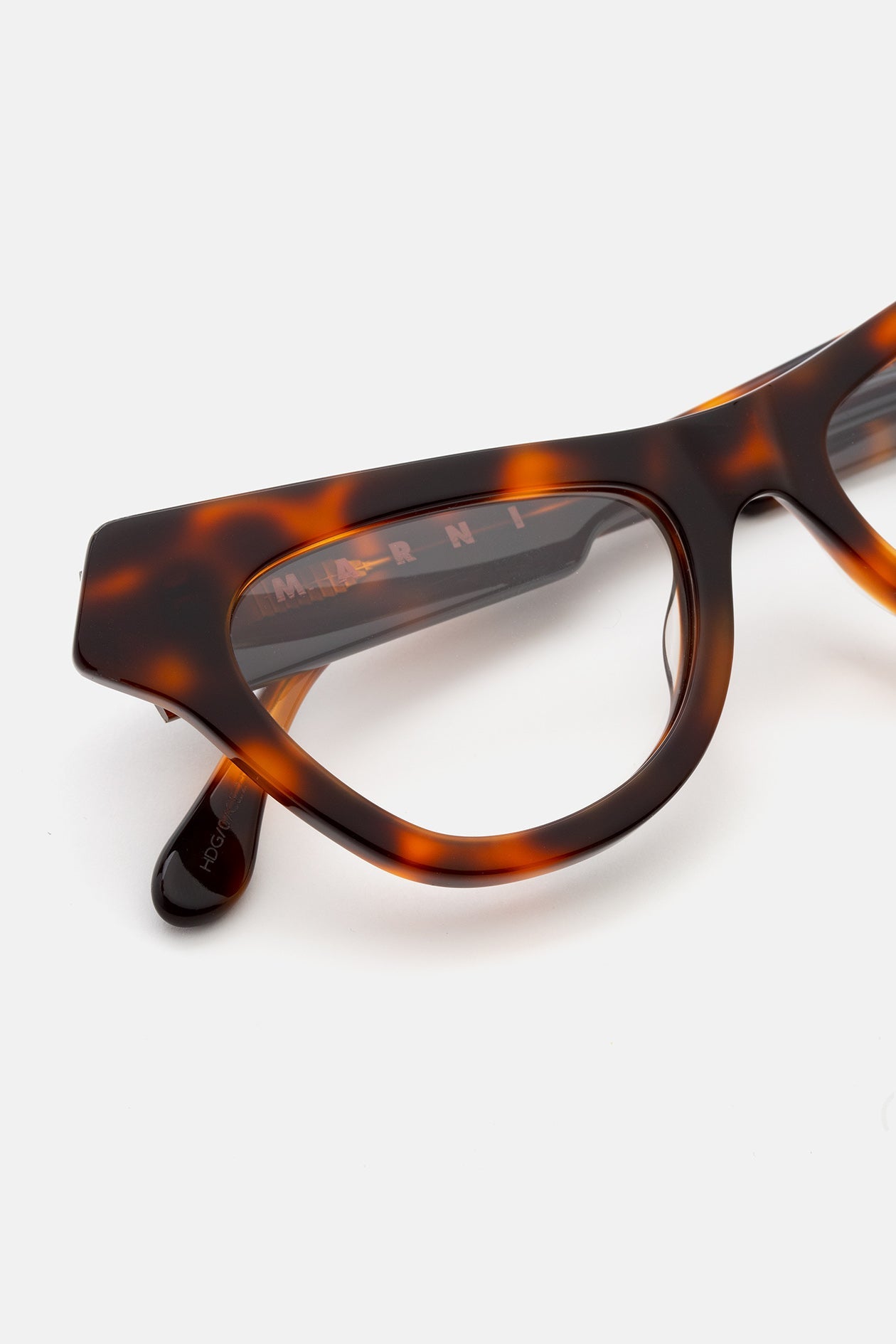 Designed exclusively for Marni, Jeju Island is a bold Optical frame characterised by a chunky acetate construction and sculpted rims. The model is a unique reinterpretation of cat-eye shapes, with triangular lenses and a pointed front. The unique v-shaped browline is matched by softly curved lenses. This version features a Havana acetate.