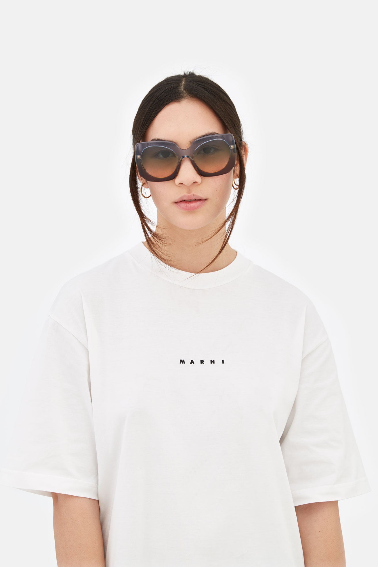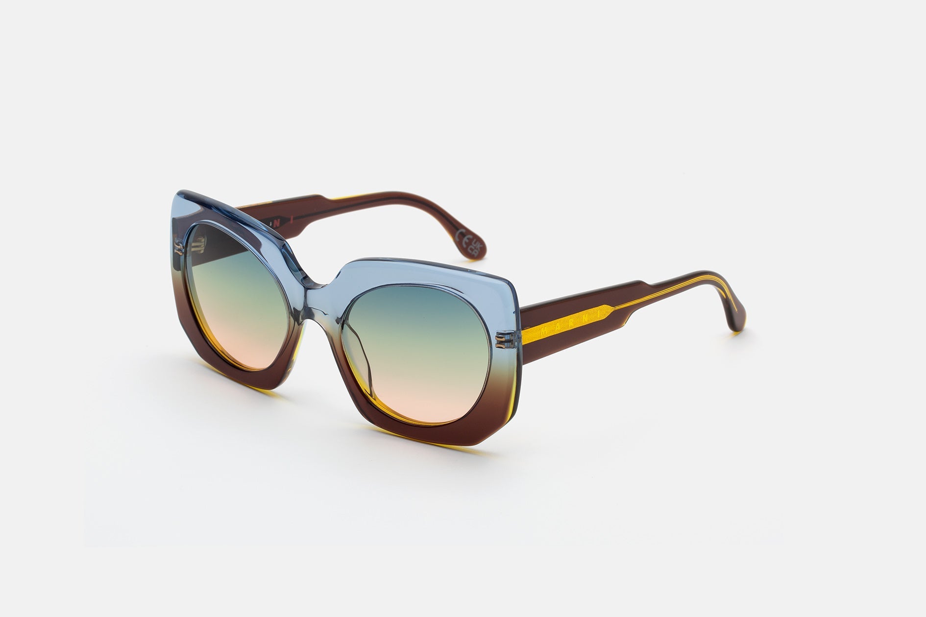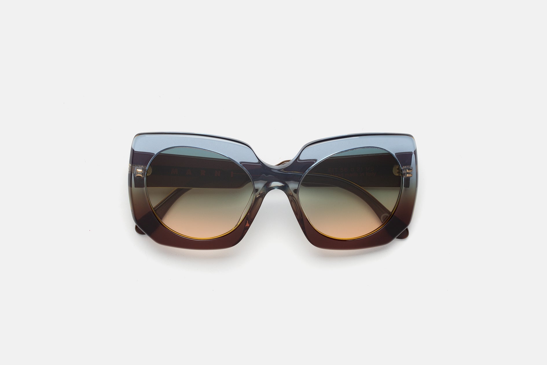 Designed exclusively for Marni, Jellyfish Lake are bold, iconic sunglasses characterised by off-set oversized lenses with a tweaked 1960s aesthetic. The thick acetate construction emphasises the material, tactile qualities of exceptional Italian acetate, with its sturdy temples and chiselled rims. The playful contrast between the rectangular rims and oblique, jellyfish shaped lenses gives this model its eclectic and unique identity. Jellyfish Lake comes in a unique multicolored fading acetate with faded tinted lenses.
