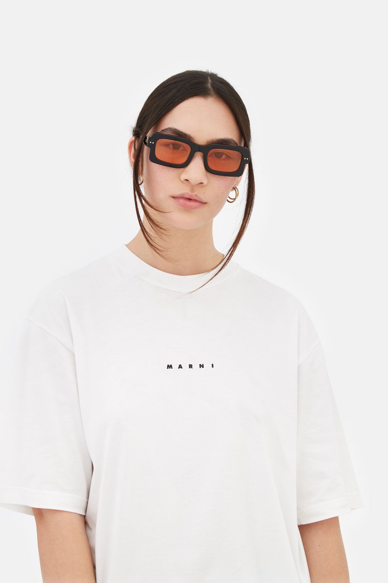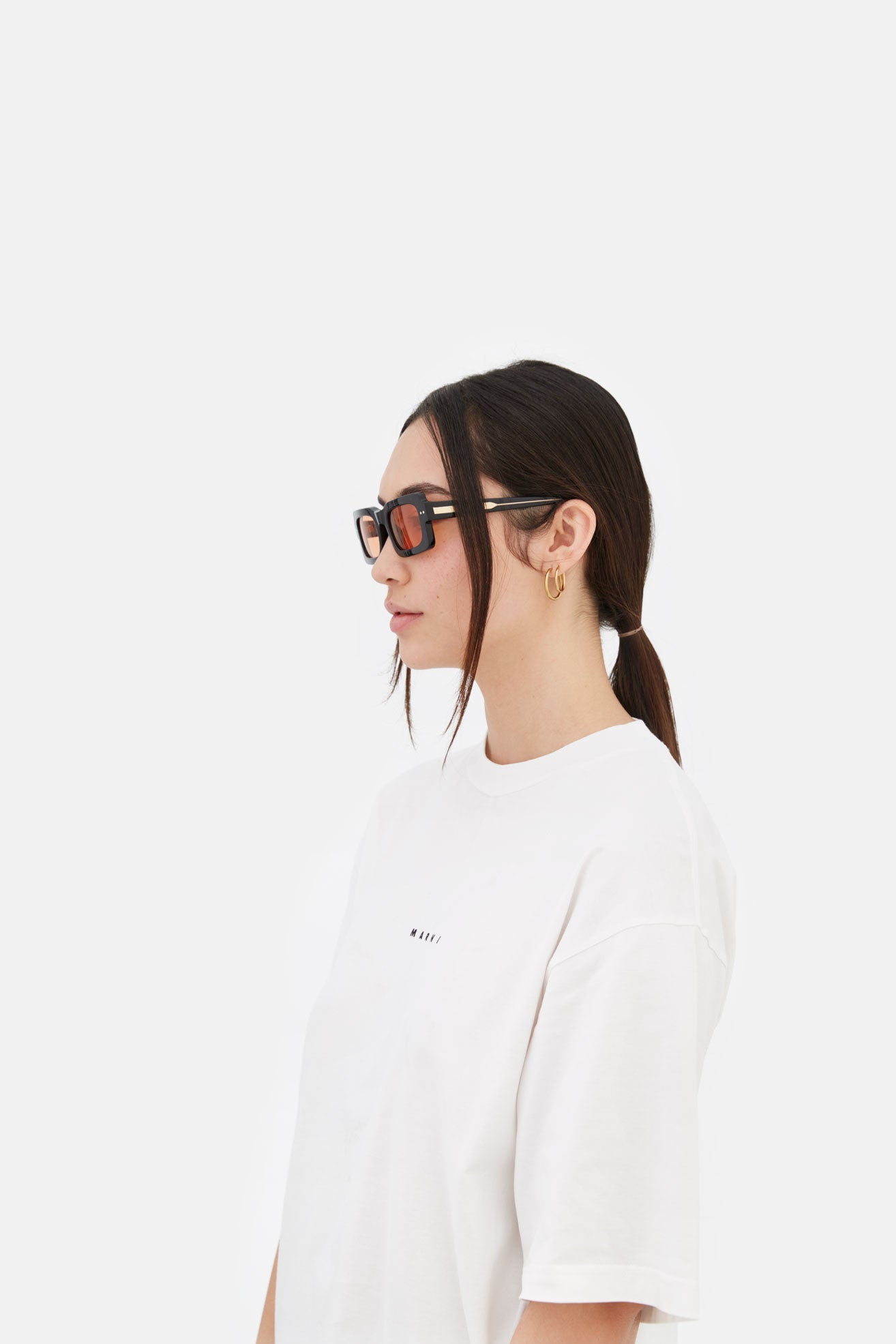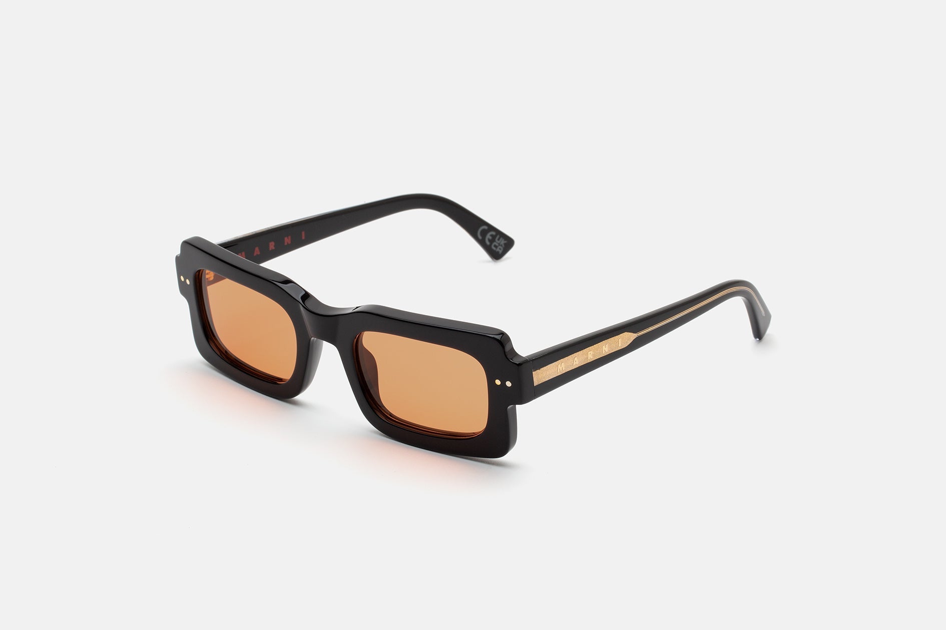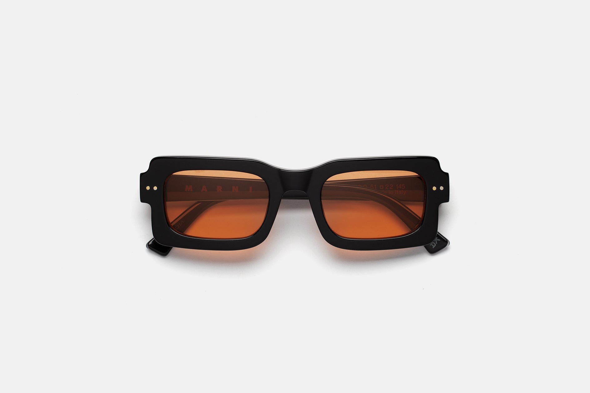 Designed exclusively for Marni, Lake Vostok is a bold silhouette characterised by a low-riding profile with a sturdy nose-bridge. It fuses essential minimalism with an approach to deconstruction that is distinctive of Marni’s brand identity. The model features thick acetate rims with squared temple tips and sleek temples revealing an engraved metal core. This version comes with a black acetate and orange tinted lenses.