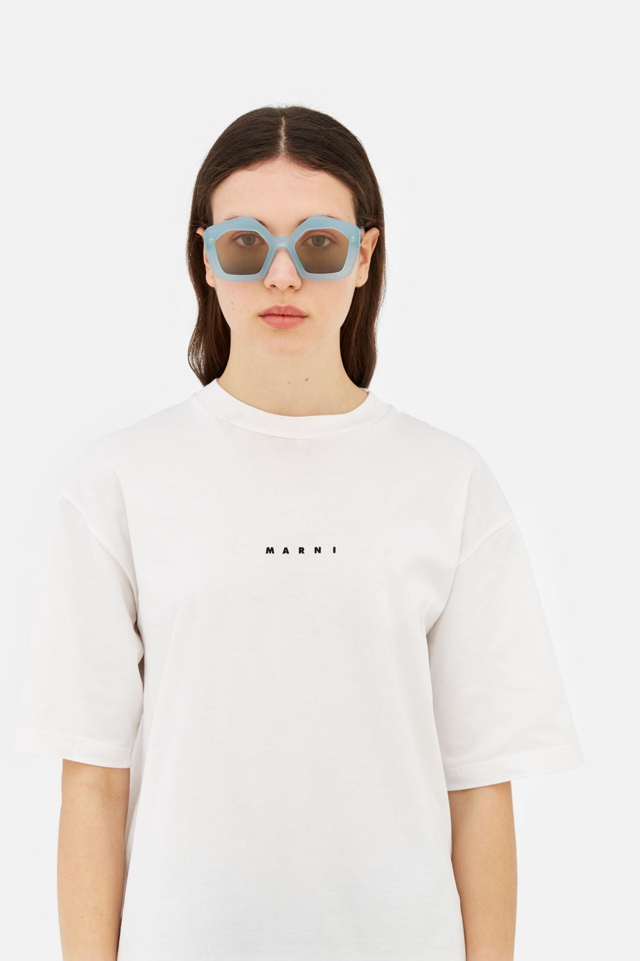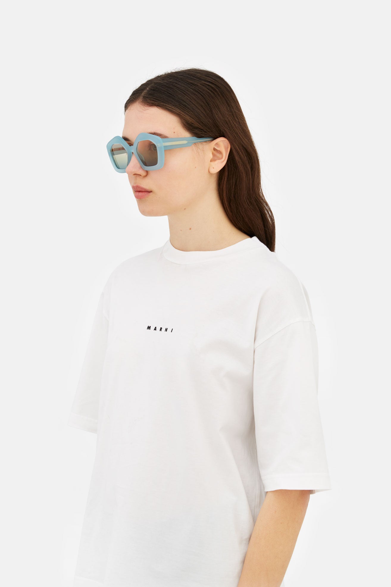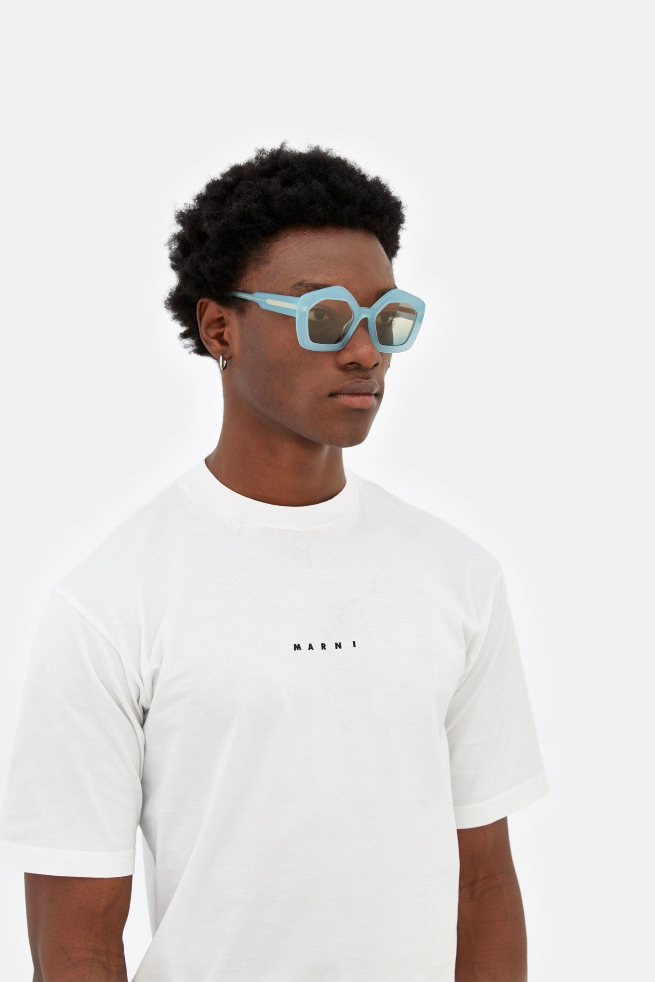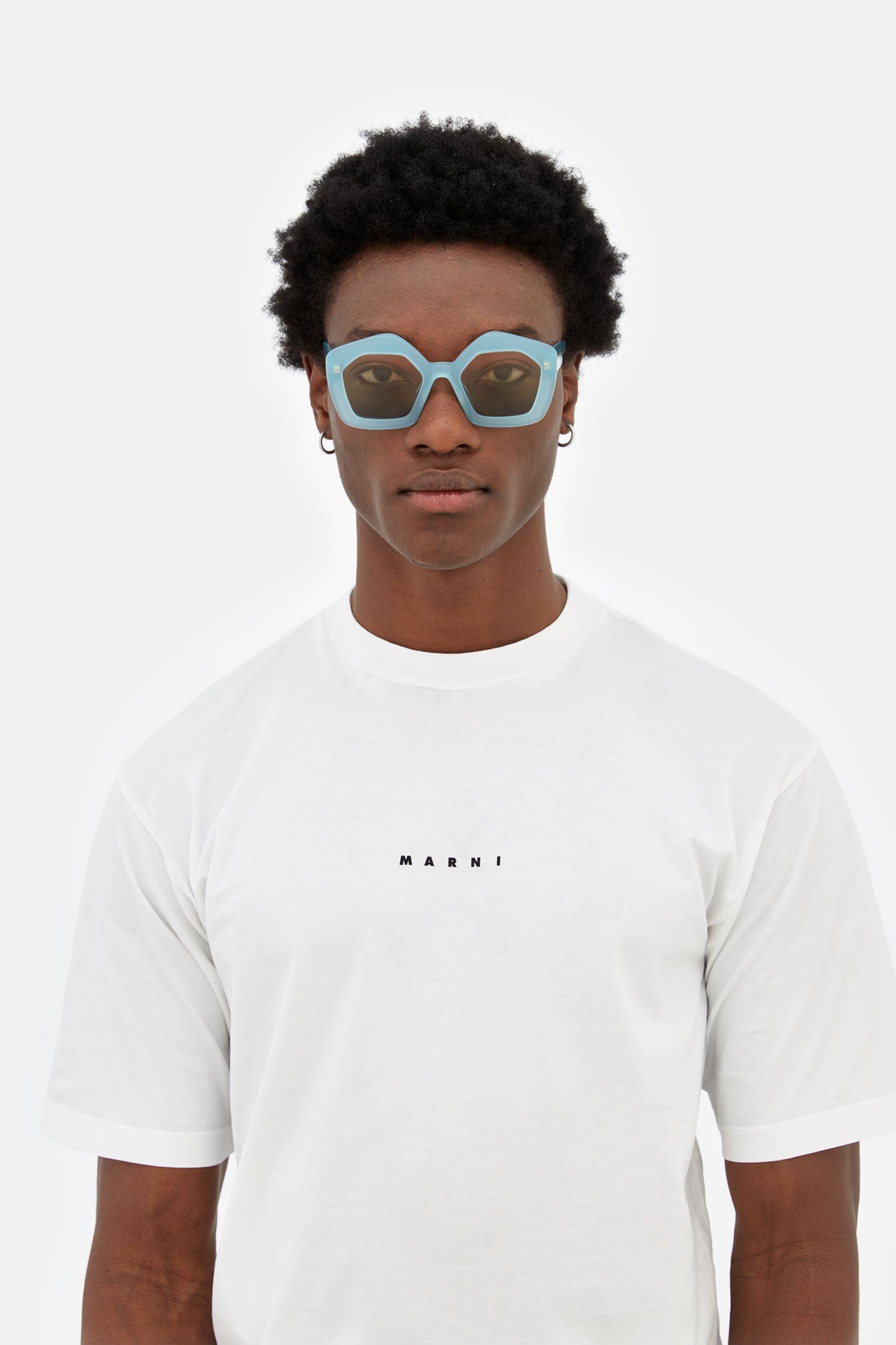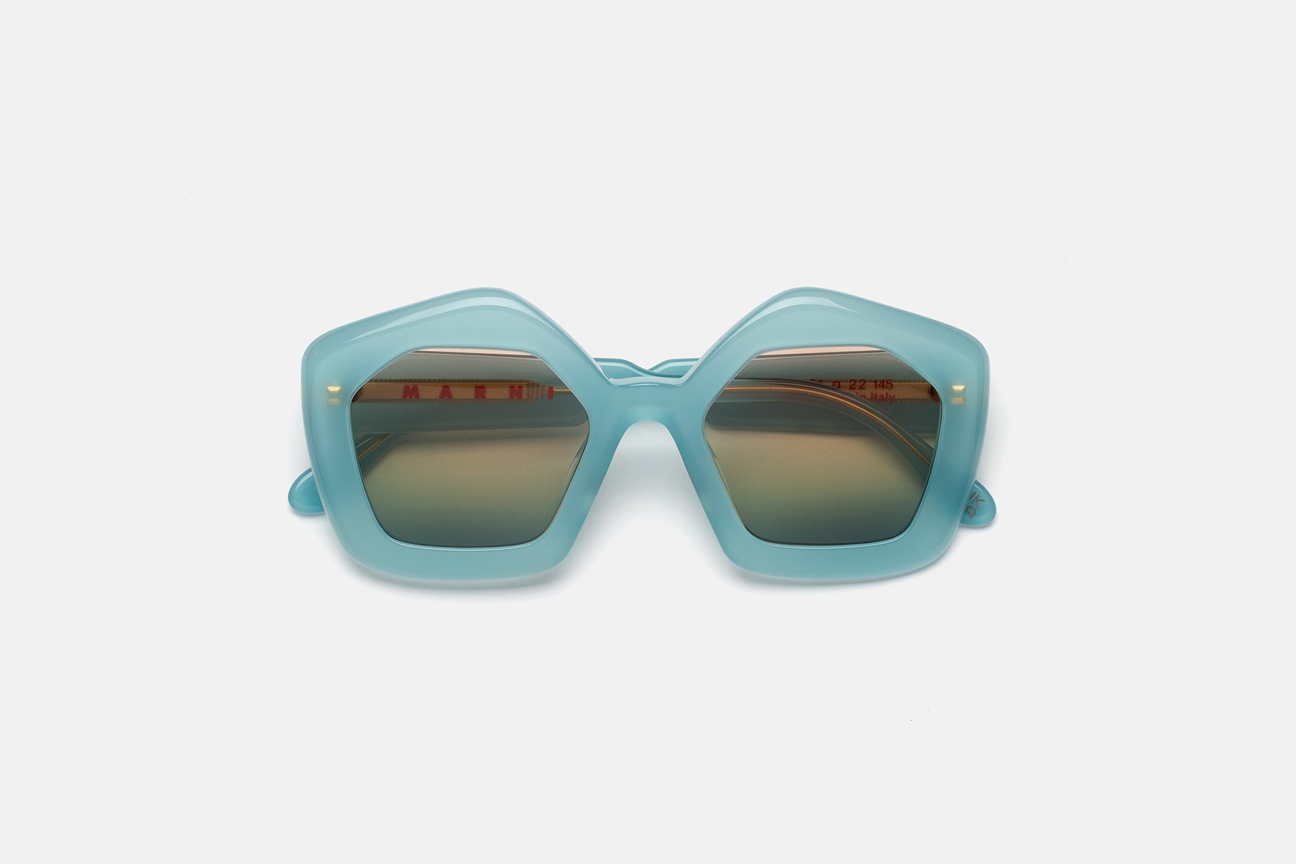 Designed exclusively for Marni, Laughing Waters captures the iconic Italian brand’s quirky, eclectic approach to style. This thick acetate silhouette is characterised by oversized lenses and sculpted rims. The model’s iconic pentagonal lens shape is a reinterpretation of Marni’s heritage silhouette. This version comes with a light blue tinted acetate and fading colorful lenses.