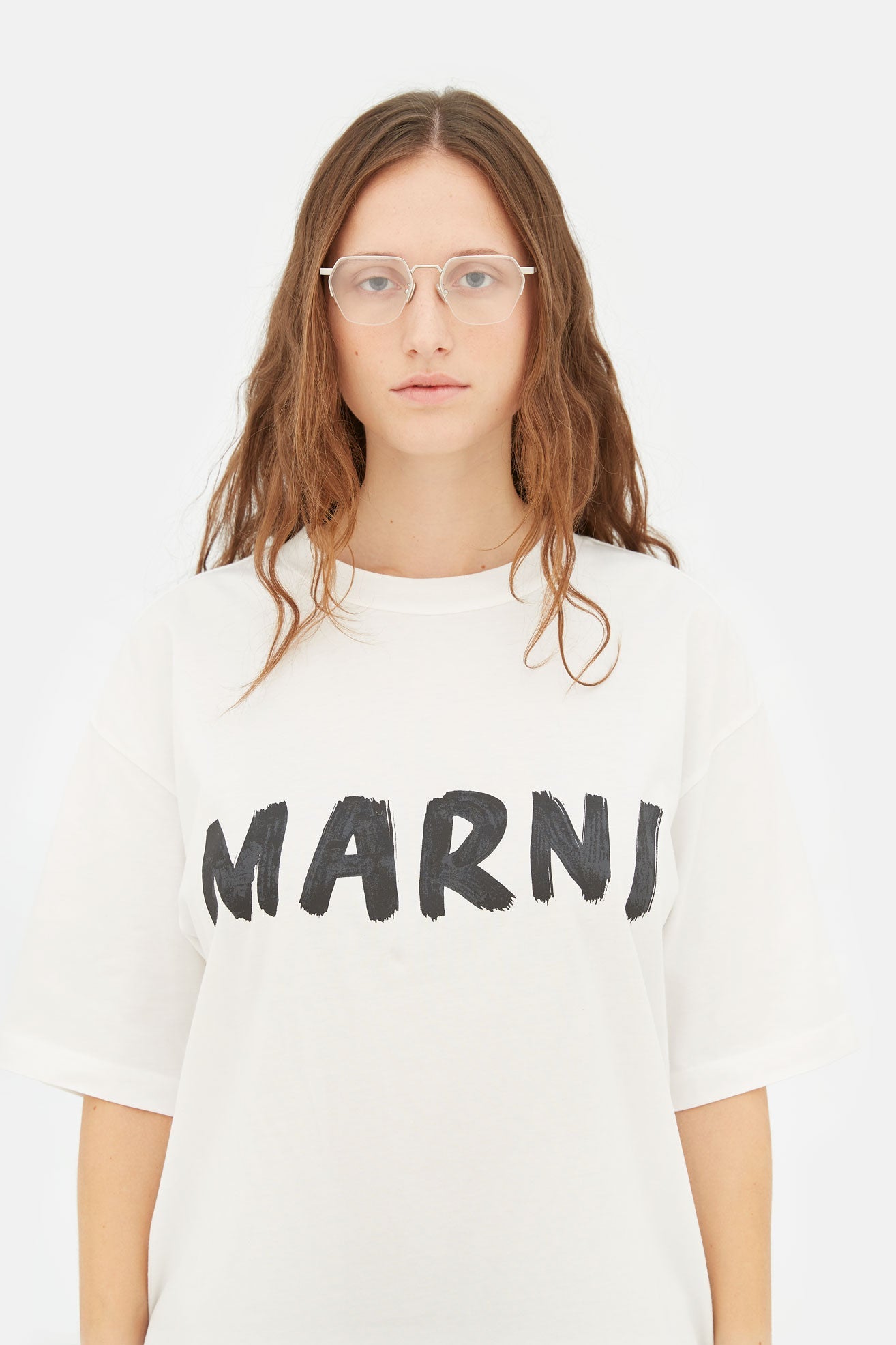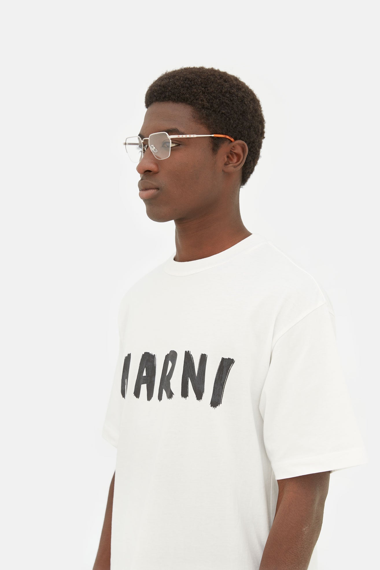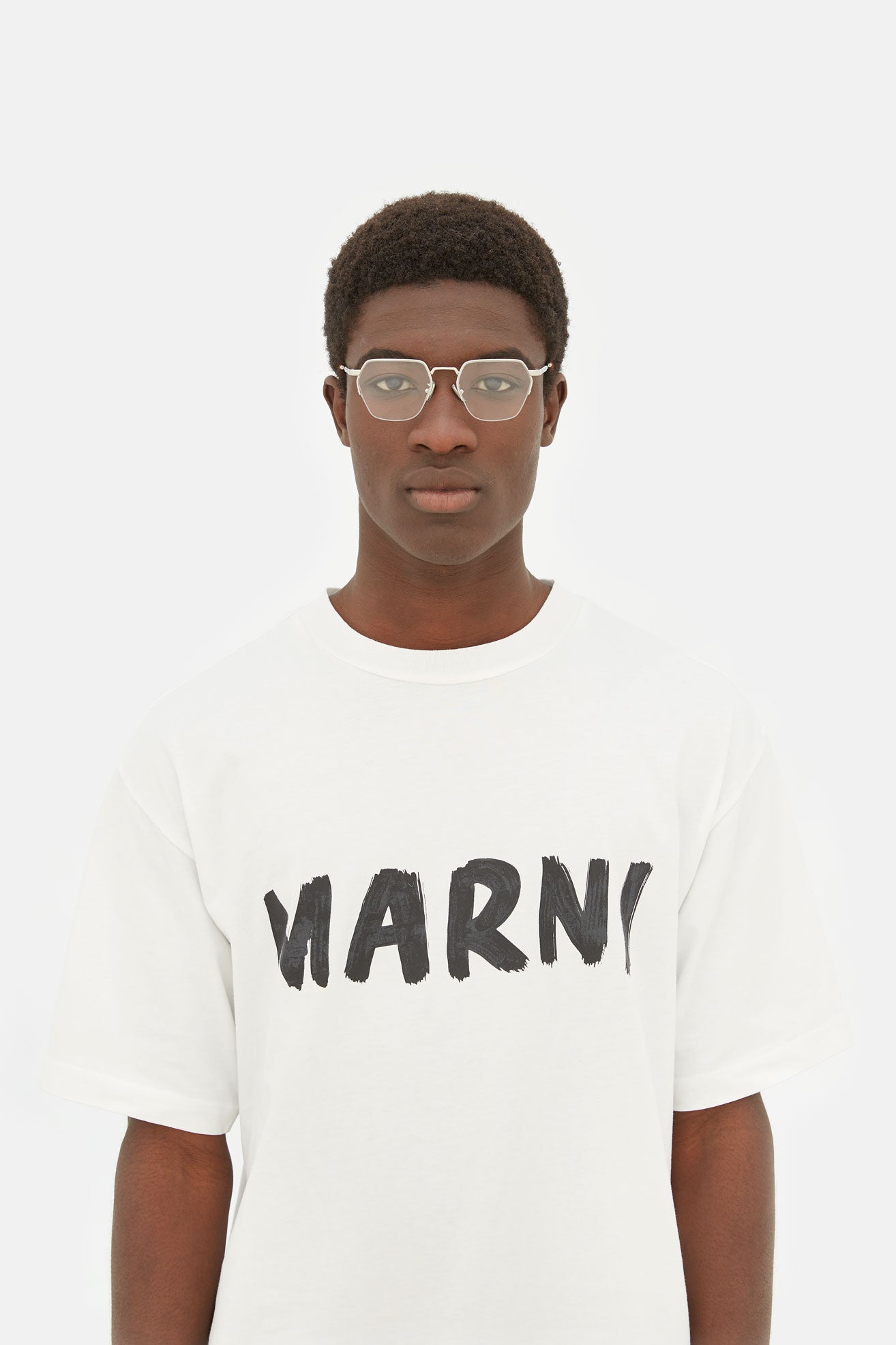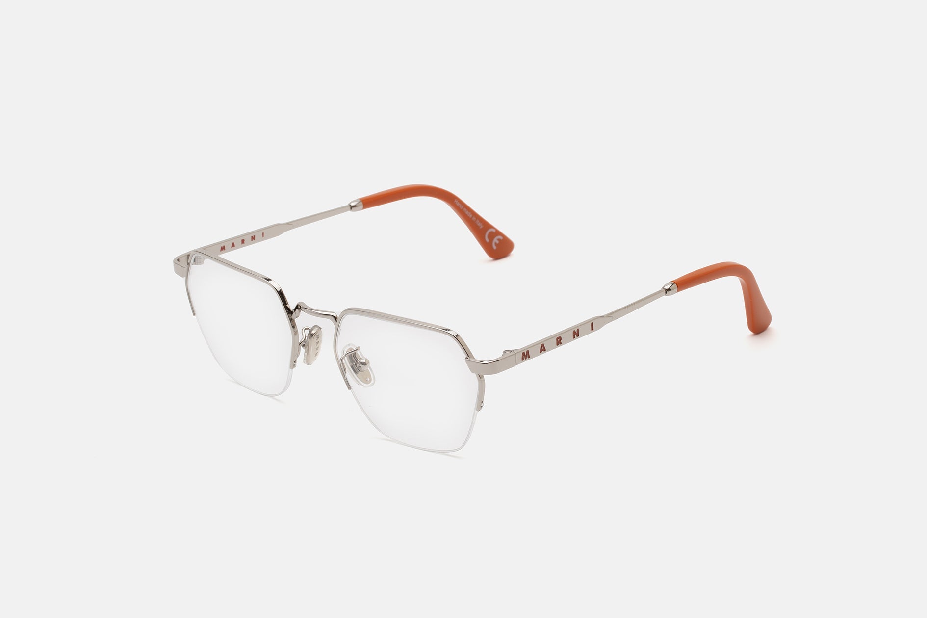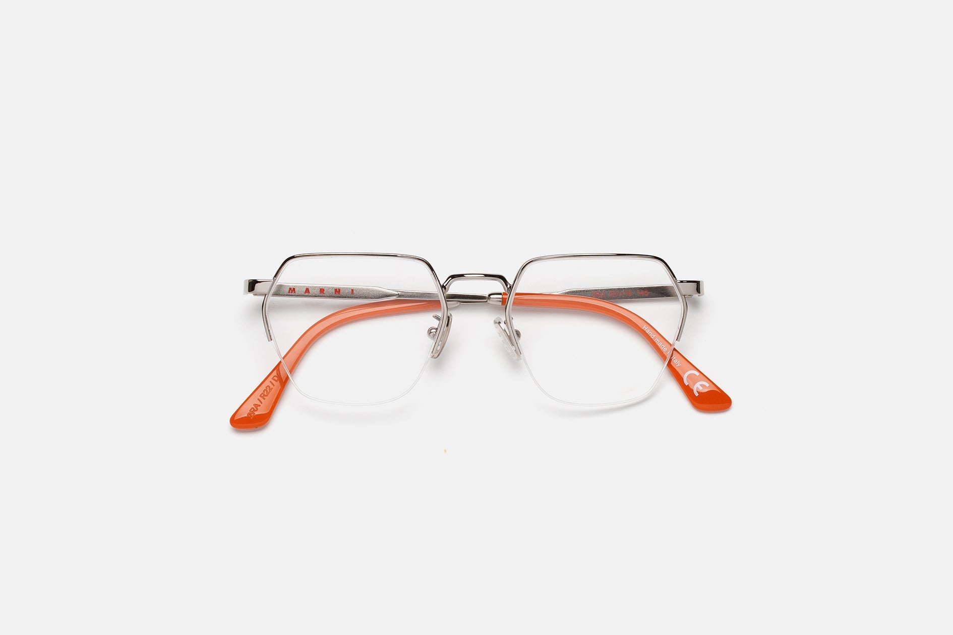Designed exclusively for Marni, Mother Cliffs is an innovative interpretation of metal optical frames. Characterized by an oversized shape, the silhouette features a unique hexagonal design with wider rims on the top and asymmetrical lenses. The lightweight design was streamlined for comfort in everyday use. This model comes in a silver finish with orange acetate temples.