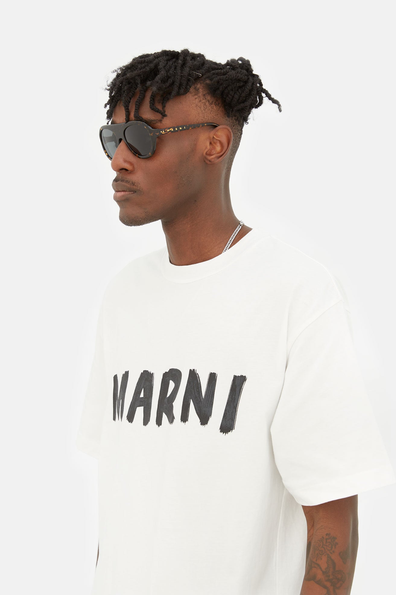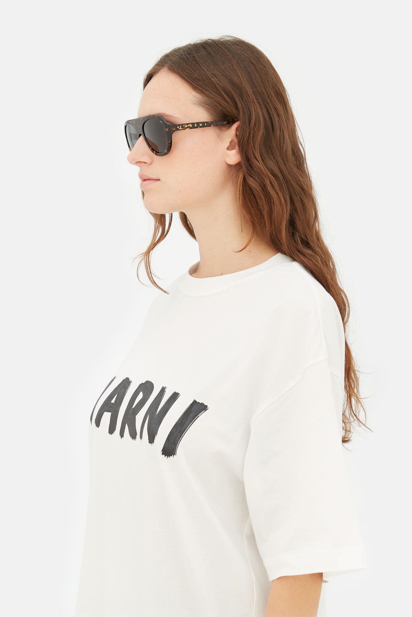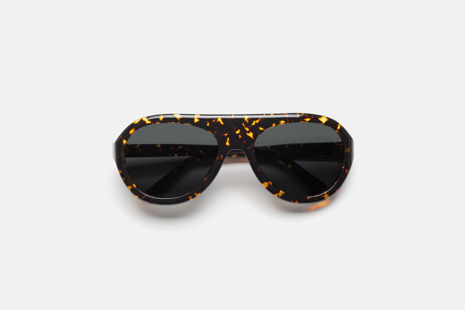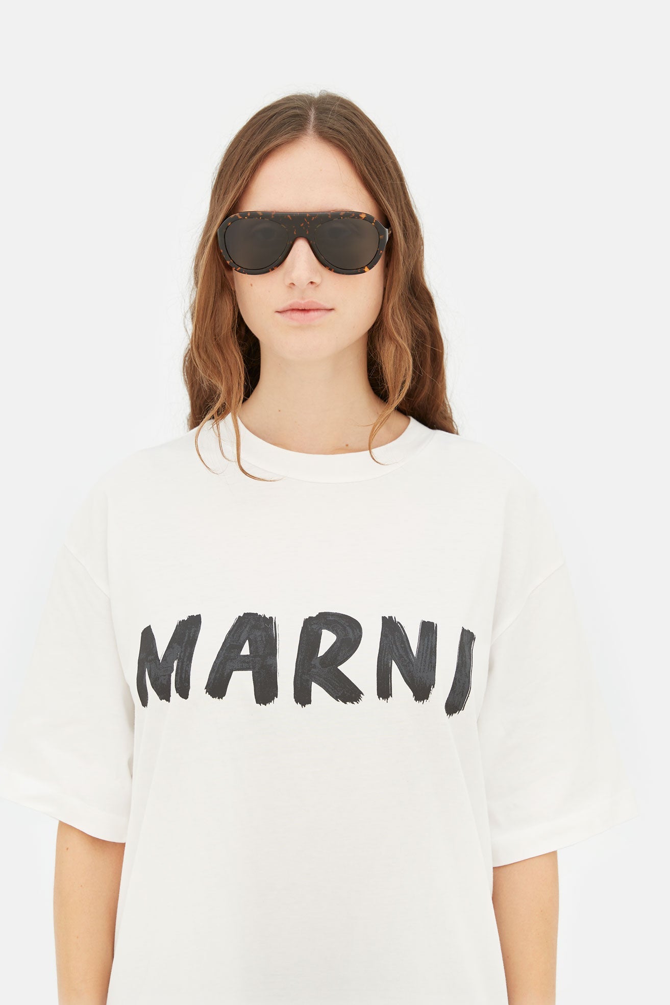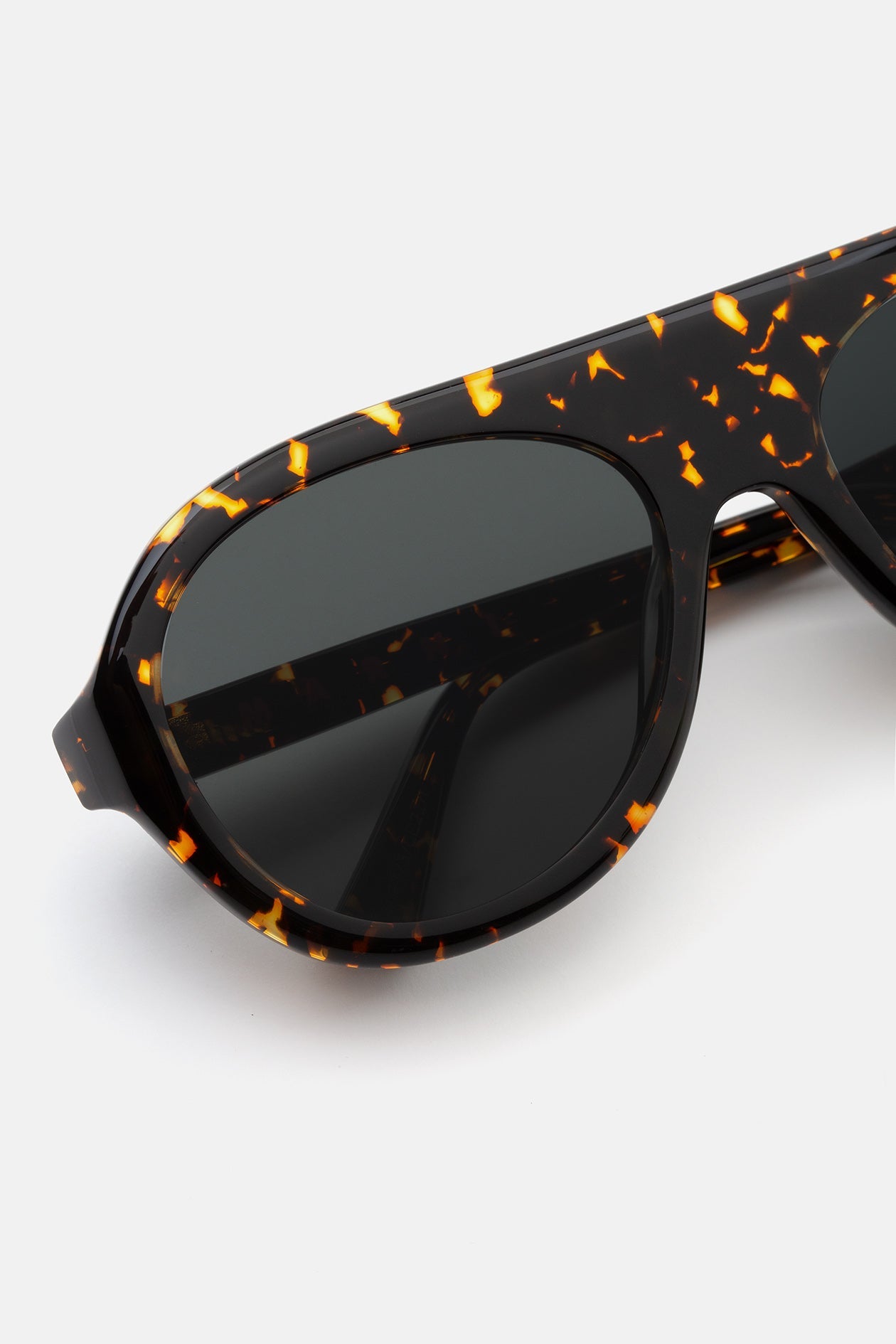 Mount Toc is a bold interpretation of classic aviator-style designs. In true Marni fashion, this timeless design was updated with bold geometries and quirky detailing, for an aesthetics that references 1970s sportswear glamour. Its broad structure features a sturdy nose-bridge and pear-shape lenses encased within chunky acetate rims. This model comes in a vibrant Havana acetate with black lenses.