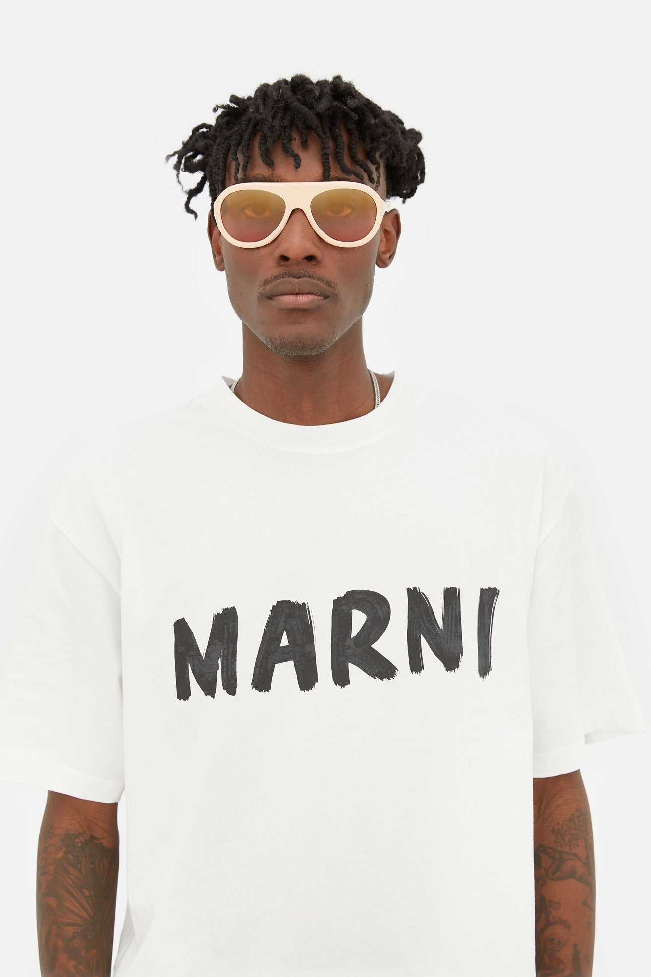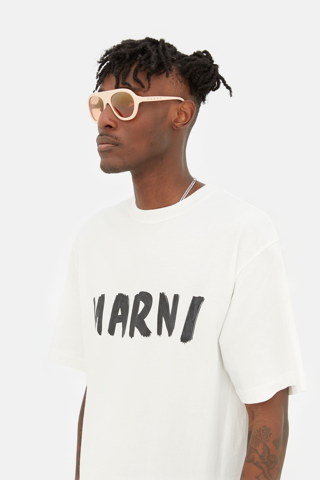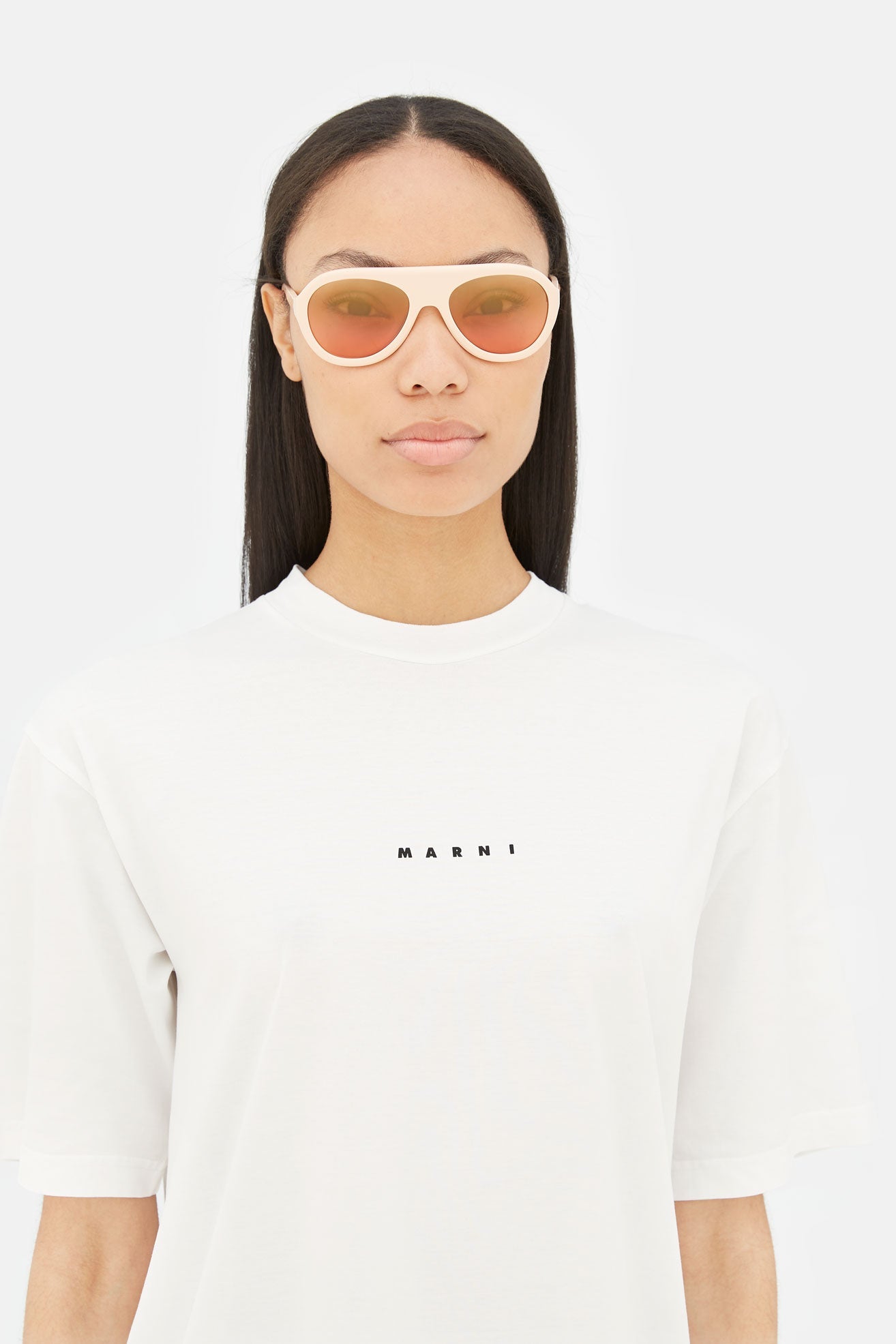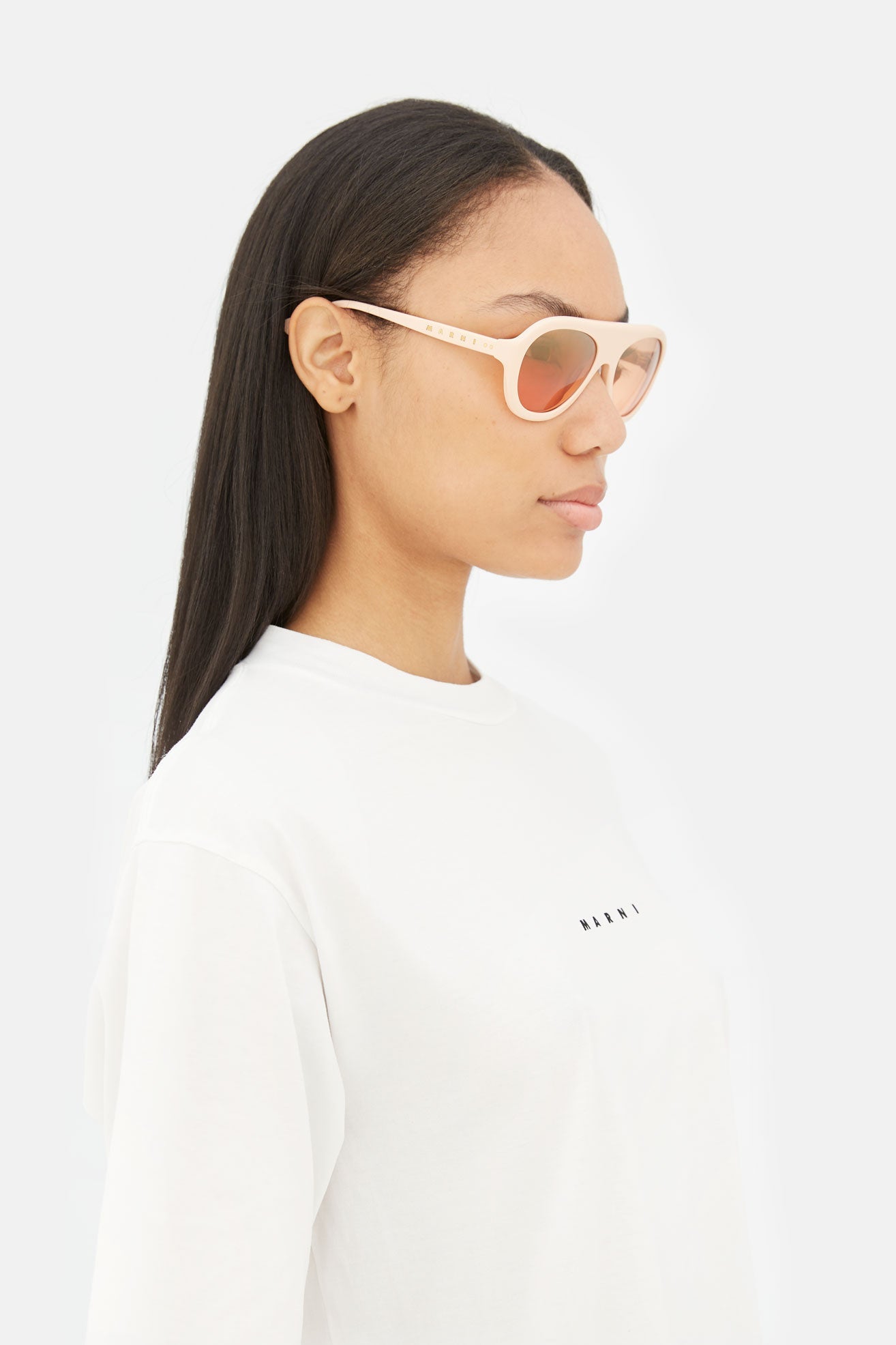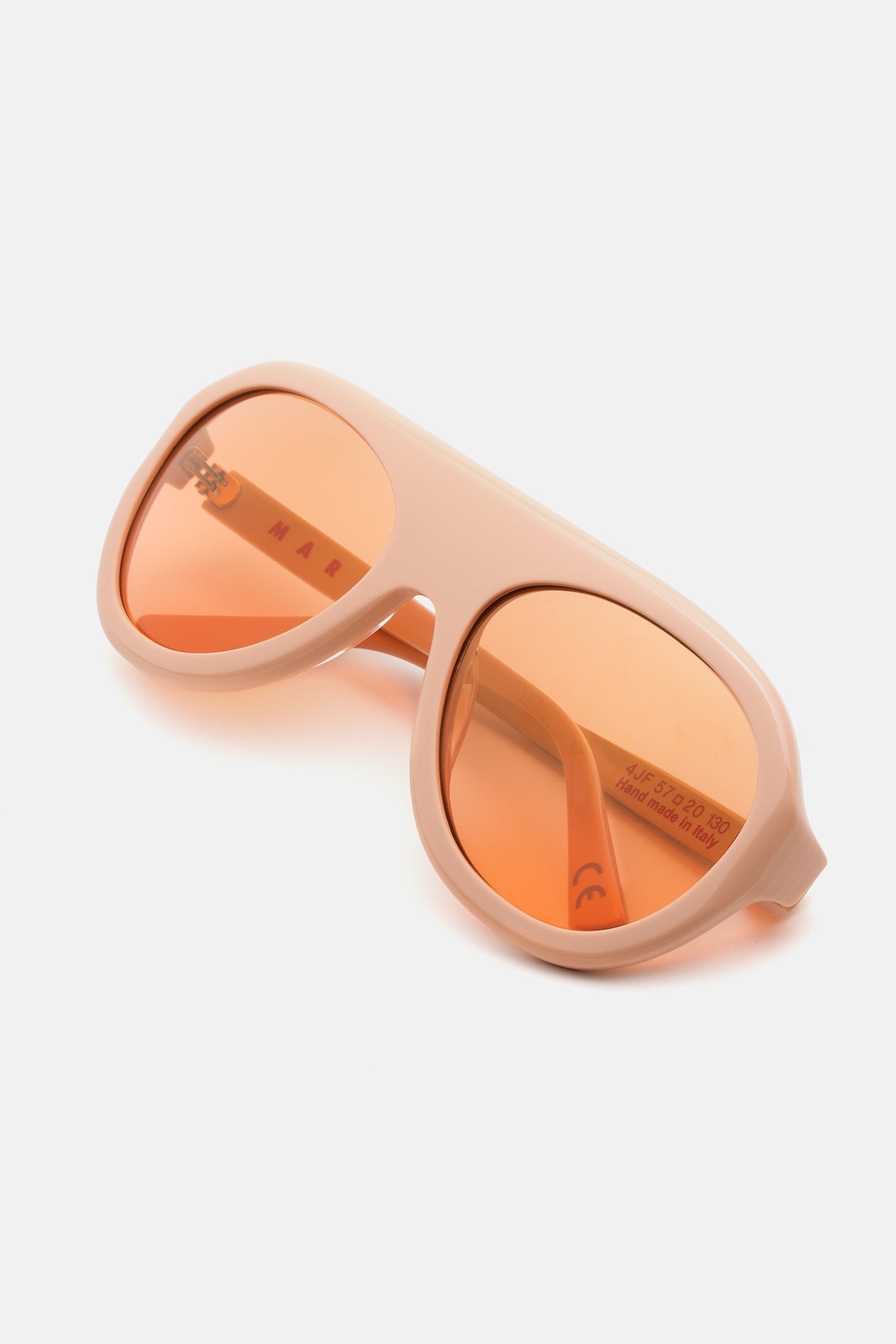 Mount Toc is a bold interpretation of classic aviator-style designs. In true Marni fashion, this timeless design was updated with bold geometries and quirky detailing, for an aesthetics that references 1970s sportswear glamour. Its broad structure features a sturdy nose-bridge and pear-shape lenses encased within chunky acetate rims. This model comes in a light pink acetate with fading orange lenses.