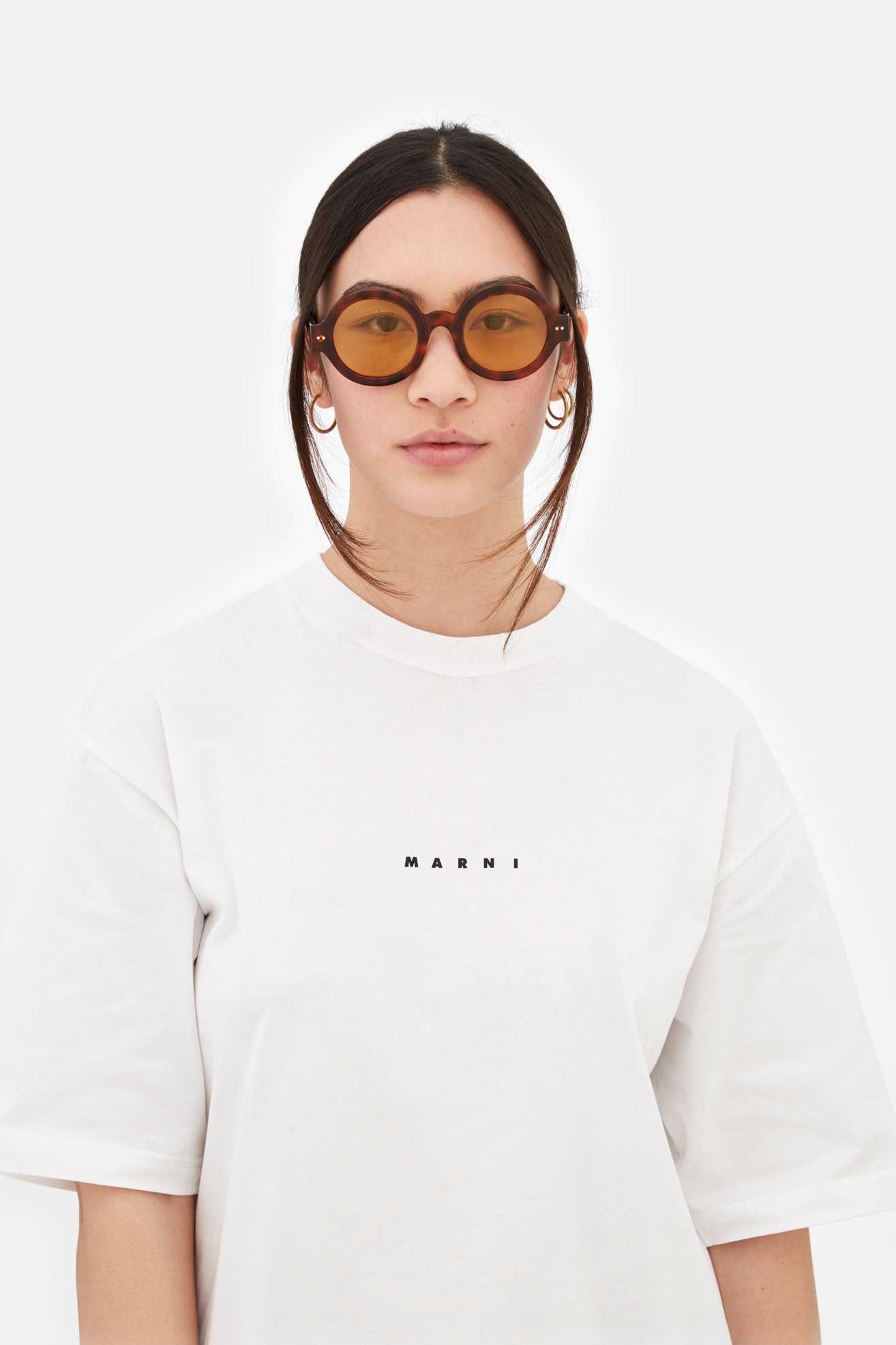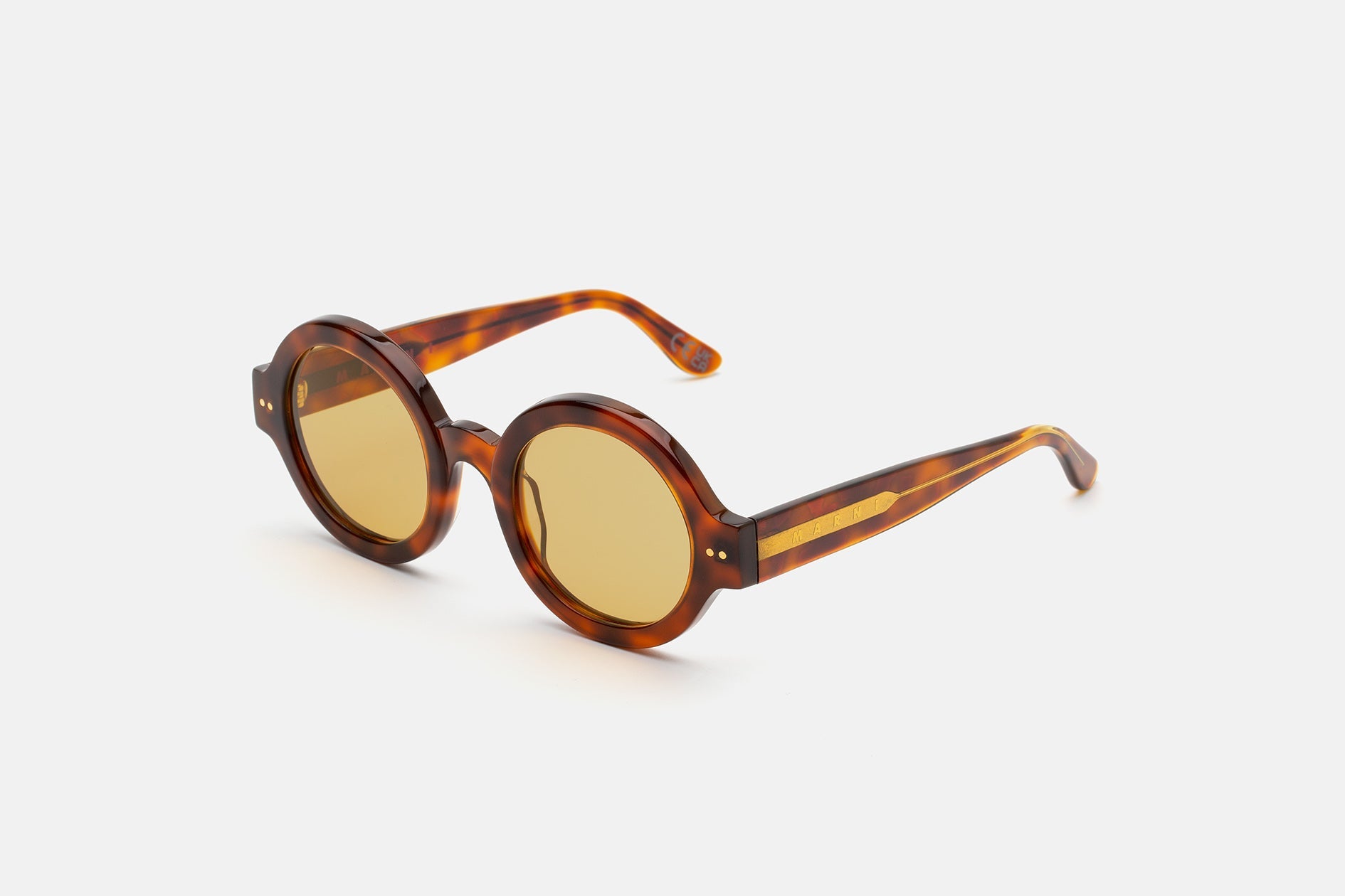 Designed exclusively for Marni, Nakagin Tower is a playful silhouette that praises the historical round shape. The model features rounded lenses encased within thick rims with a curved nose-bridge and sturdy temples. A modernist icon revisited for a fresher, more contemporary aesthetics. This version is available in a warm Havana acetate with mustard tinted lenses.