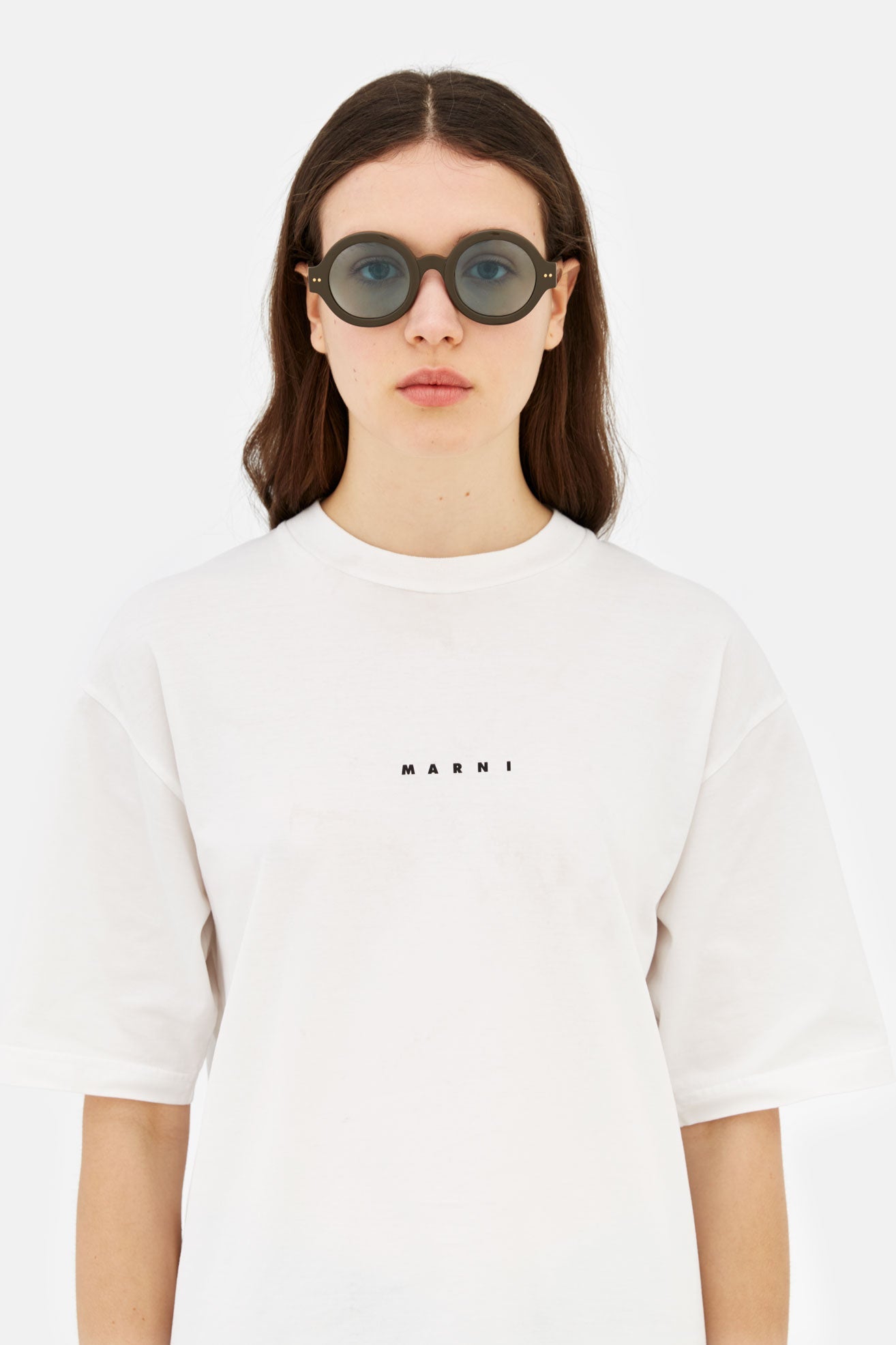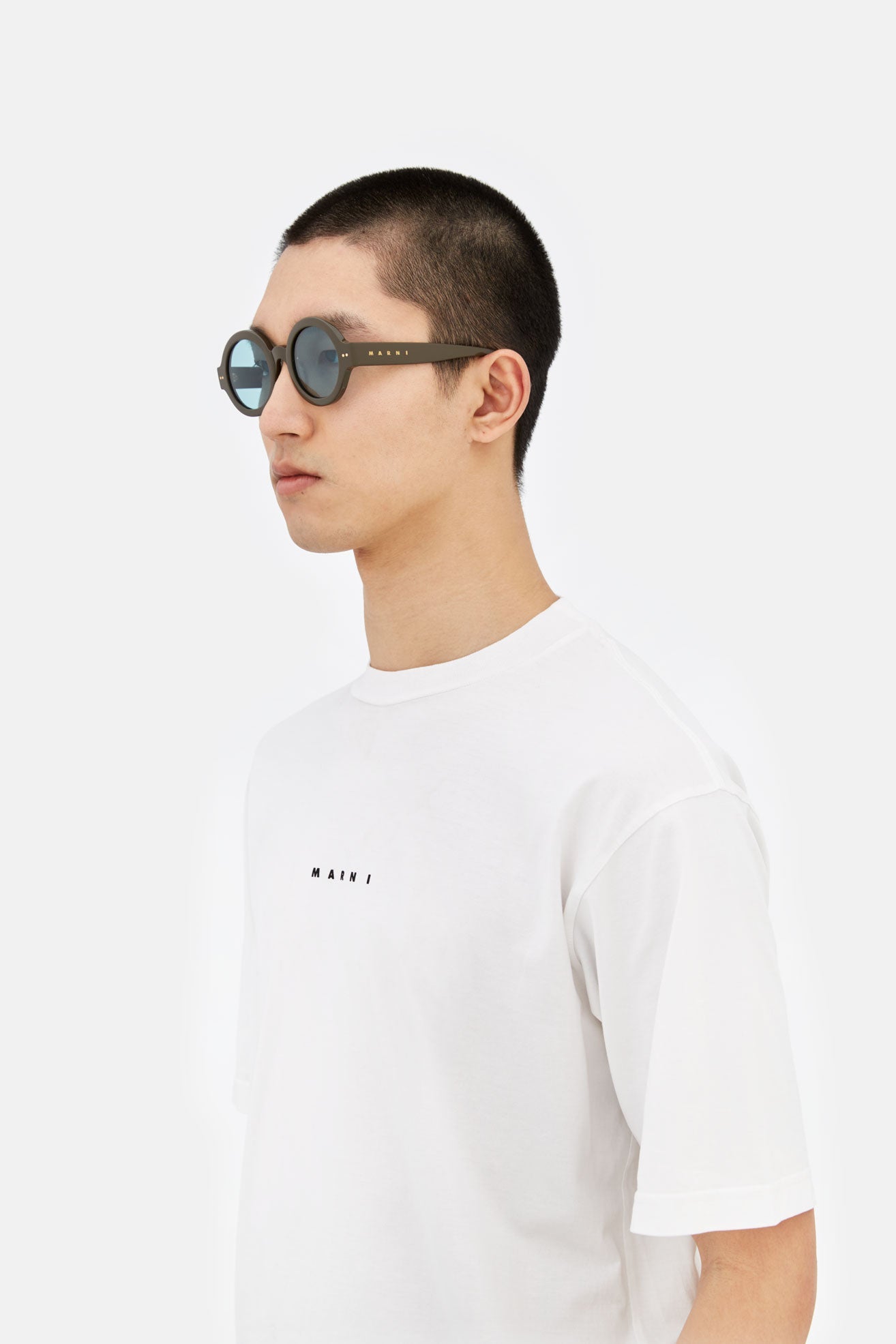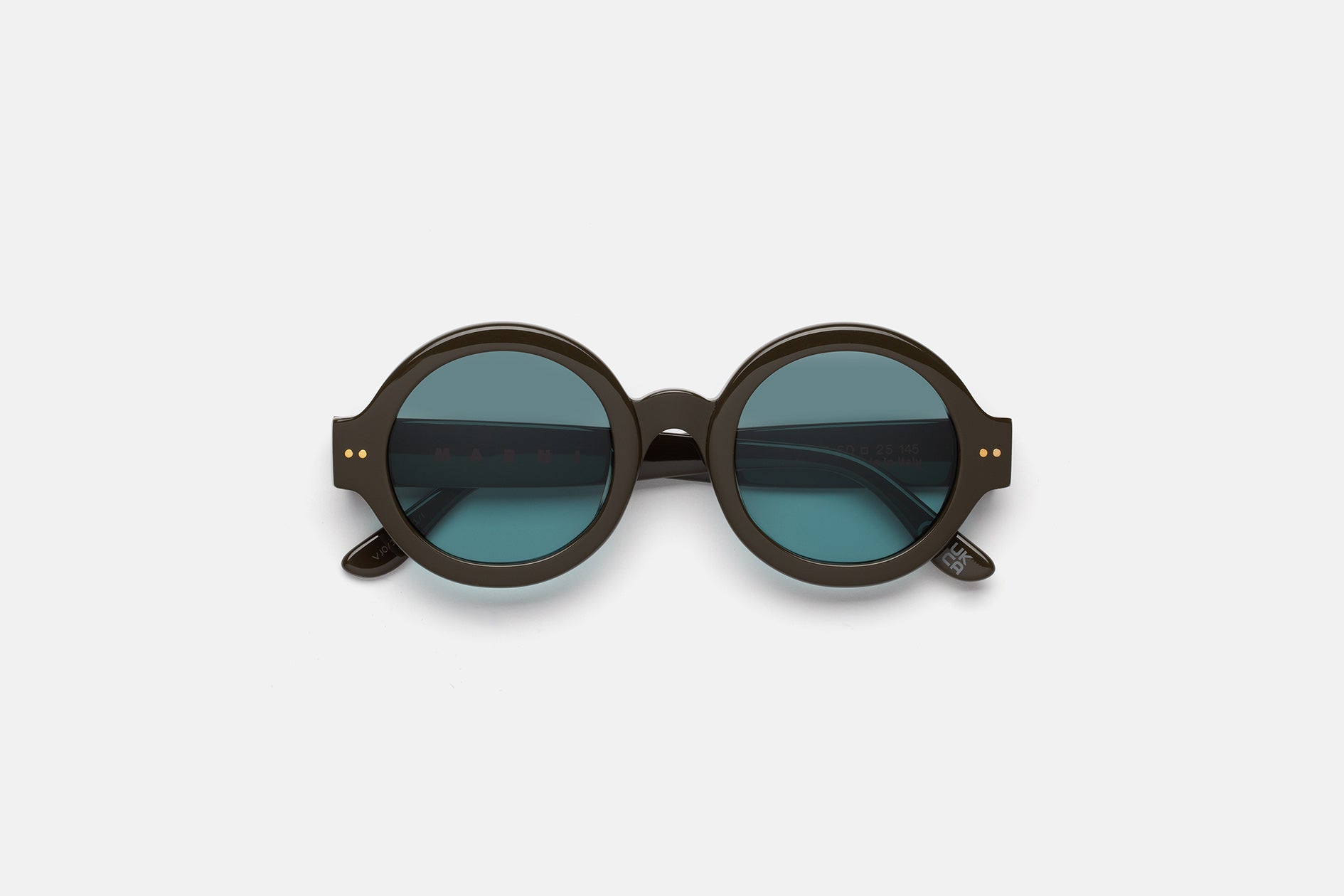 Designed exclusively for Marni, Nakagin Tower is a playful silhouette that praises the historical round shape. The model features rounded lenses encased within thick rims with a curved nose-bridge and sturdy temples. A modernist icon revisited for a fresher, more contemporary aesthetics. This version is available in black acetate with turquoise lenses.