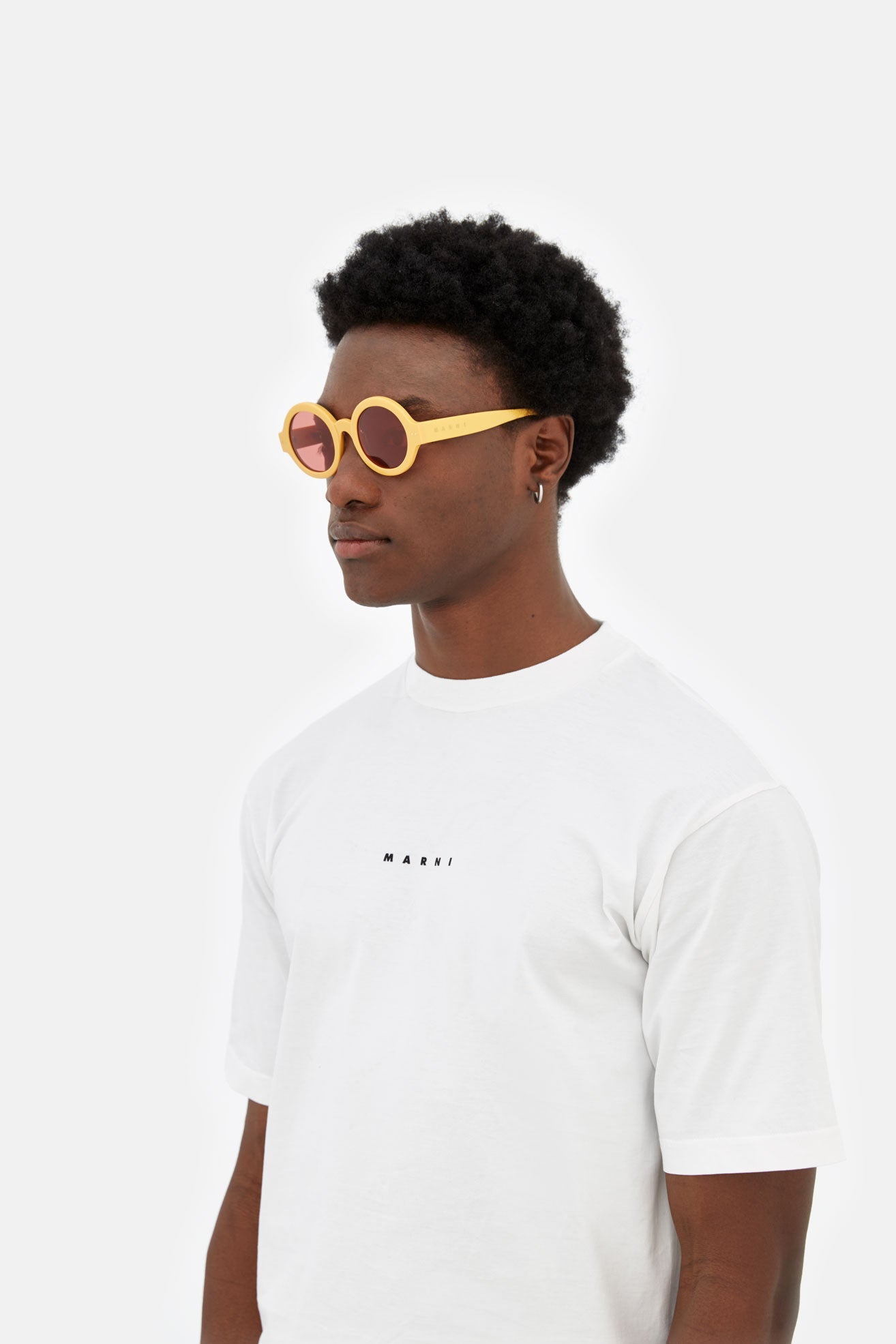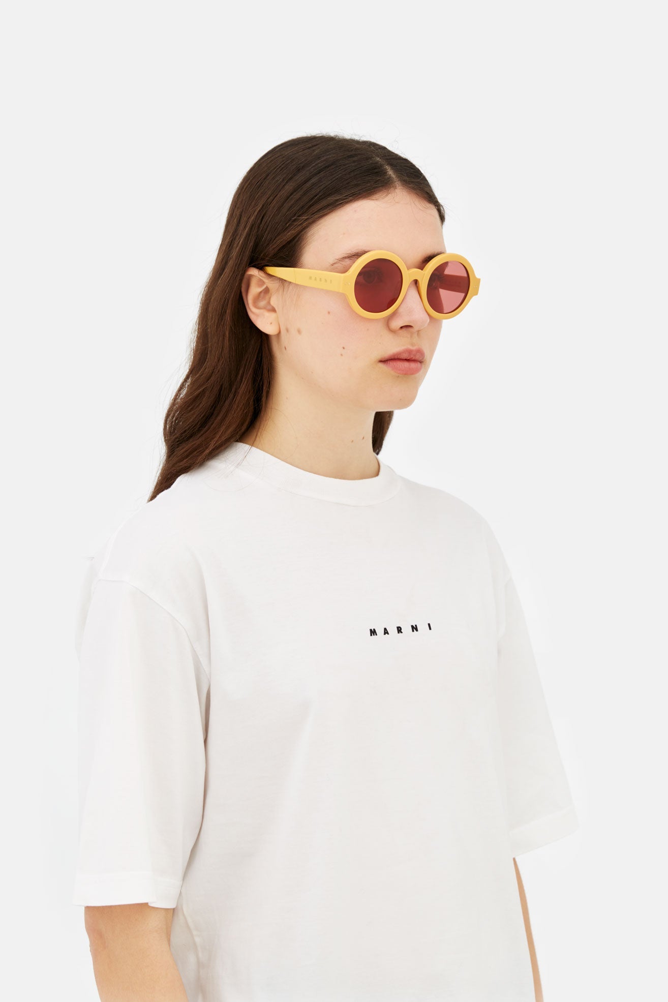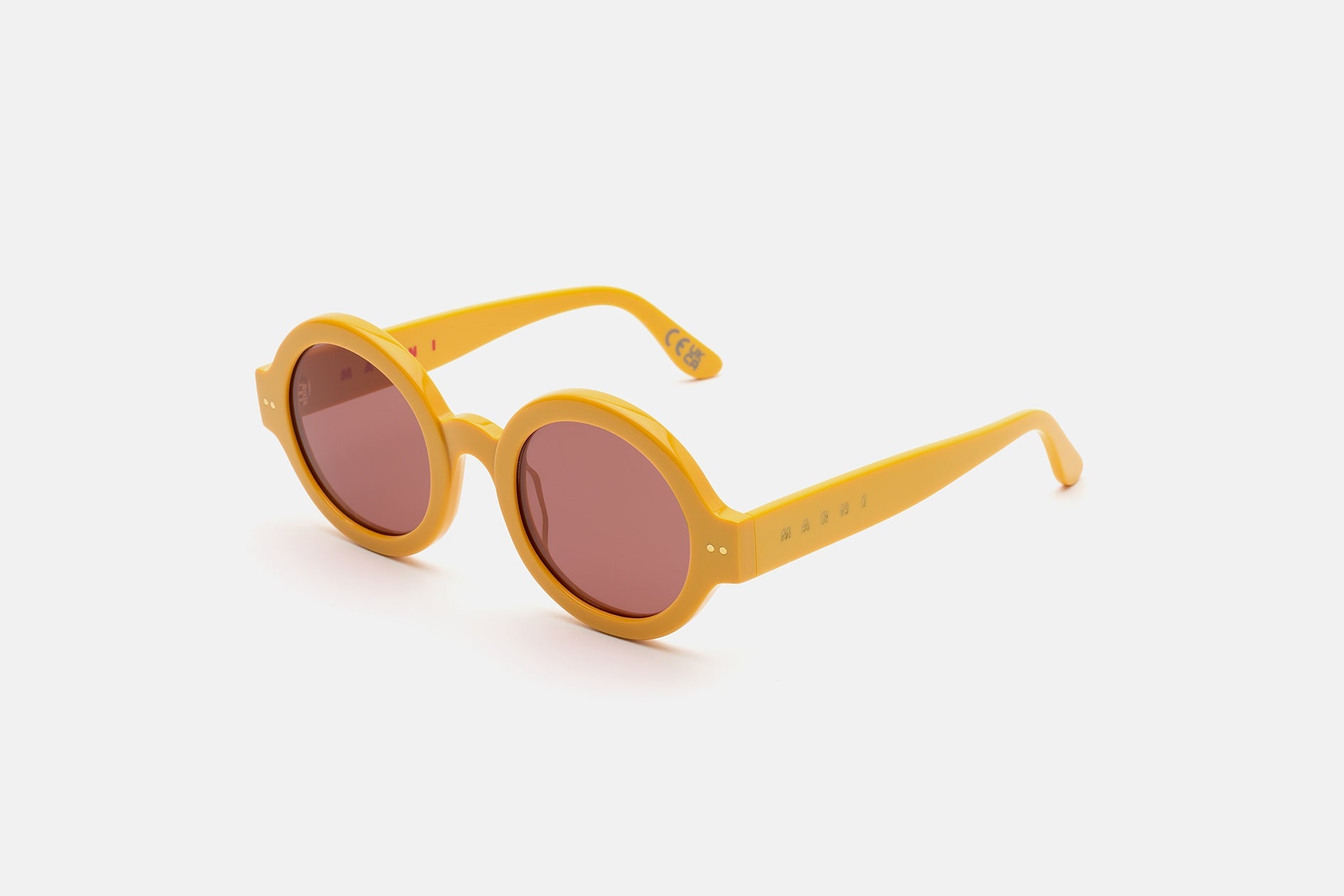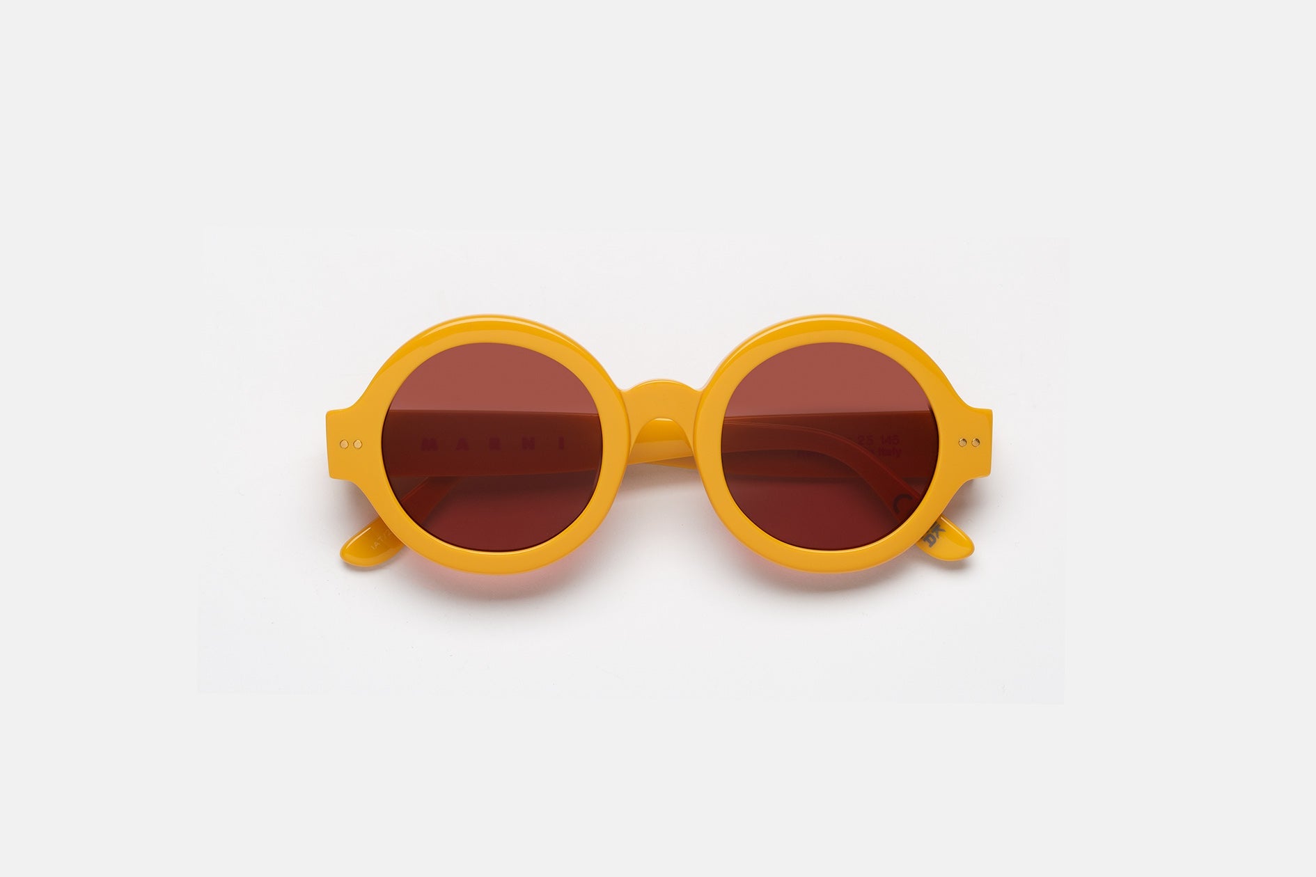 Designed exclusively for Marni, Nakagin Tower is a playful silhouette that praises the historical round shape. The model features rounded lenses encased within thick rims with a curved nose-bridge and sturdy temples. A modernist icon revisited for a fresher, more contemporary aesthetics. This version is available in a soothing honey-yellow acetate with bordeaux tinted lenses.
