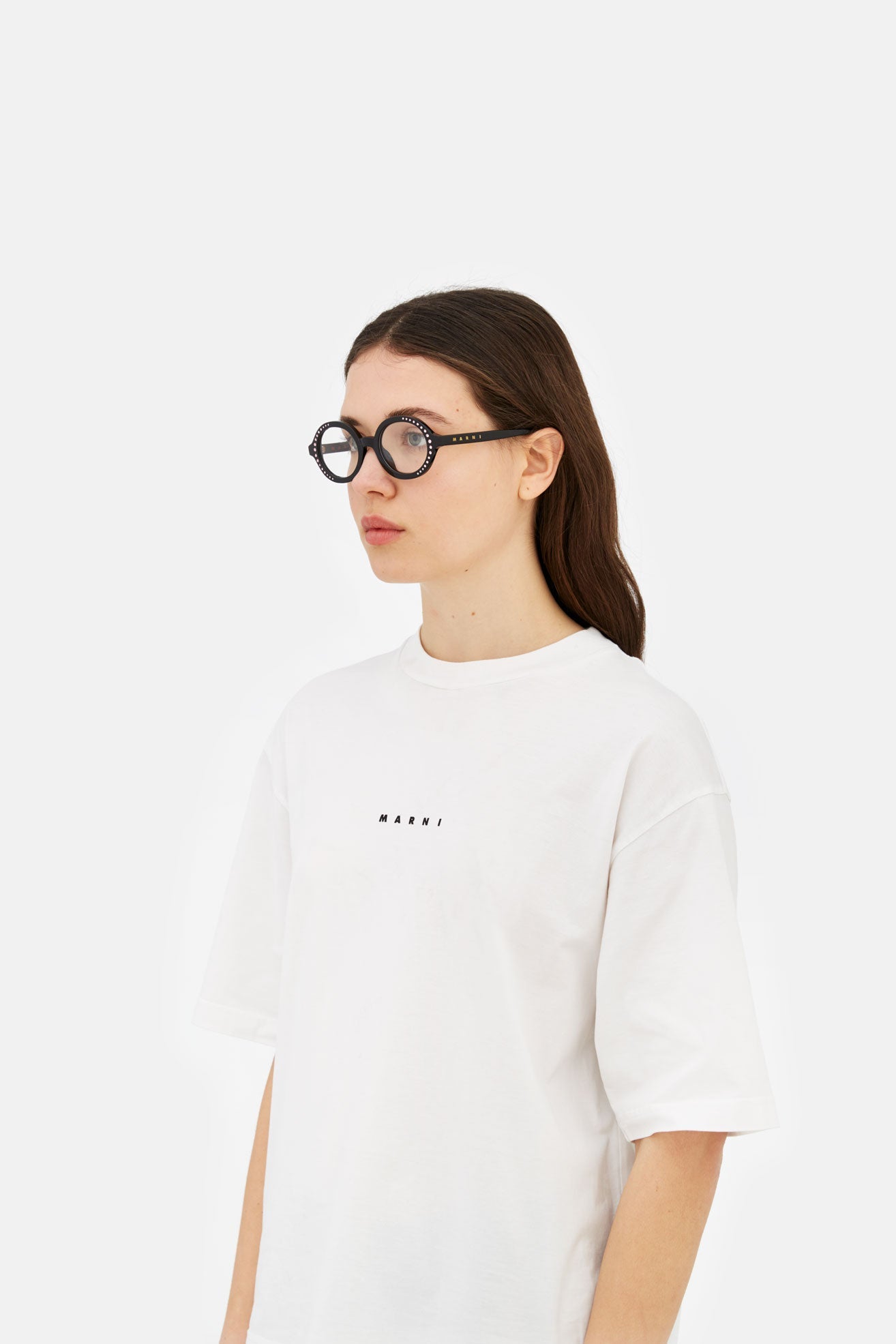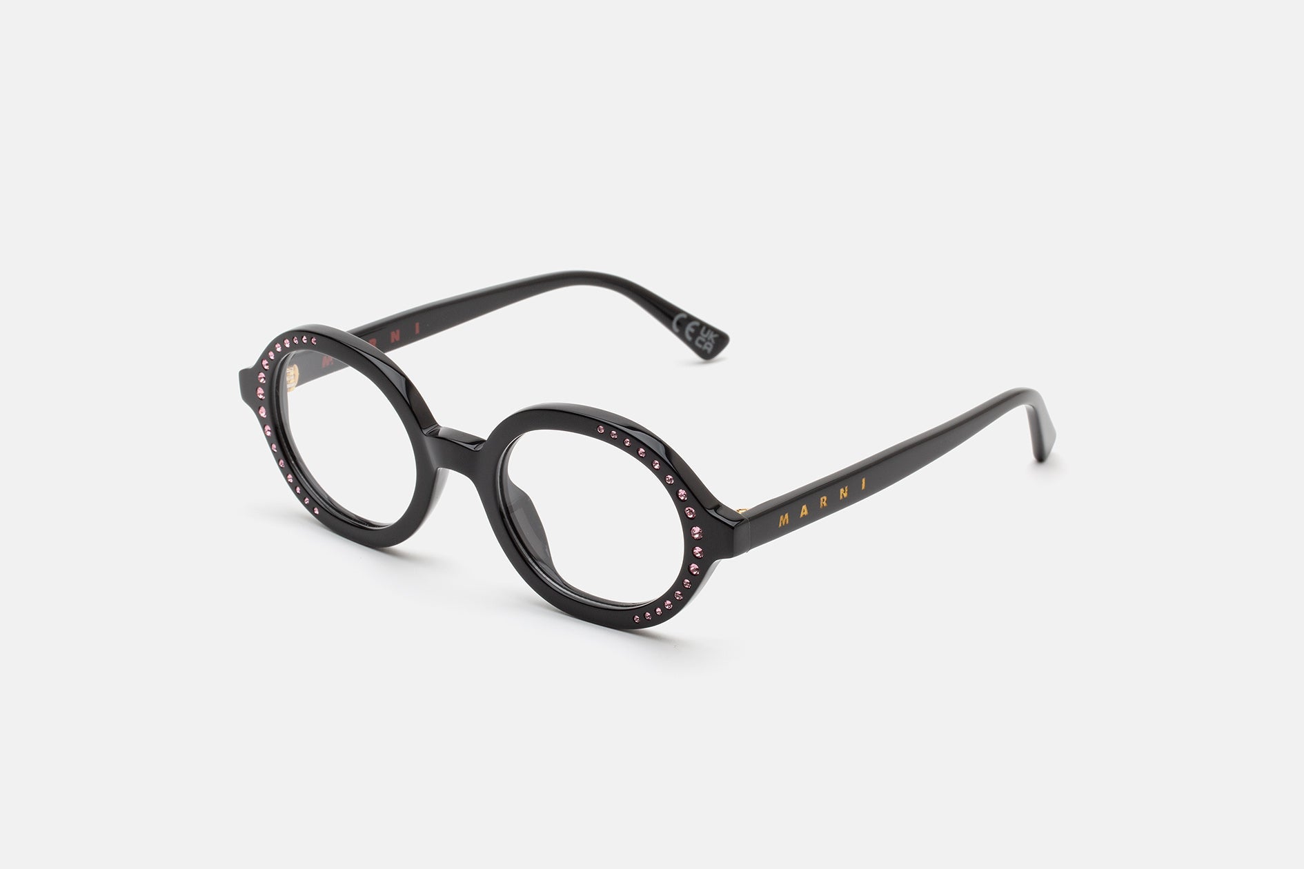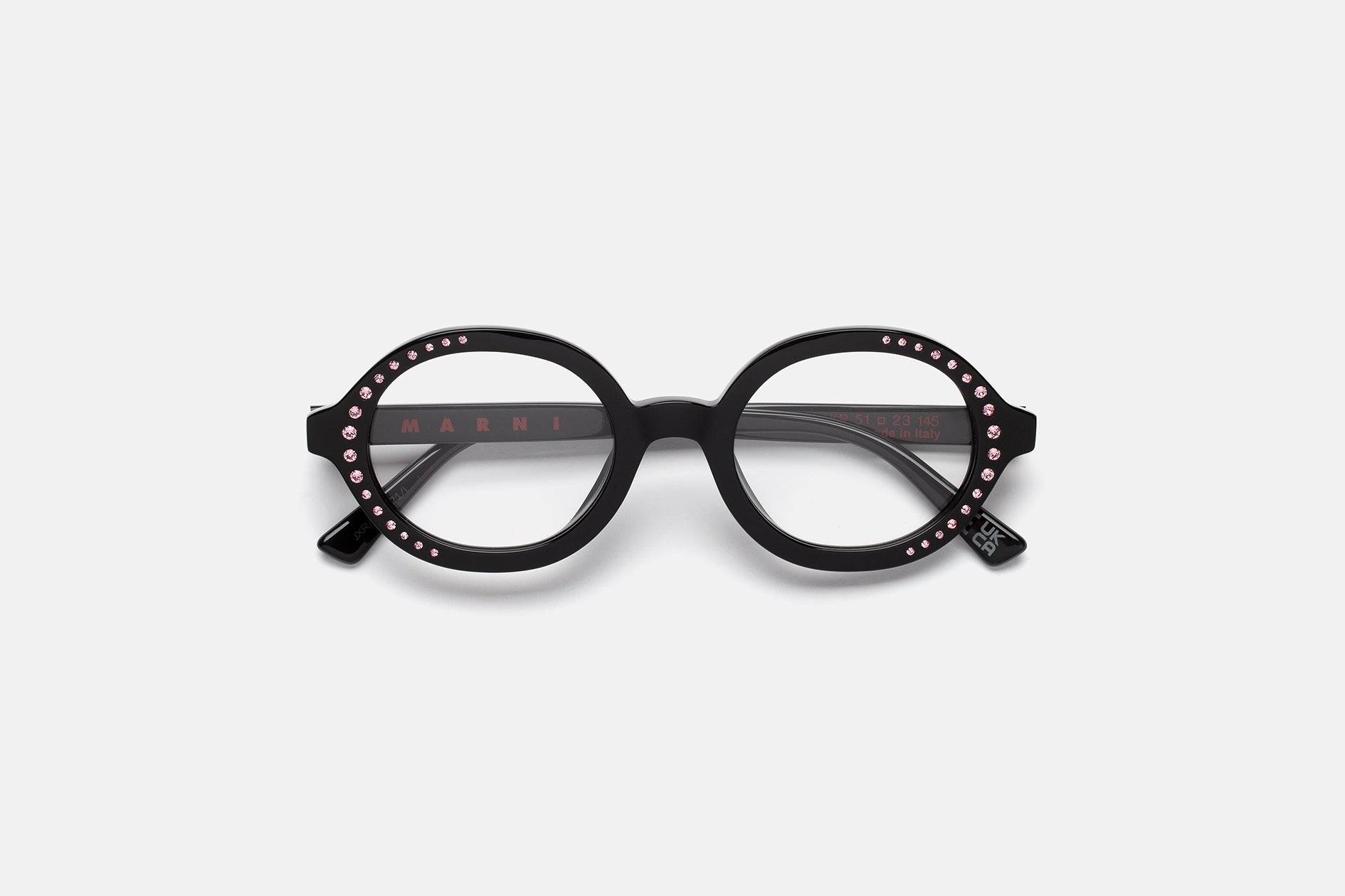 Designed exclusively for Marni, this Optical version of Nakagin Tower silhouette proposes a fresh and playful interpretation of timeless rounded shapes. The model’s geometric curves have been slightly flattened to form an ovaloid design, with sturdy rims featuring encased precious stones. This is a model that celebrates exceptional craftsmanship of the Made in Italy design. Nakagin Tower is available in a sleek black acetate.