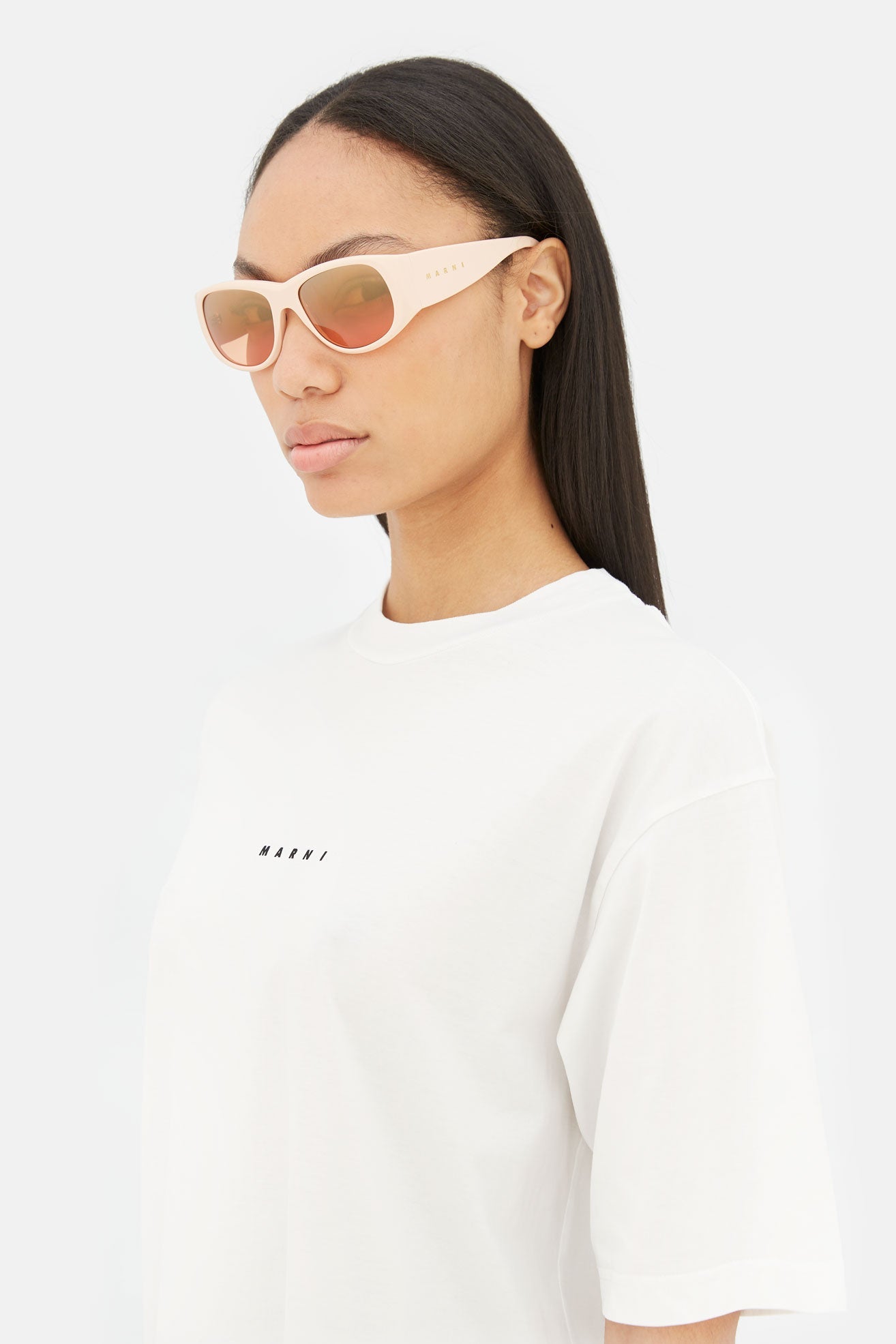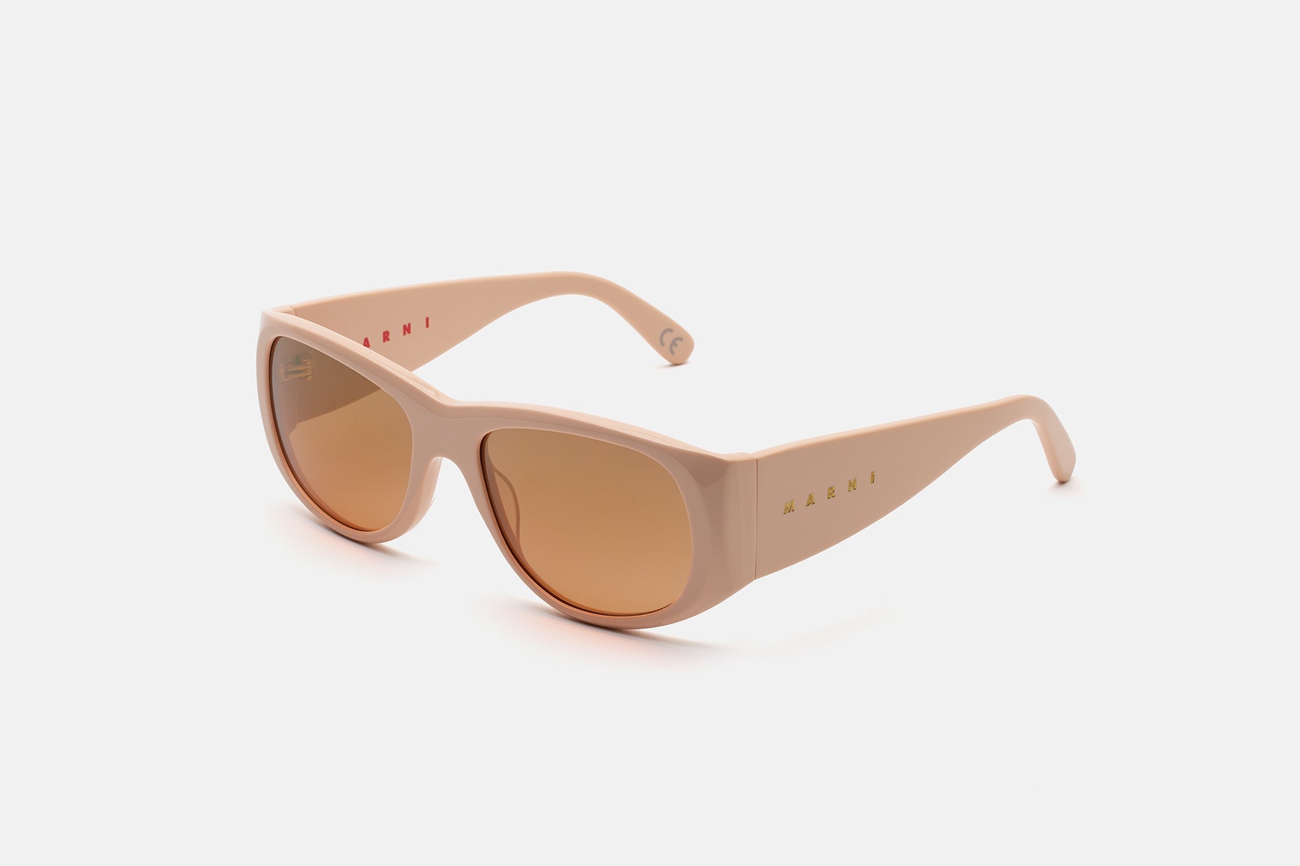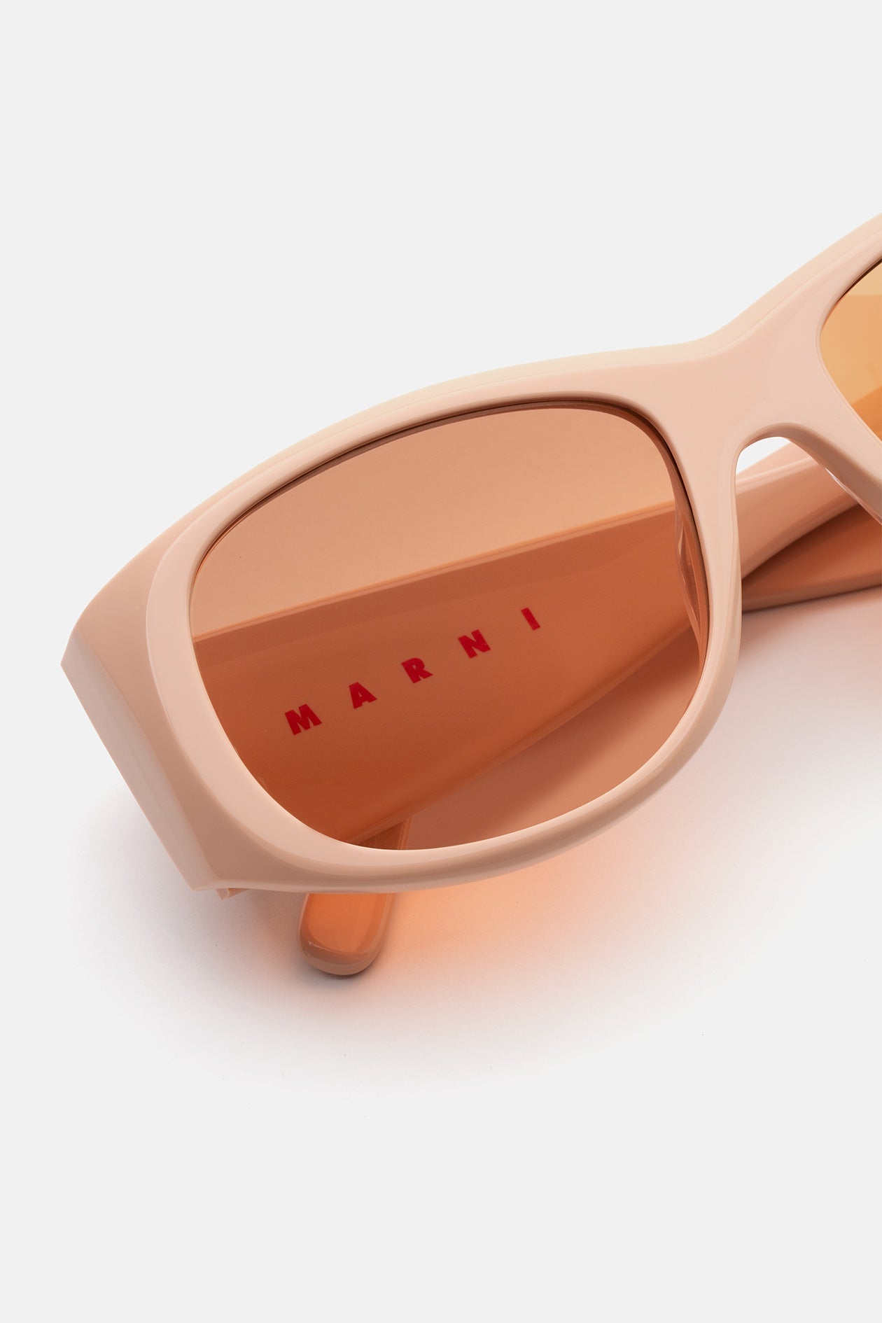 Designed exclusively for Marni, Orinoco River is an oversized shape that re-imagines 1990s grunge aesthetics for a fluid vision of contemporary style. The silhouette features a wide, horizontal geometry characterized by thick temples and broad rounded lenses. The upper line forms a distinctive V-shape, constructing a compact nose-bridge for a perfect fit. This model blends the boundaries between Marni’s eclectic style and an uncompromising modern aesthetics. This version comes with a light peach acetate and orange tinted lenses.